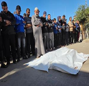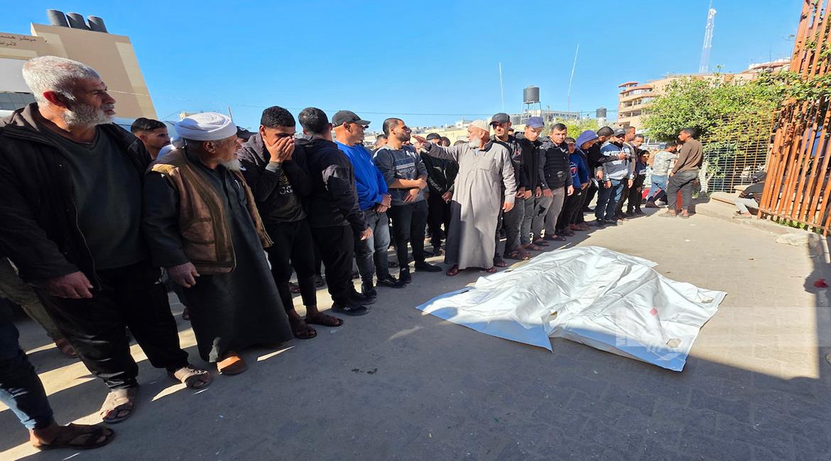 مواطنون خلال وداع جثامين ثلاثة شهداء في مستشفى الأقصى بمدينة دير البلح، ارتقوا جراء غارات جوية إسرائيلية استهدفت مخيم المغازي وسط قطاع غزة