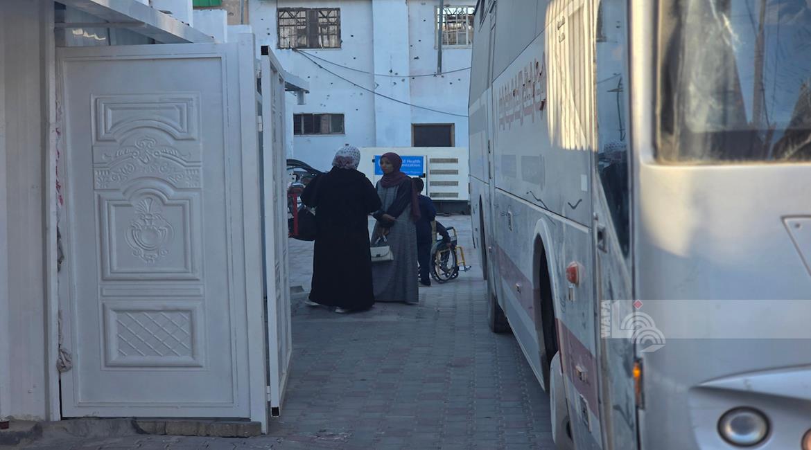 غزة - الدفعة الرابعة من مرضى قطاع غزة تغادر من مقر جمعية الهلال الأحمر الفلسطيني في مدينة خان يونس متوجهة إلى معبر رفح البري تمهيدا لسفرهم إلى خارج القطاع لتلقي العلاج