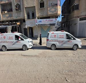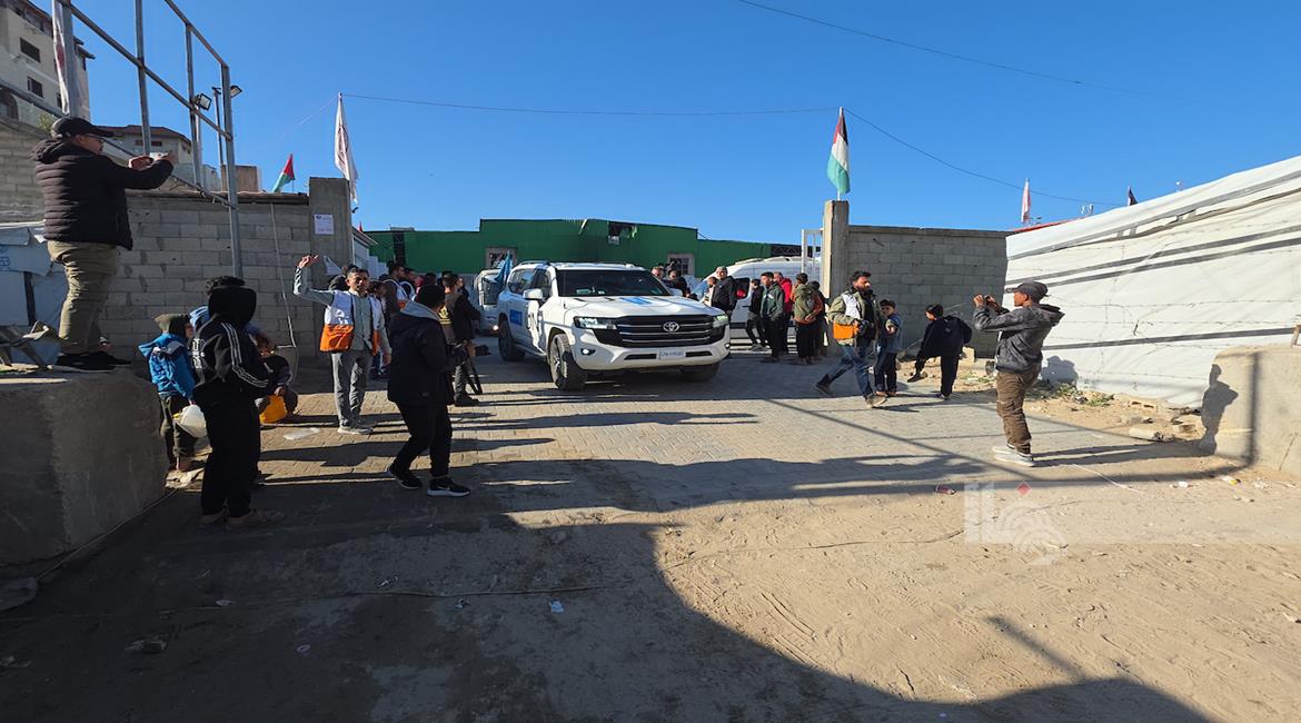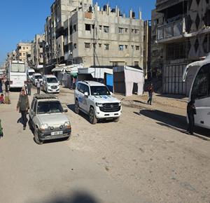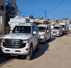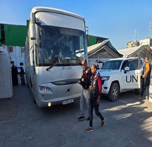 سيارات تابعة للأمم المتحدة تنقل جرحى فلسطينيين ومرافقيهم من خان يونس لمعبر رفح للعلاج خارج قطاع غزة