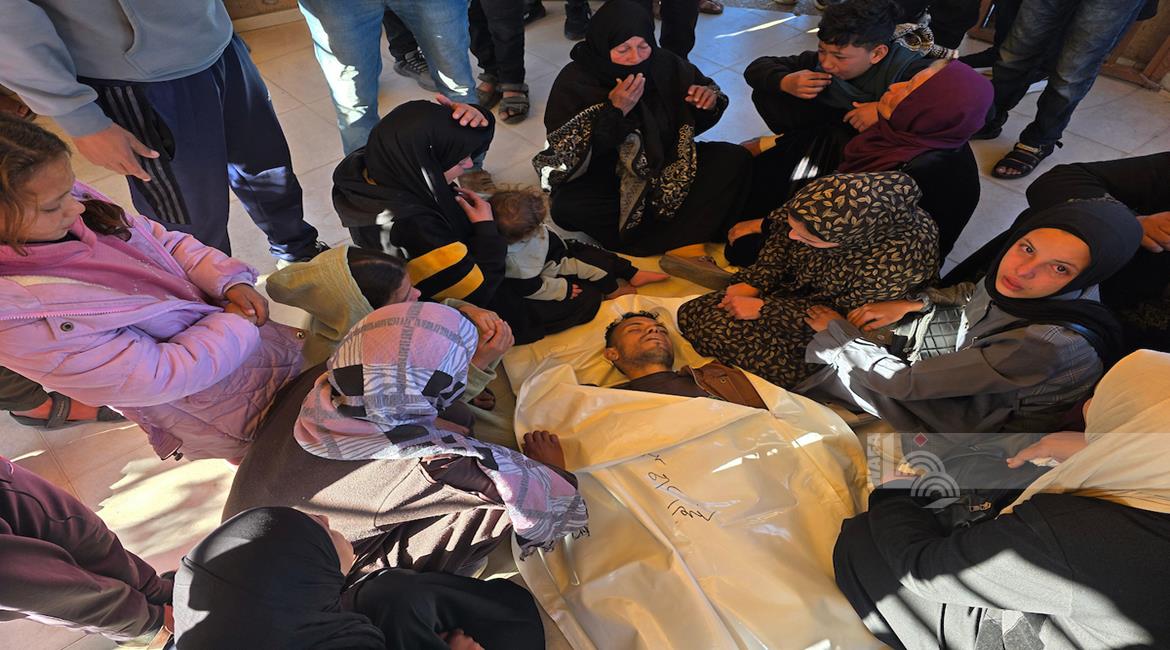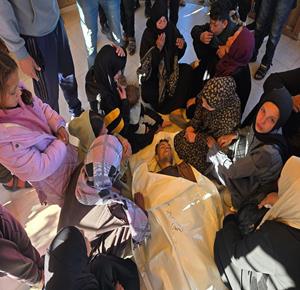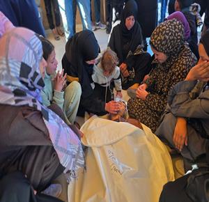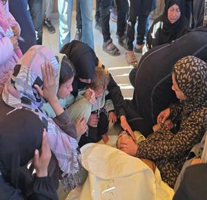 غزة - وداع جثمان الشهيد بهاء حماد الفجم (28 عاما) في مستشفى ناصر والذي استشهد برصاص جيش الاحتلال قرب خيمته شرق خان يونس جنوبي قطاع غزة