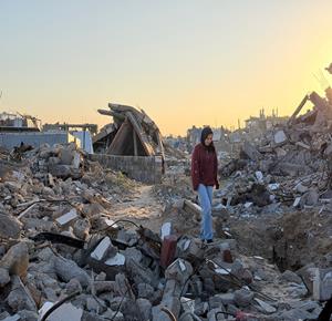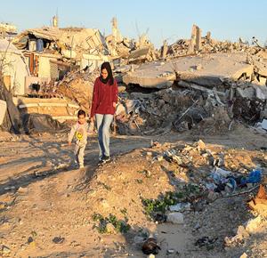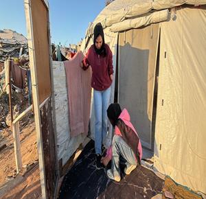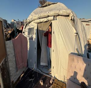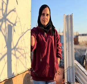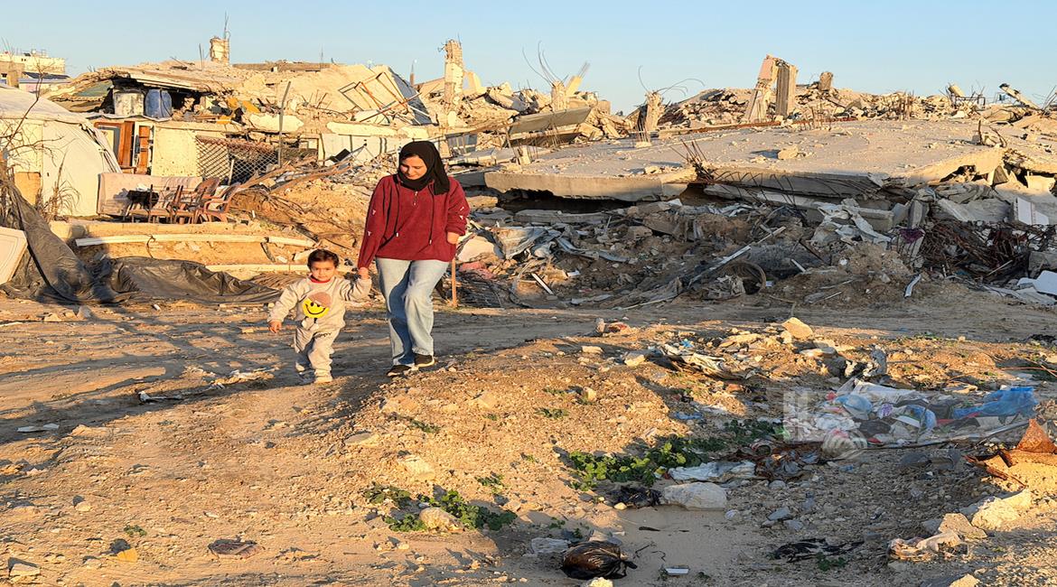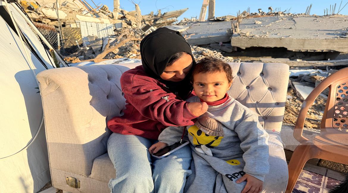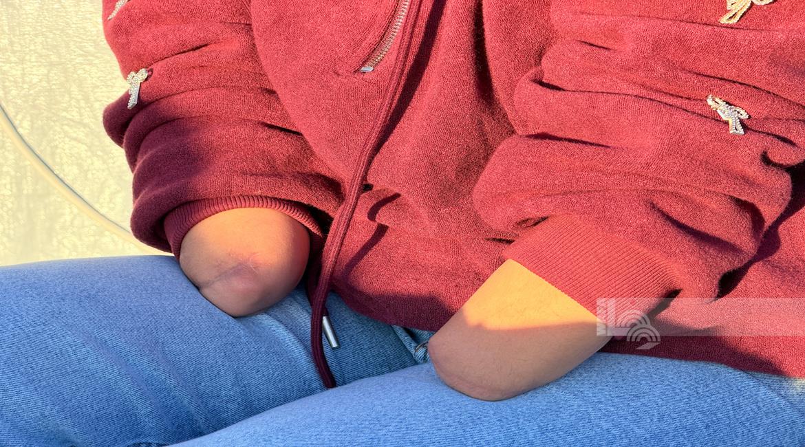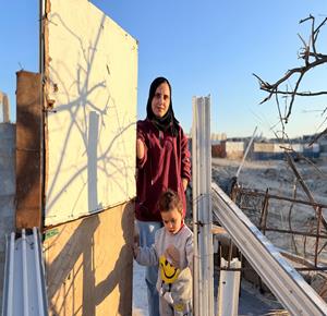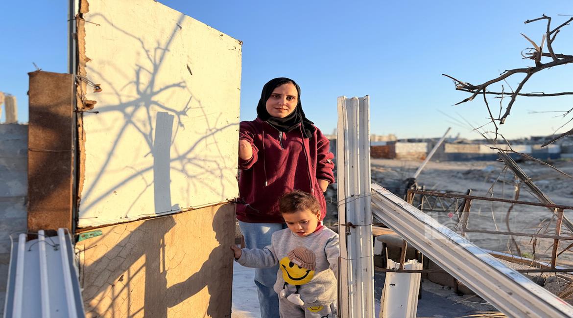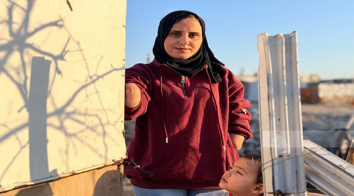 غزة - المواطنة نيبال الهسي (25 عامًا)، فقدت ذراعيها جراء قذيفة إسرائيلية خلال الحرب،تعيش مع ابنتها البالغة عامين في خيمة أُقيمت قرب أنقاض منزلها المدمر في جباليا شمال قطاع غزة