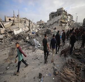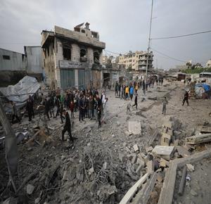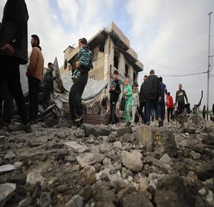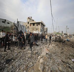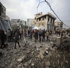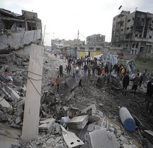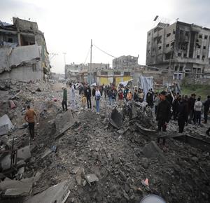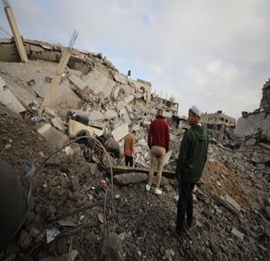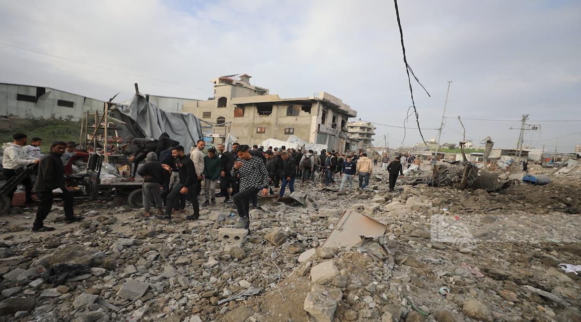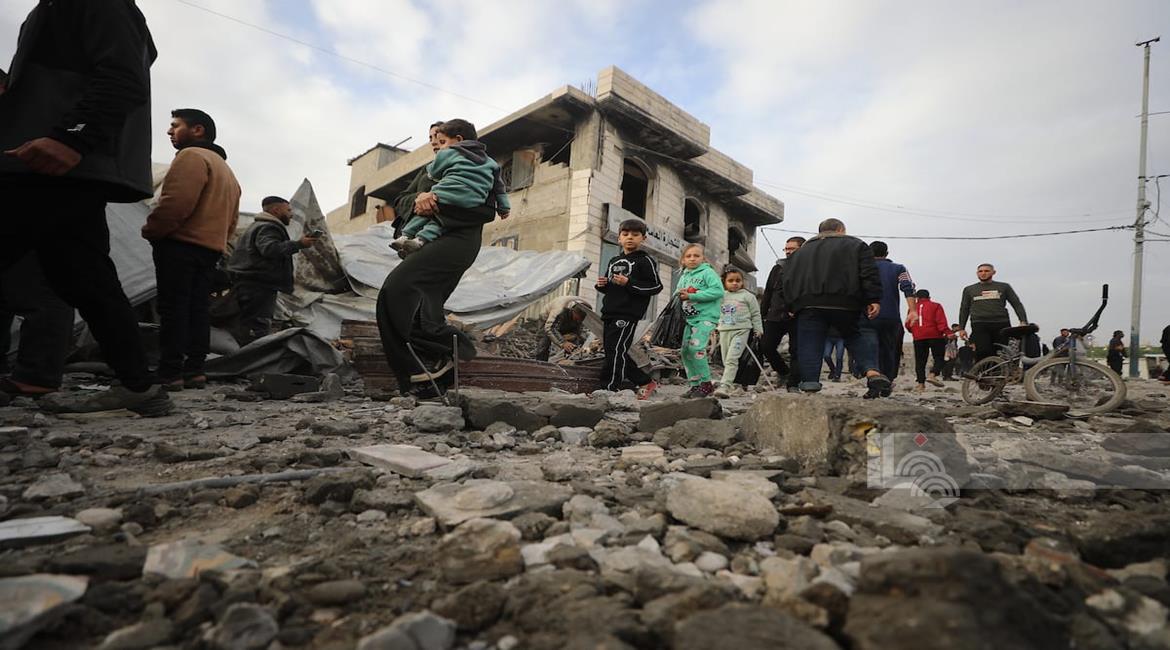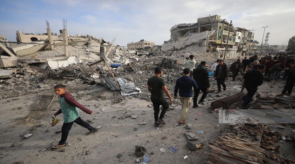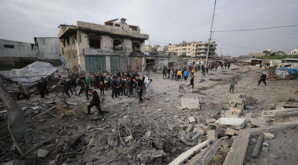 غزة - مواطنون يتفقدون الدمار جراء قصف الاحتلال مبنى سكني من ثلاثة طوابق في حي الزيتون بمدينة غزة