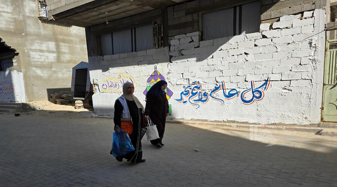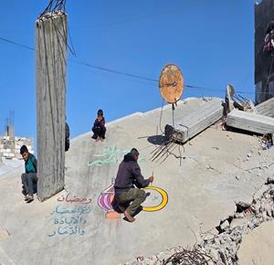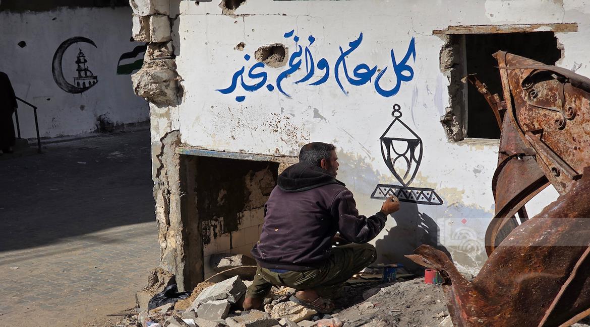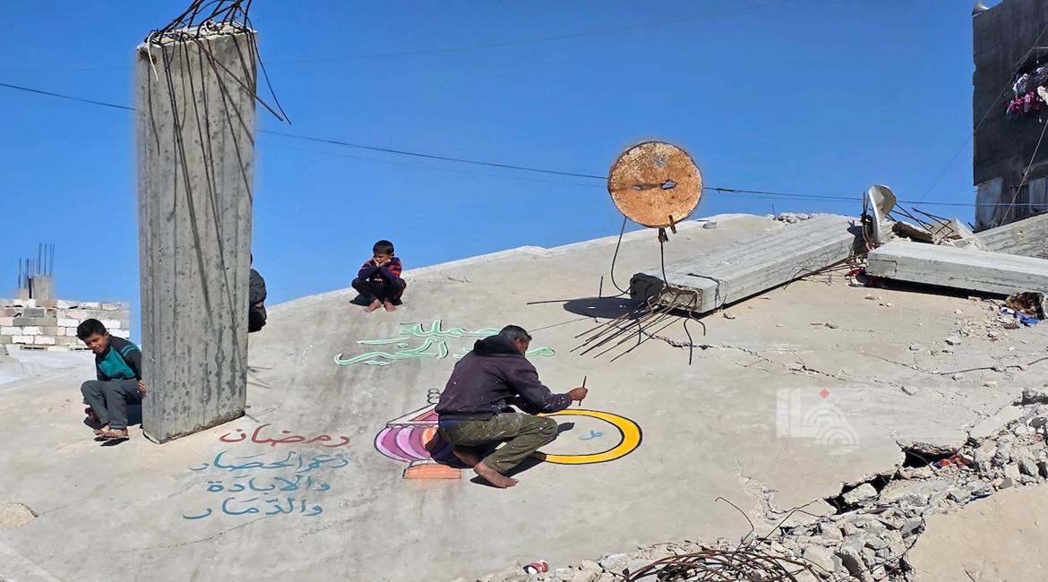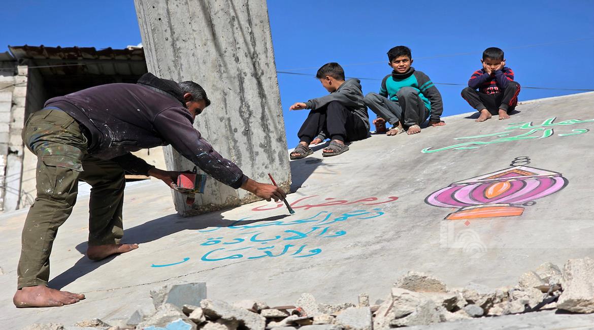 غزة - الفنان هاني دهمان يزين ما تبقى من الأحياء وركام المنازل المدمرة برسومات وعبارات ترحيبا بقرب حلول شهر رمضان في خان يونس
