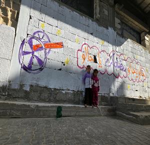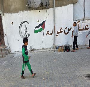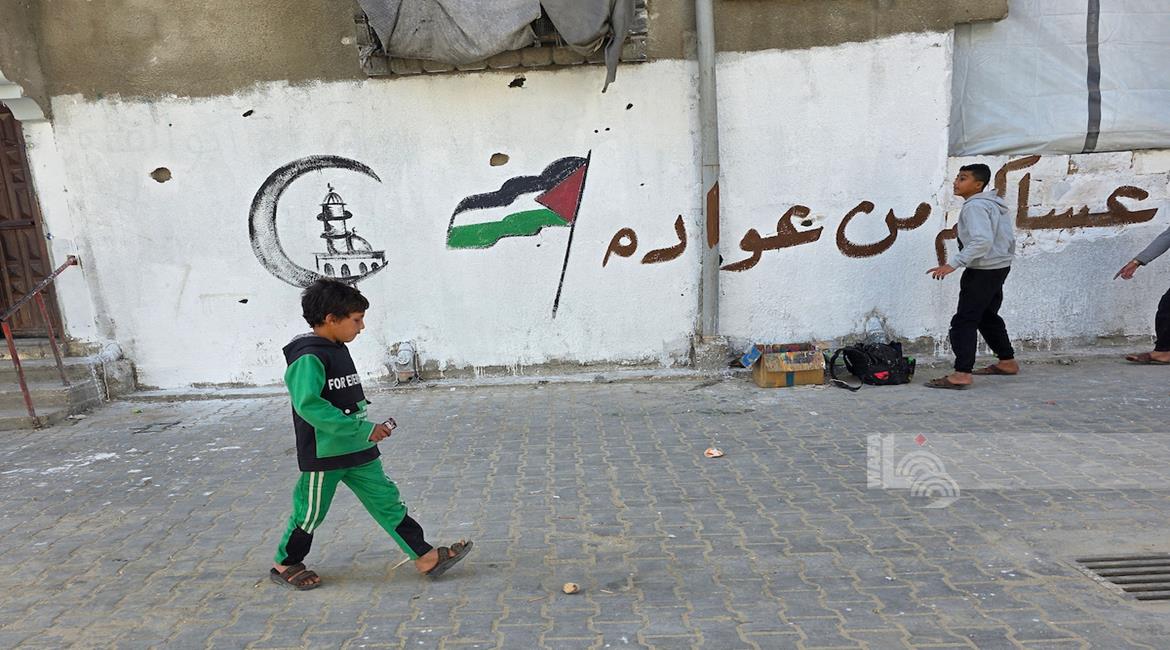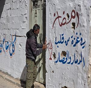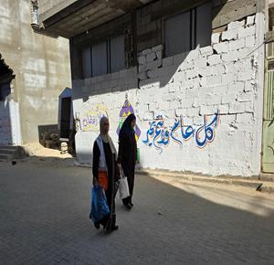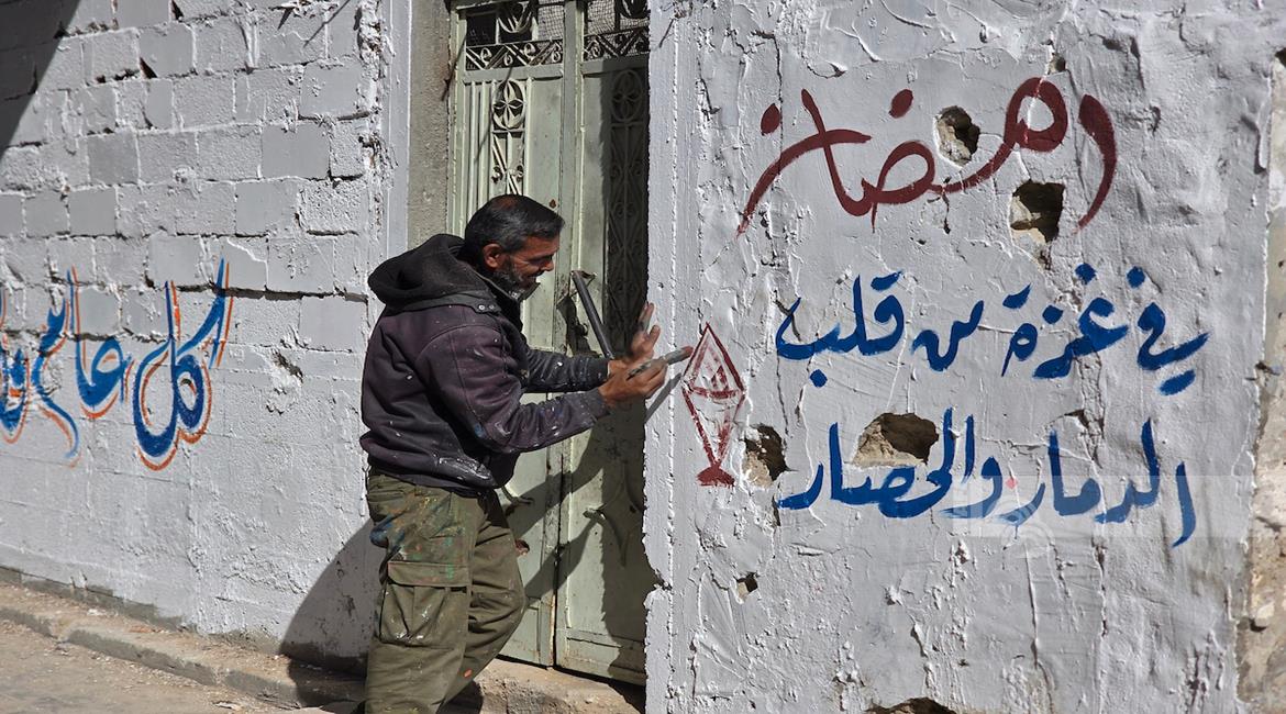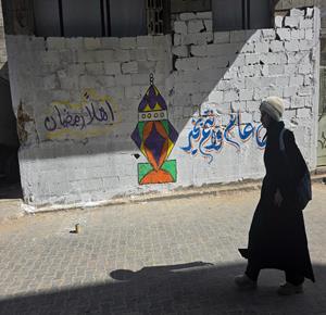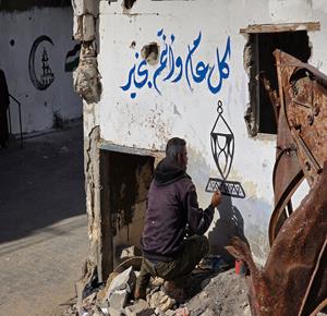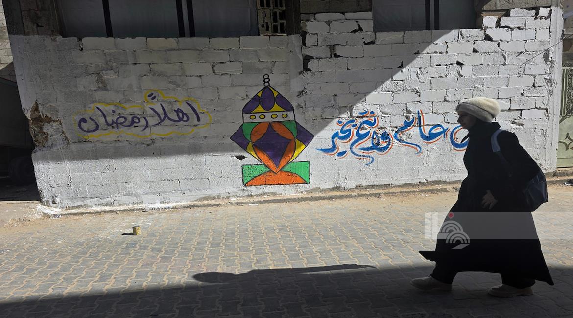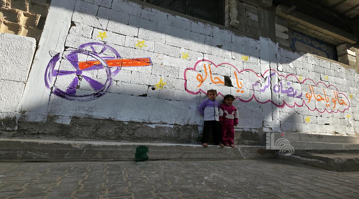 غزة - الفنان هاني دهمان يزين ما تبقى من الأحياء وركام المنازل المدمرة برسومات وعبارات ترحيبا بقرب حلول شهر رمضان في خان يونس
