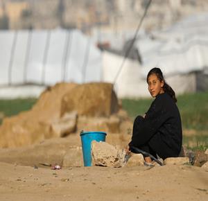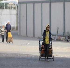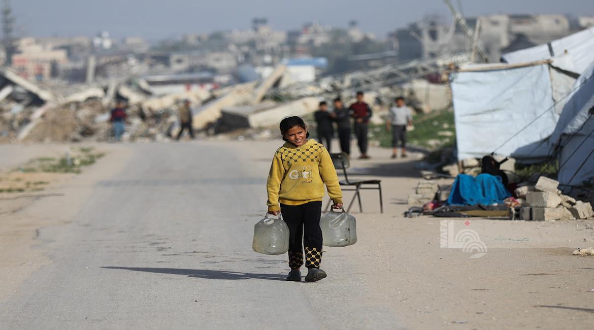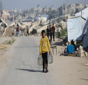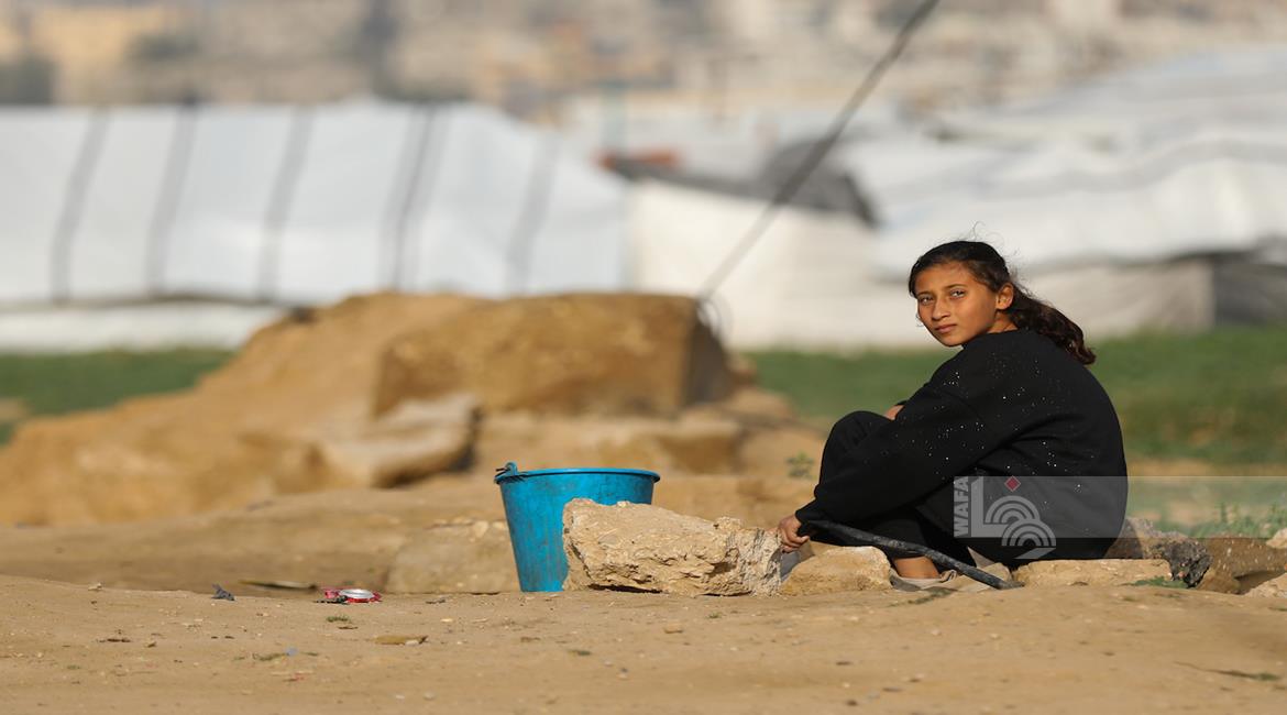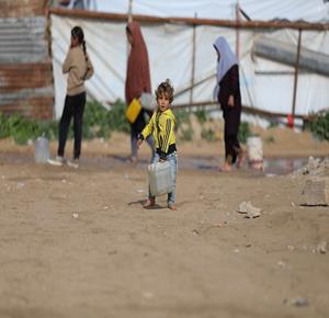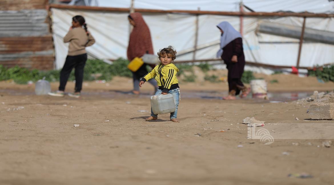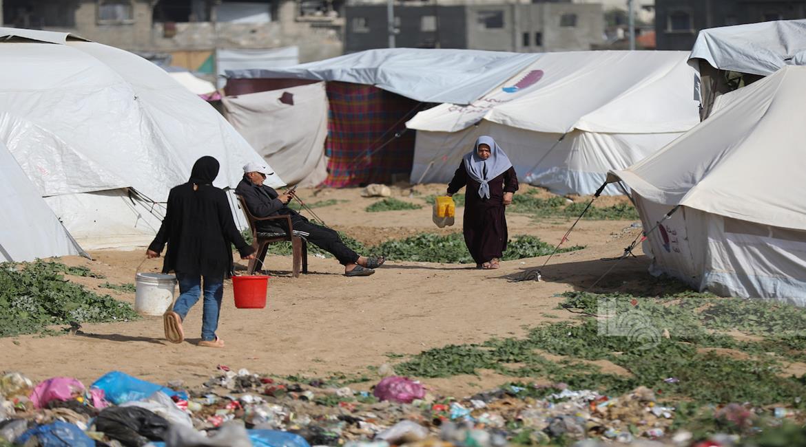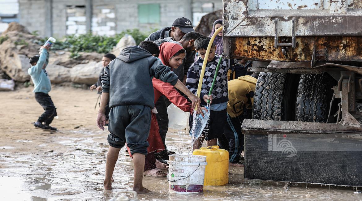 غزة - نازحون في منطقة المغازي وسط قطاع غزة، يحاولون تأمين مياه الشرب من صهاريج المياه، في ظل ظروف قاسية تفتقد أبسط ضروريات الحياة من مأوى وغذاء وماء نظيف