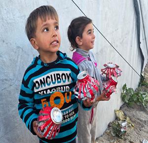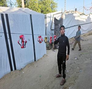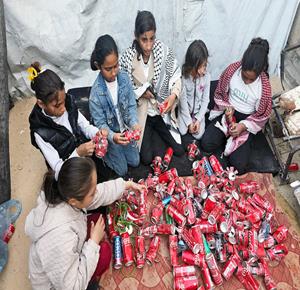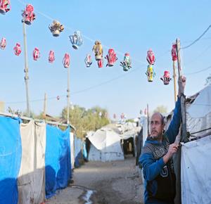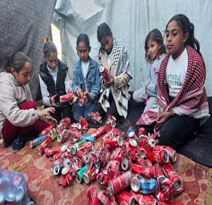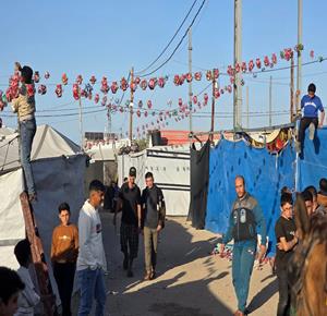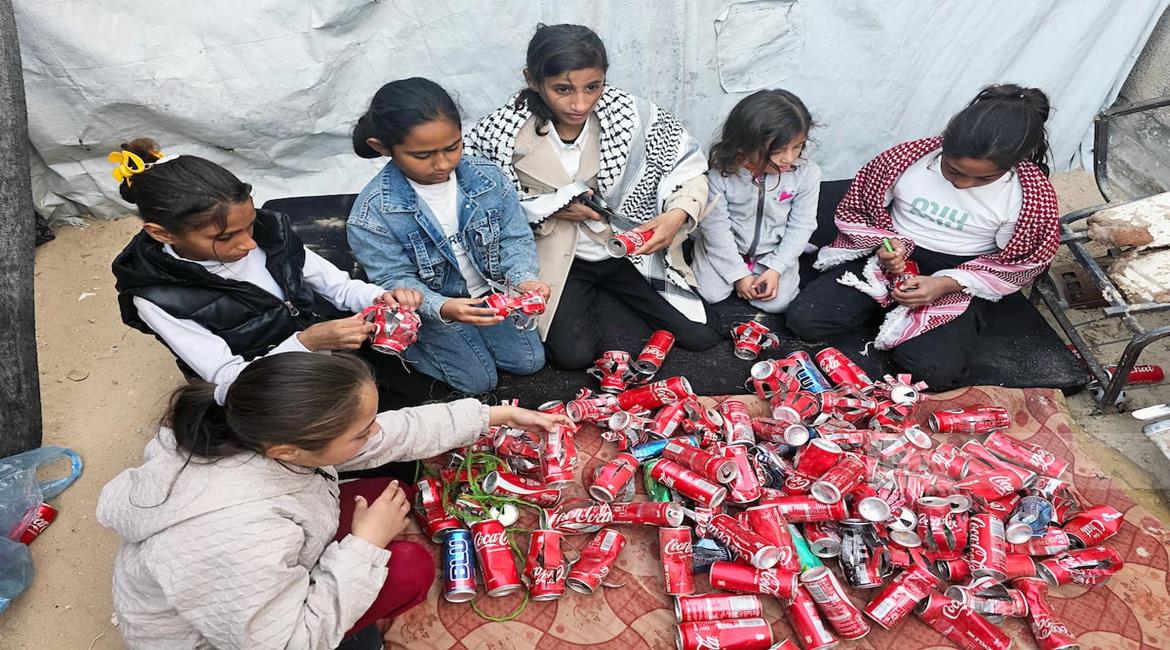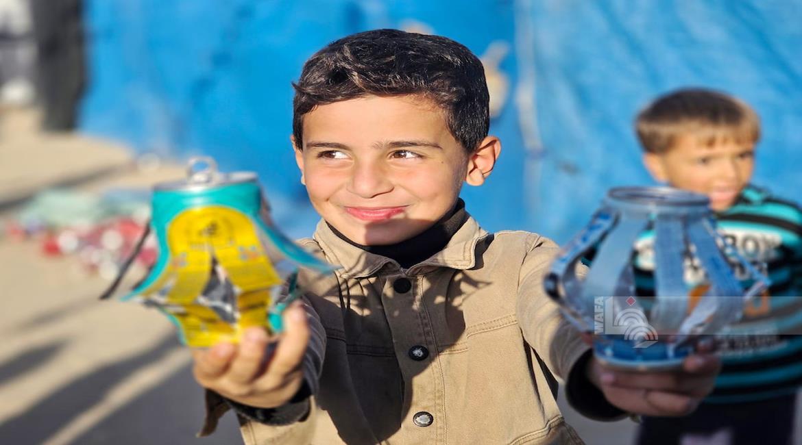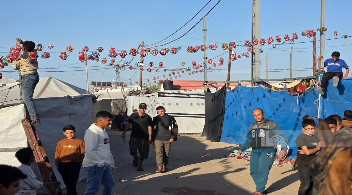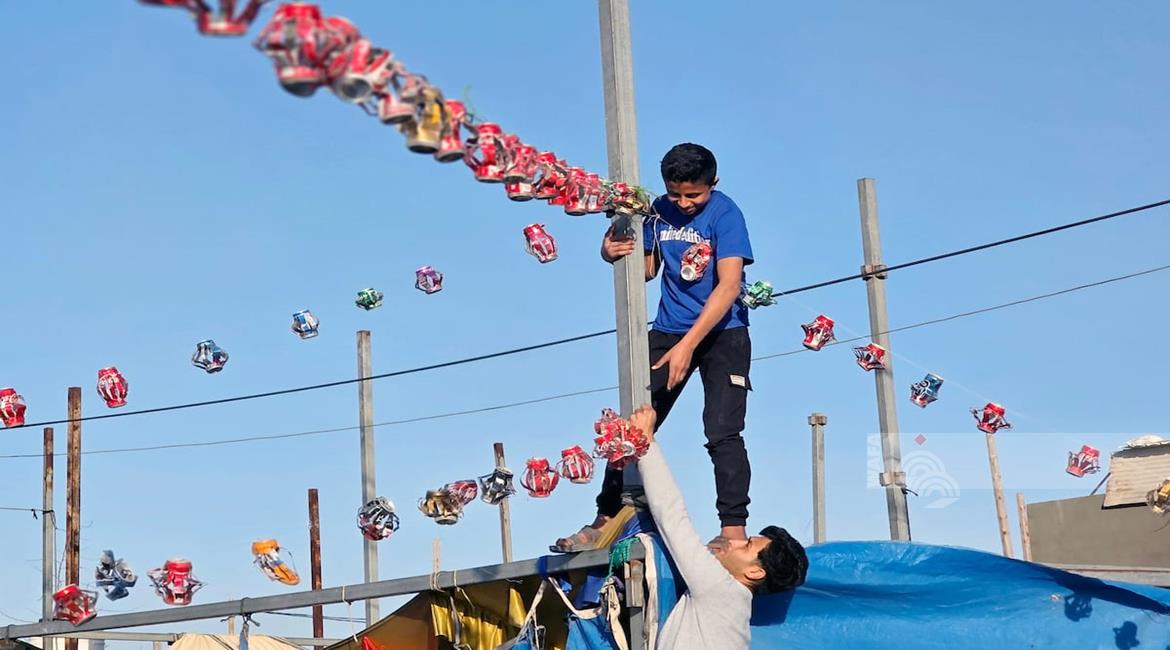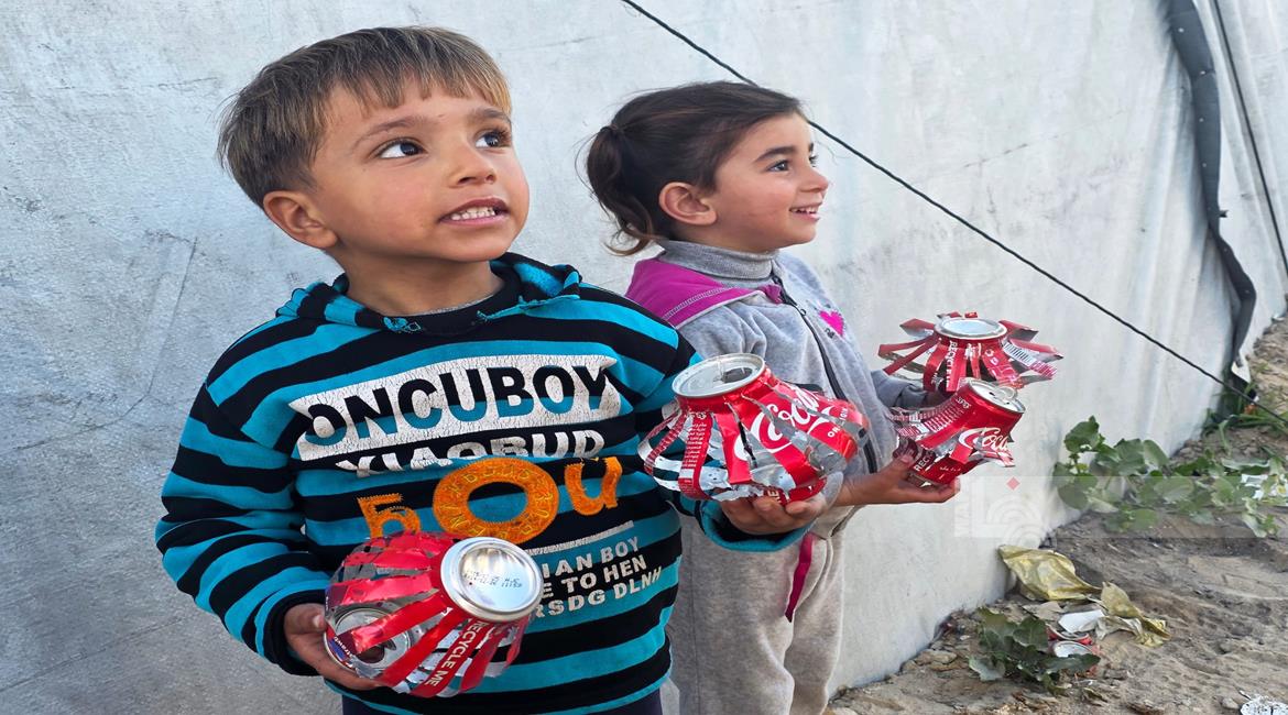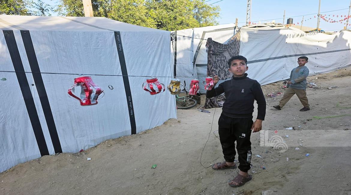 غزة - أطفال نازحون يزينون الخيام بعبوات مشروبات فارغة في خان يونس جنوب قطاع غزة استعداداً لقدوم شهر رمضان