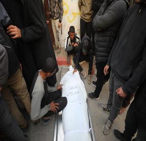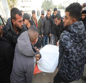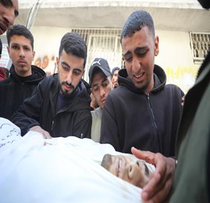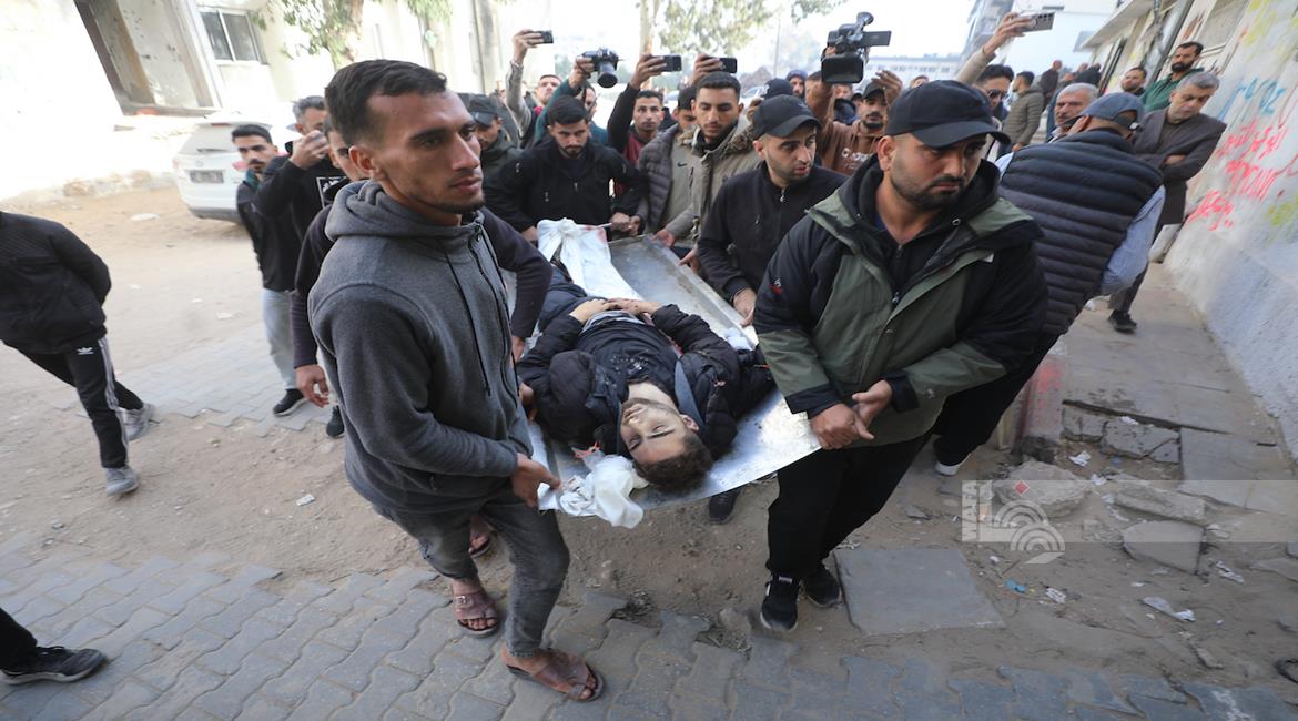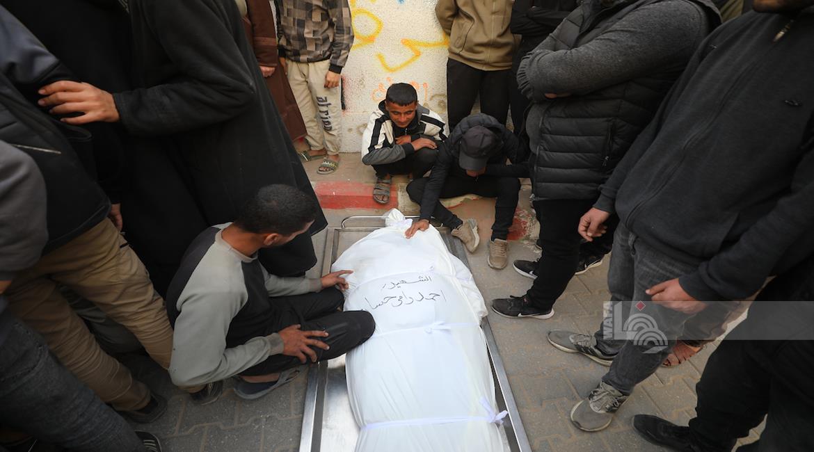 وداع وتشييع خمسة شهداء في مستشفى ناصر بمدينة خان يونس ارتقوا جراء القصف الاسرائيلي على المدينة