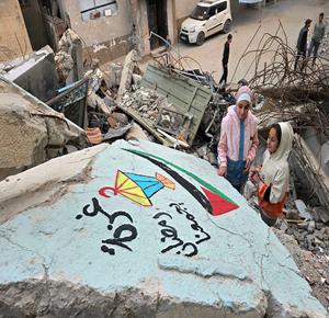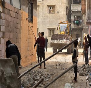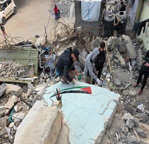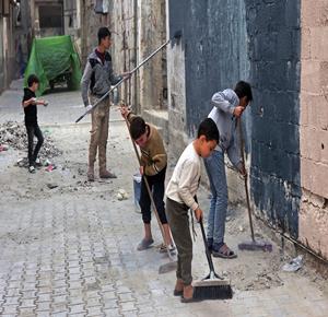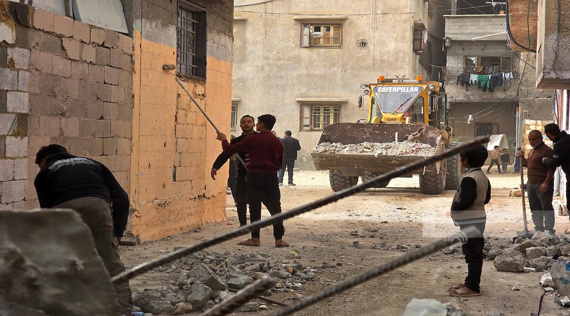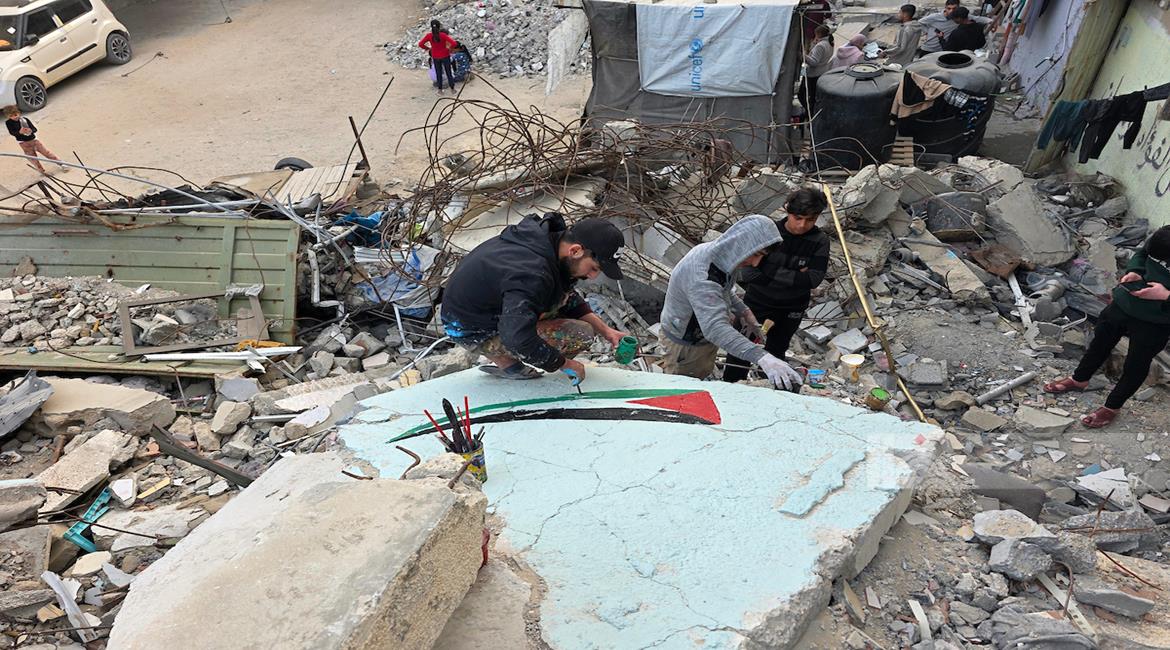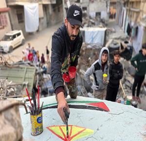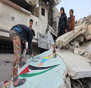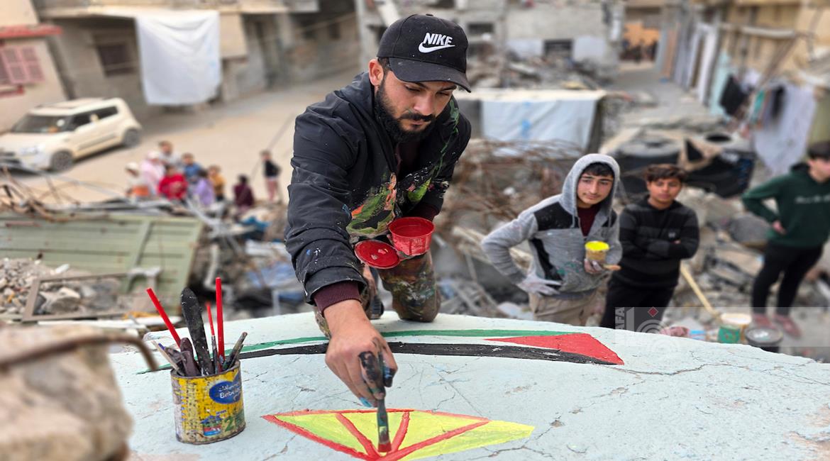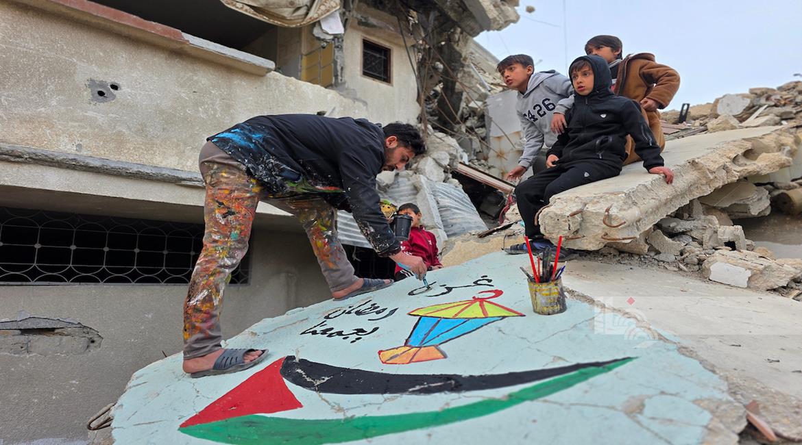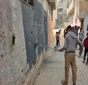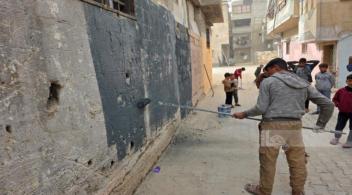 غزة - متطوعون من الأهالي بينهم أطفال يقومون بتنظيف وتزيين أحد أحياء خان يونس رغم الدمار الذي خلّفه العدوان على غزة