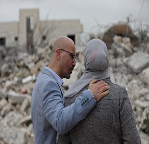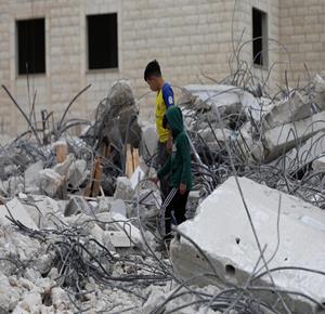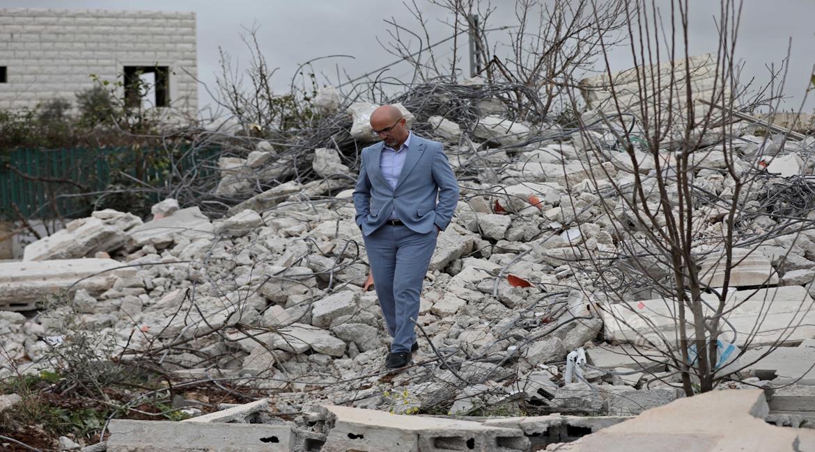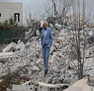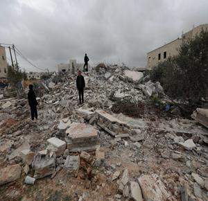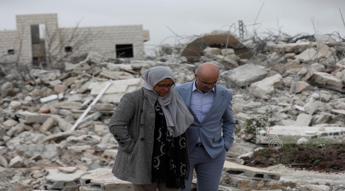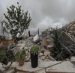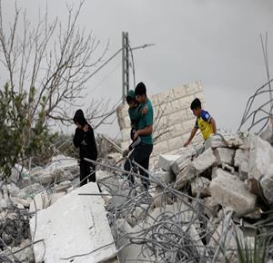 نابلس - عائلة ياسر الصابر تقف فوق أنقاض منزلها بعد ان هدمته جرافات الاحتلال اليوم في منطقة التعاون العلوي بمدينة نابلس