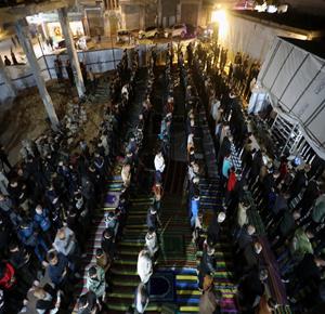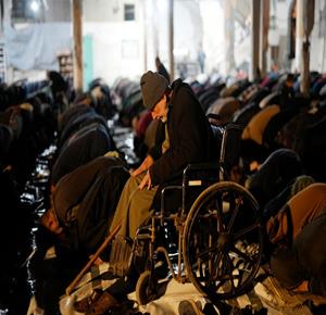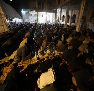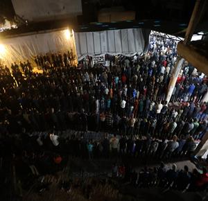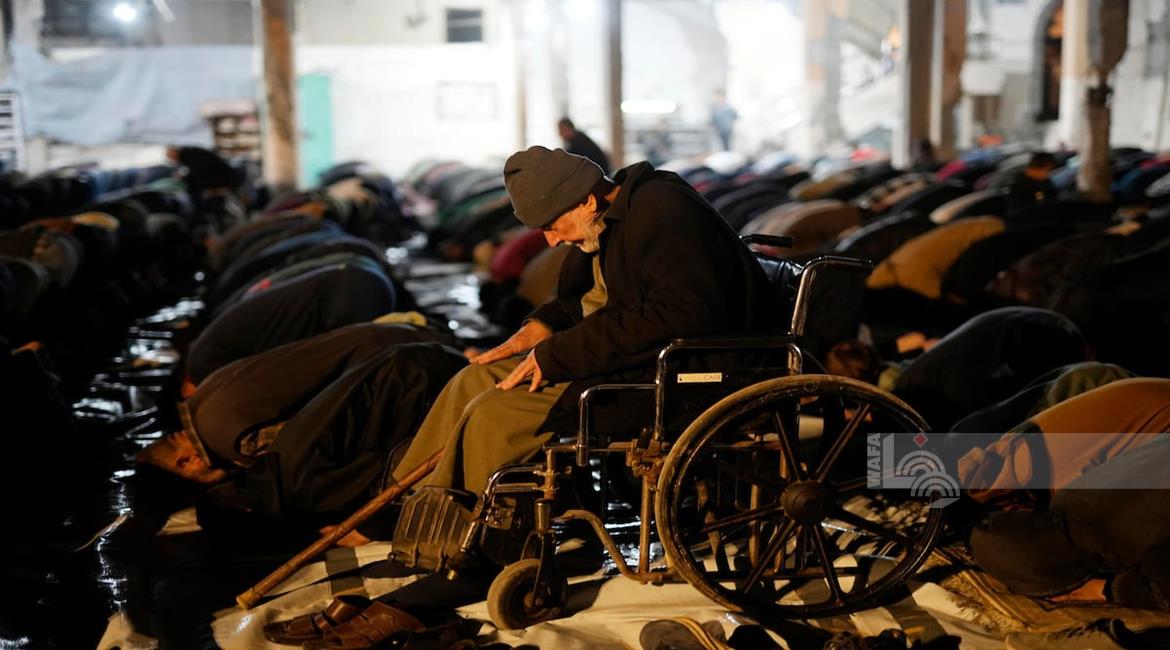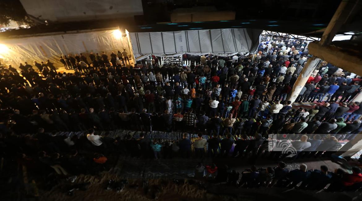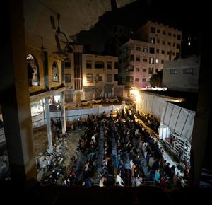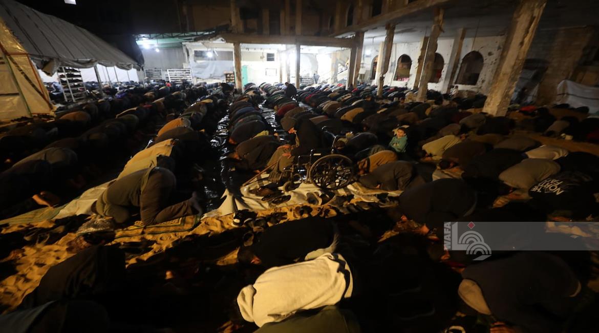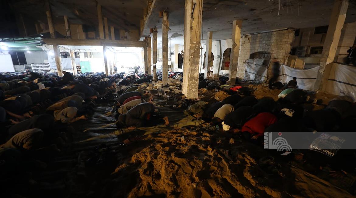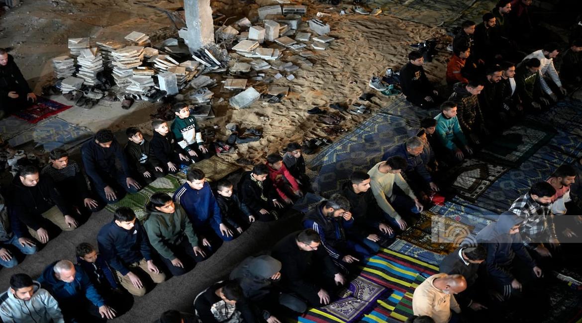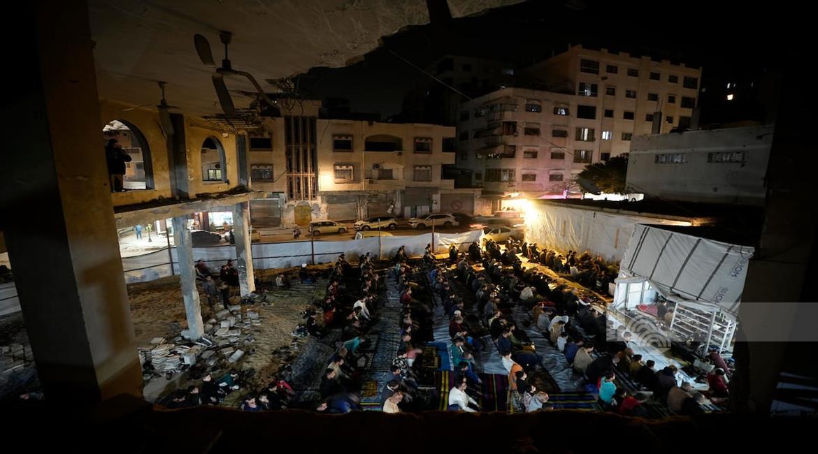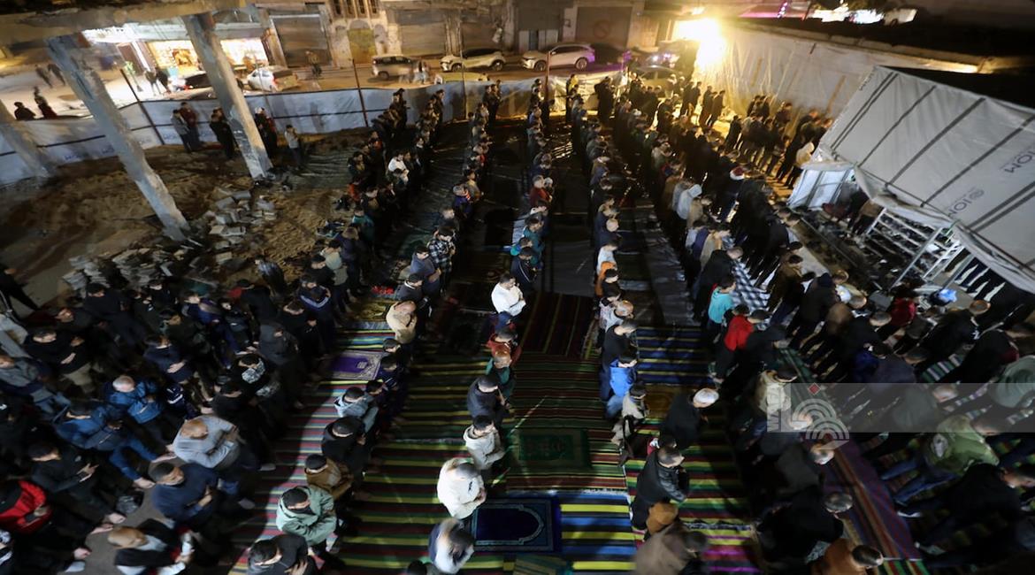 غزة - مواطنون يؤدون صلاة التراويح في الليلة الأولى من شهر رمضان على أنقاض مسجد الكنز المدمر في مدينة غزة