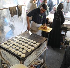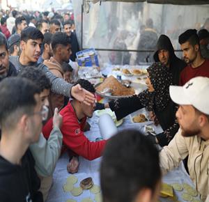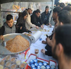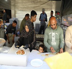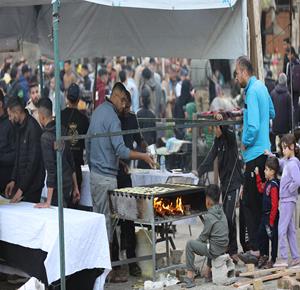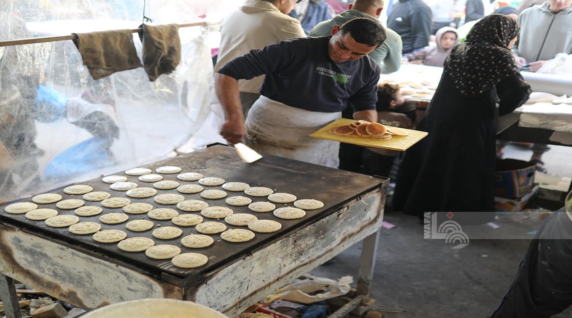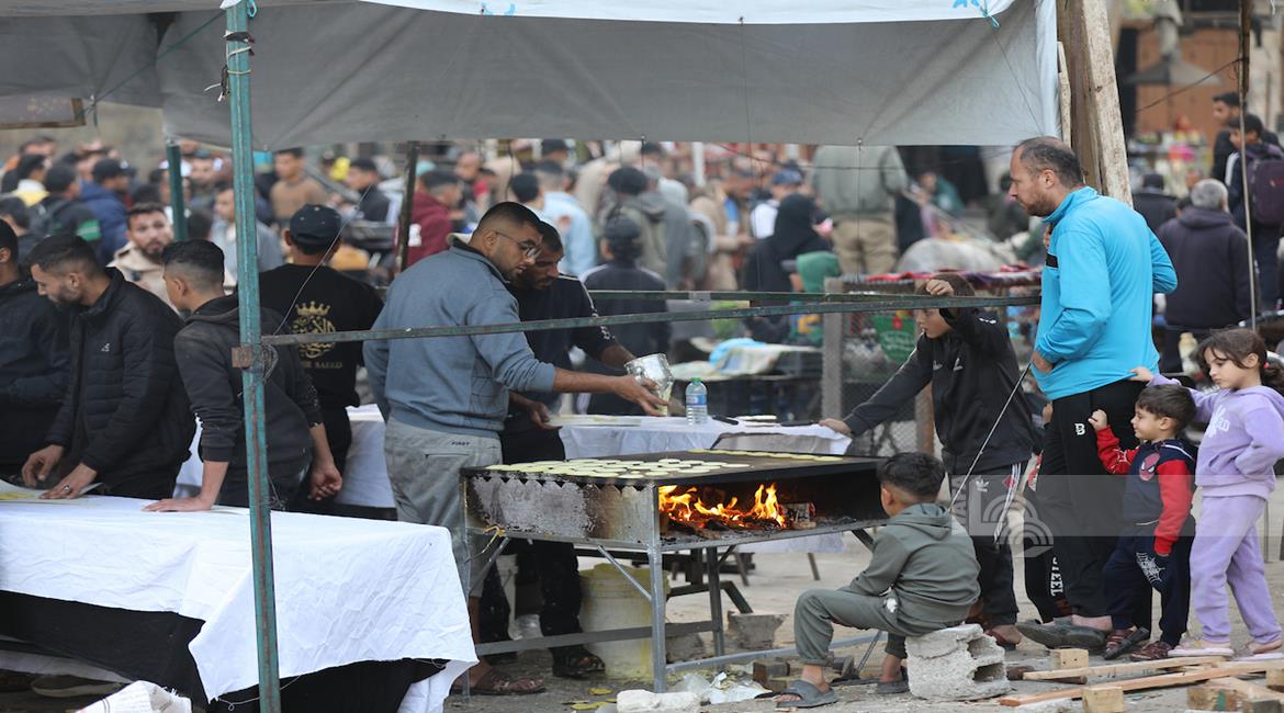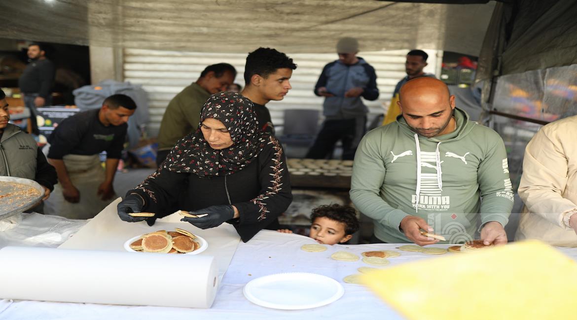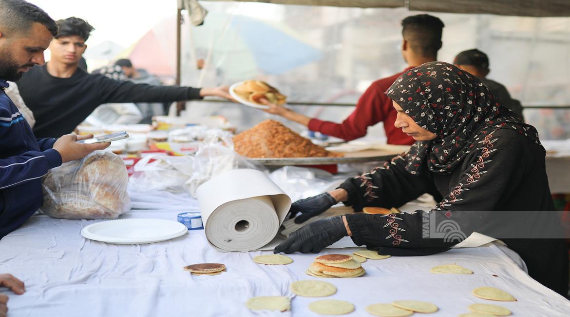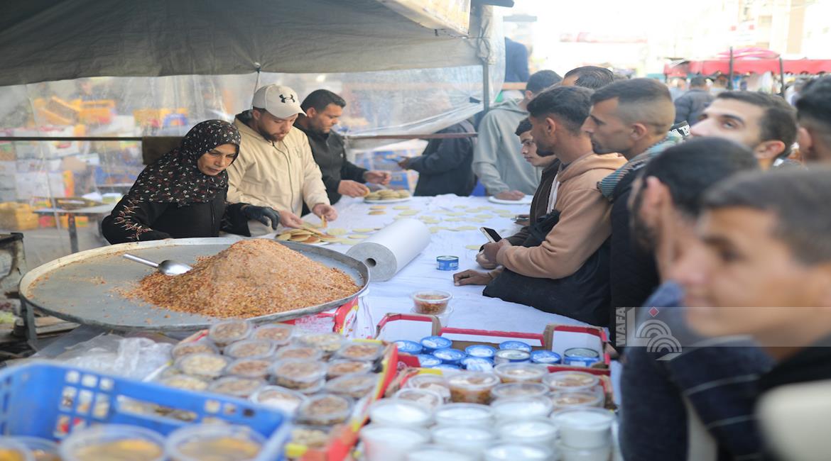 غزة - آلاء كريم (47 عاما)، نازحة في مخيم النصيرات، تفتتح كشكًا لبيع القطايف في السوق خلال رمضان، سعيًا لمواجهة قسوة الظروف وإعالة أسرتها بعد فقدان منزلها.