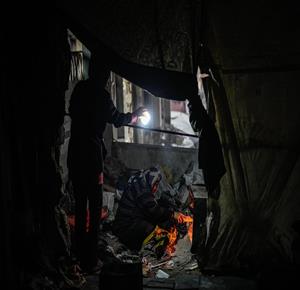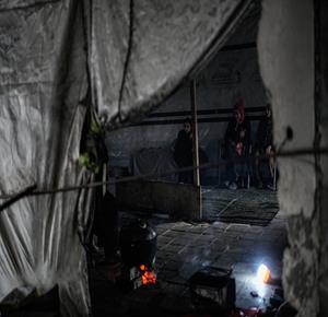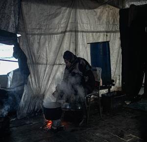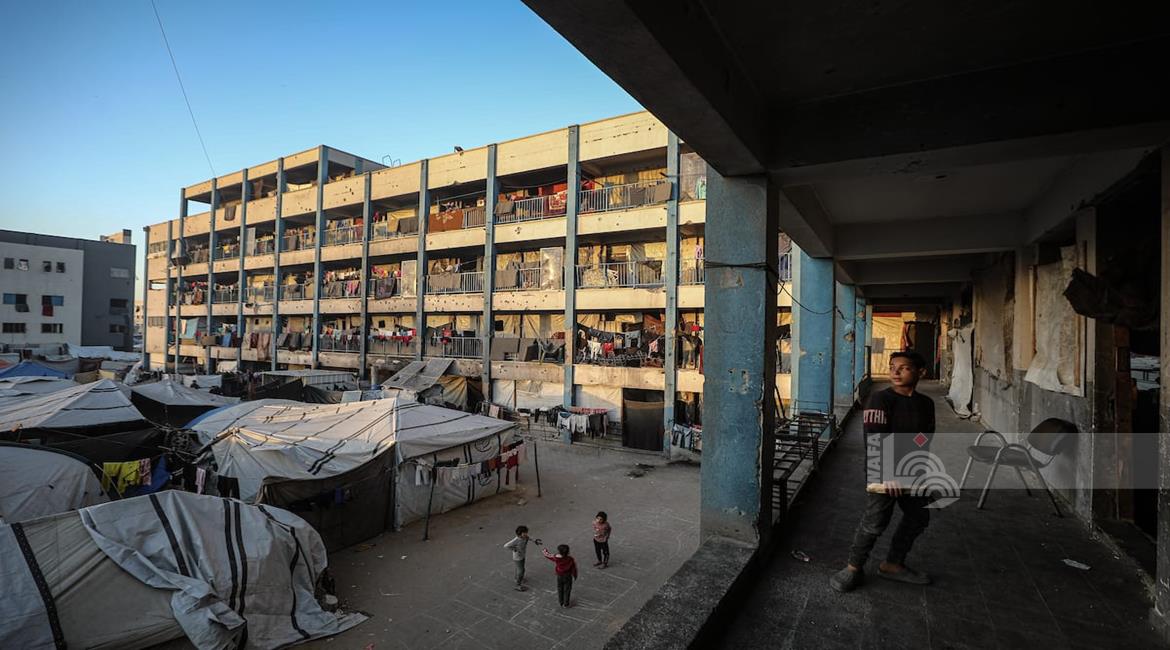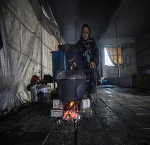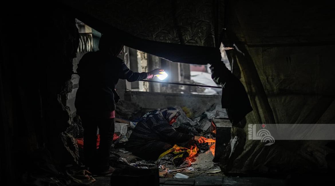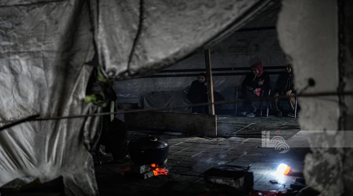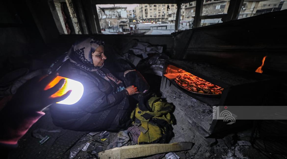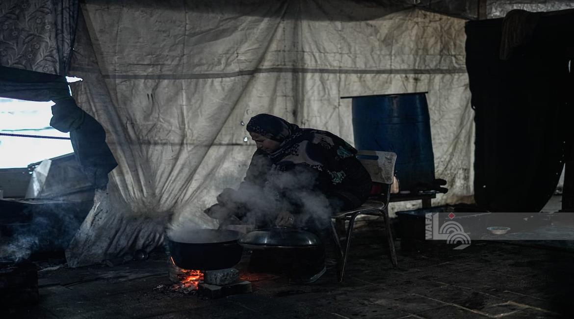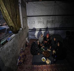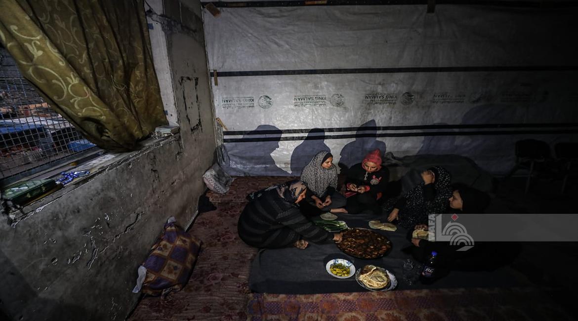 غزة - النازحة أم صقر حمد خلال إفطارها مع أطفالها في مكان نزوحها داخل أحد مراكز الإيواء التابعة للأونروا في مدينة غزة، في ظل أوضاع إنسانية صعبة يعيشها النازحون مع حلول شهر رمضان