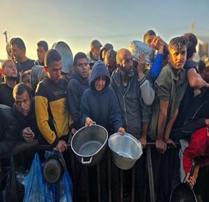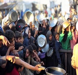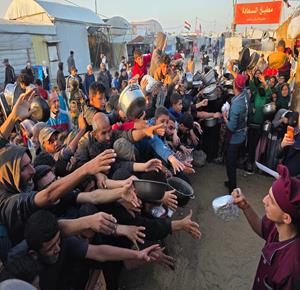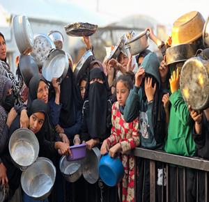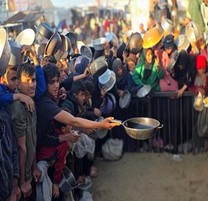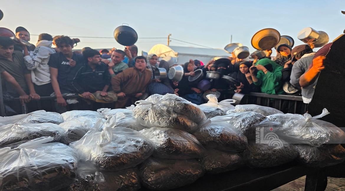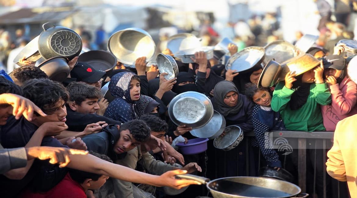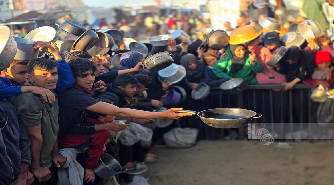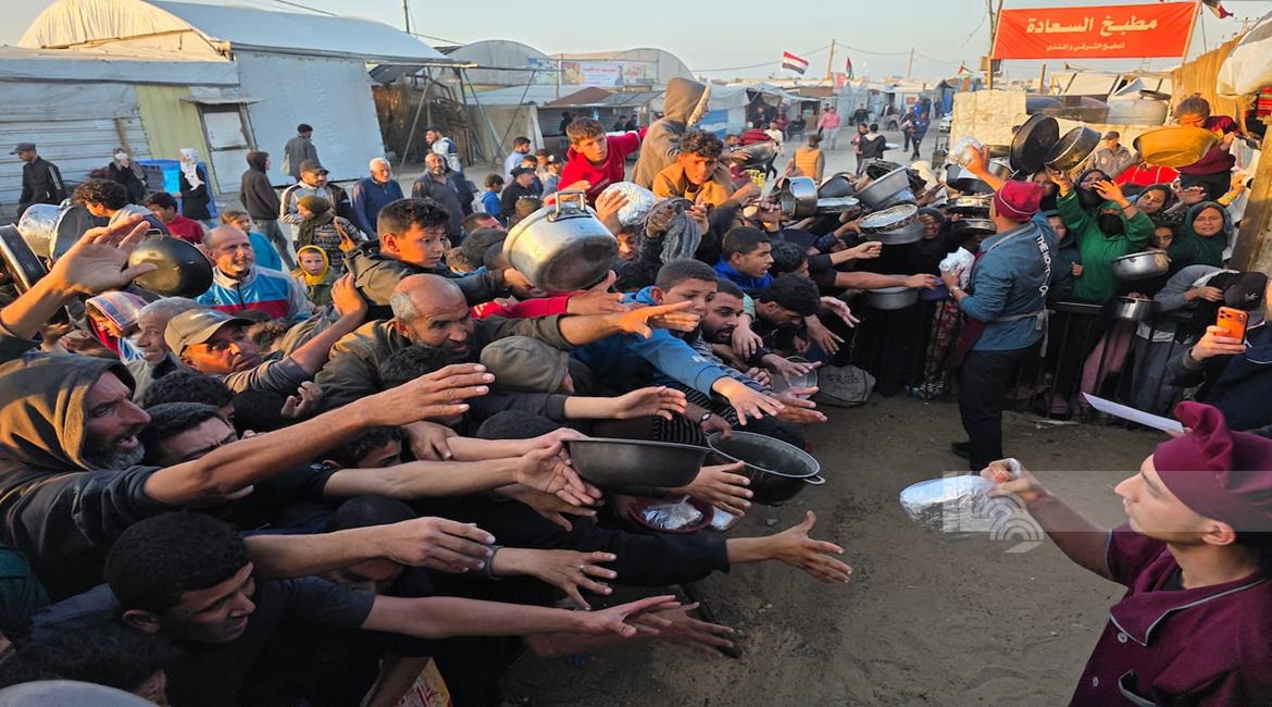 غزة - نازحون يتزاحمون للحصول على طعام مجاني من مطبخ خيري في اليوم الرابع من شهر رمضان المبارك في مواصي خان يونس جنوب قطاع غزة