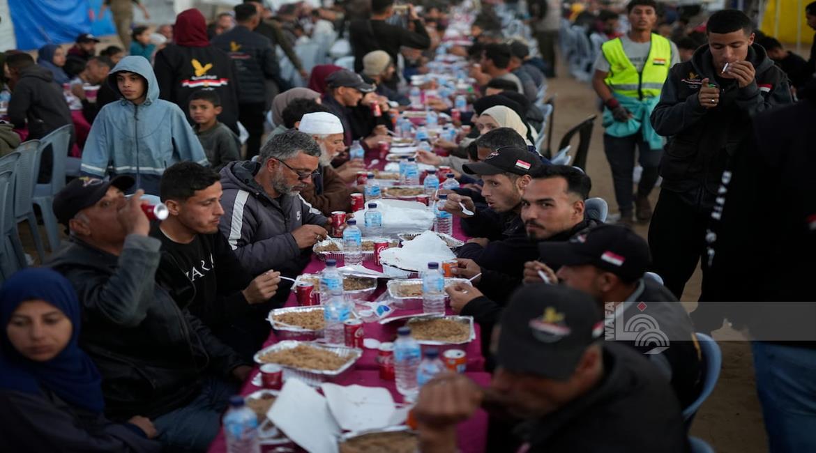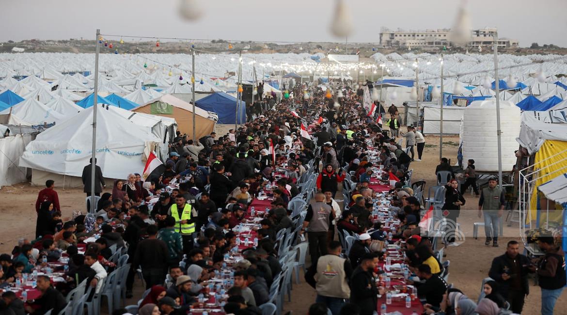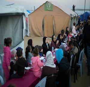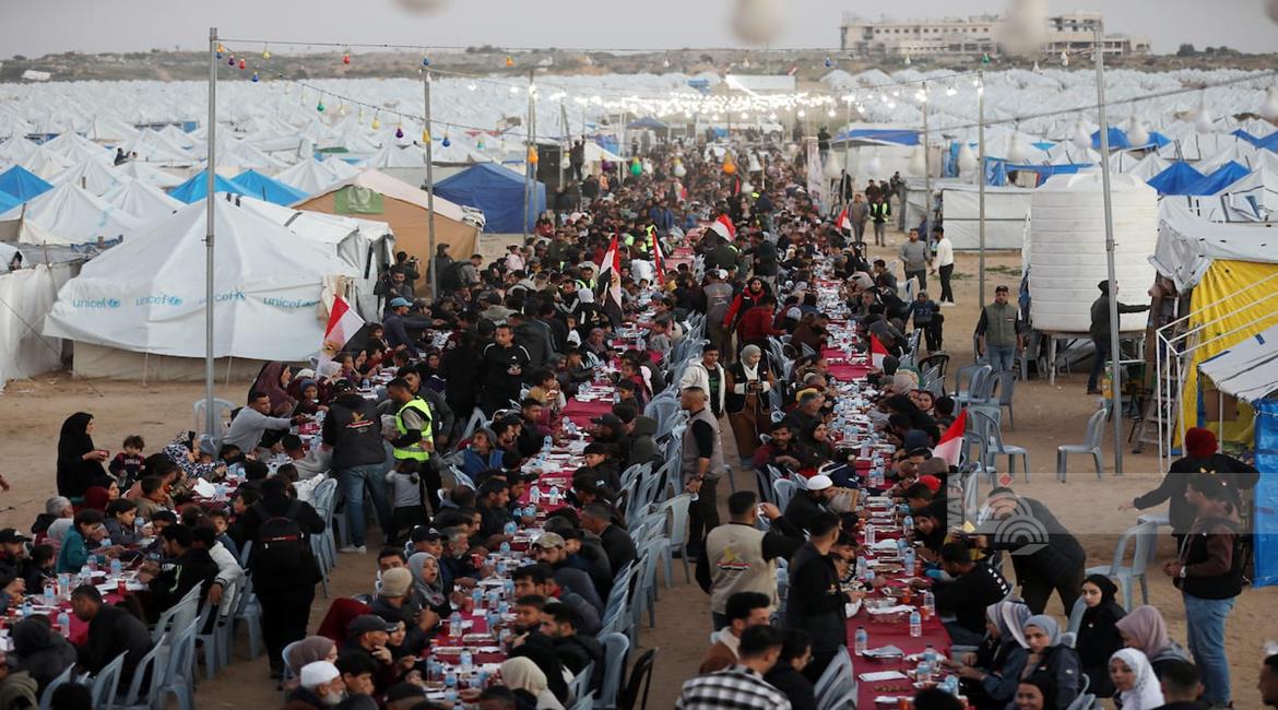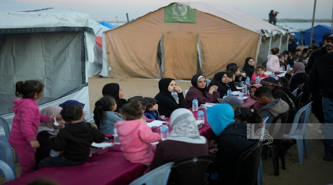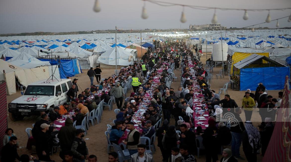غزة - نازحون يتناولون طعام الإفطار الجماعي في رابع أيام شهر رمضان المبارك، في مخيم إيواء بمدينة الزهراء وسط قطاع غزة