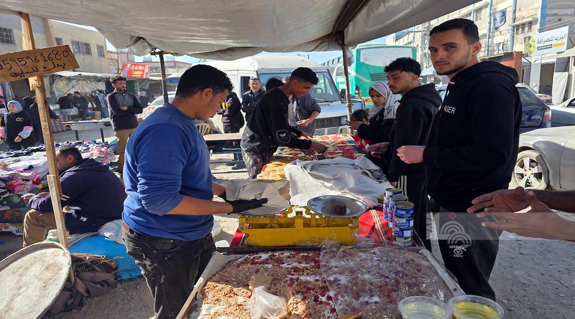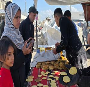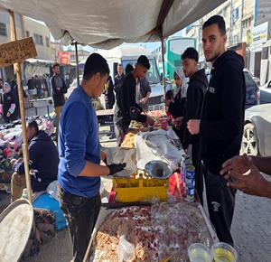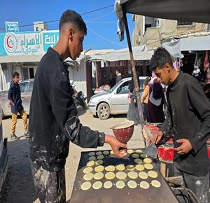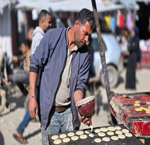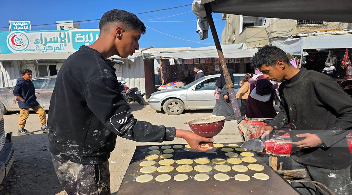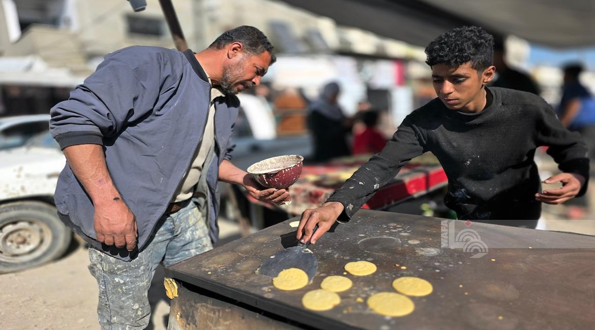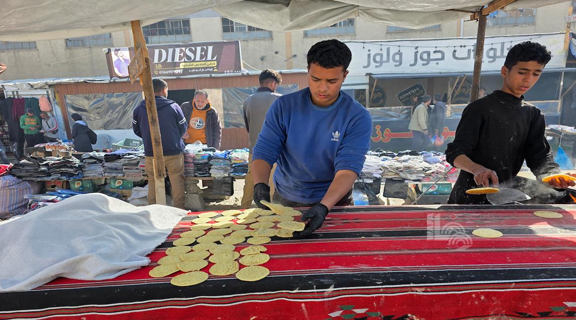 غزة - مواطنون يعدّون حلوى القطايف الرمضانية بطرق تقليدية رغم صعوبة الظروف في خان يونس، جنوب قطاع غزة.