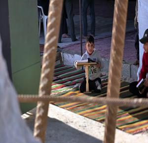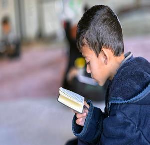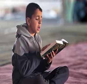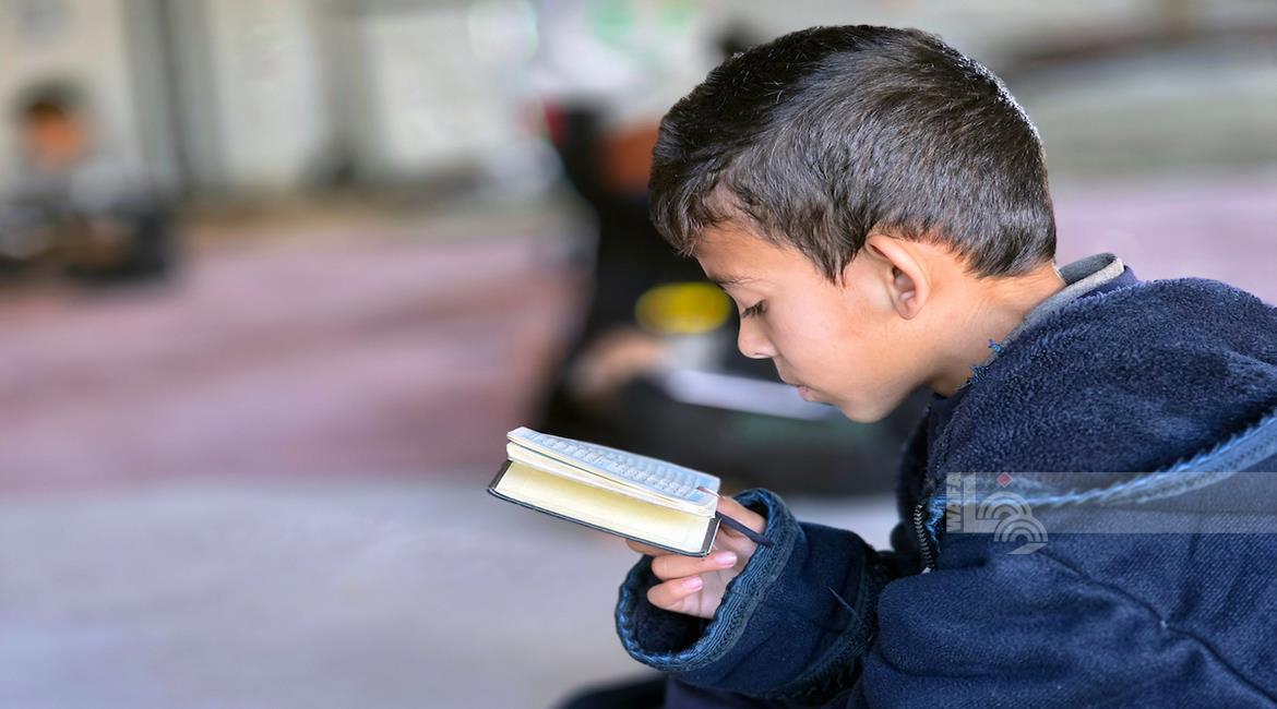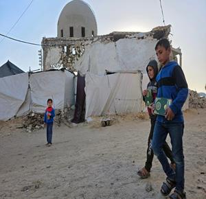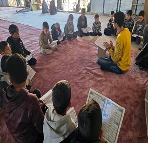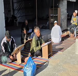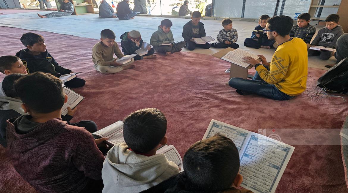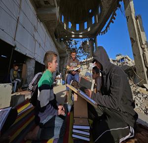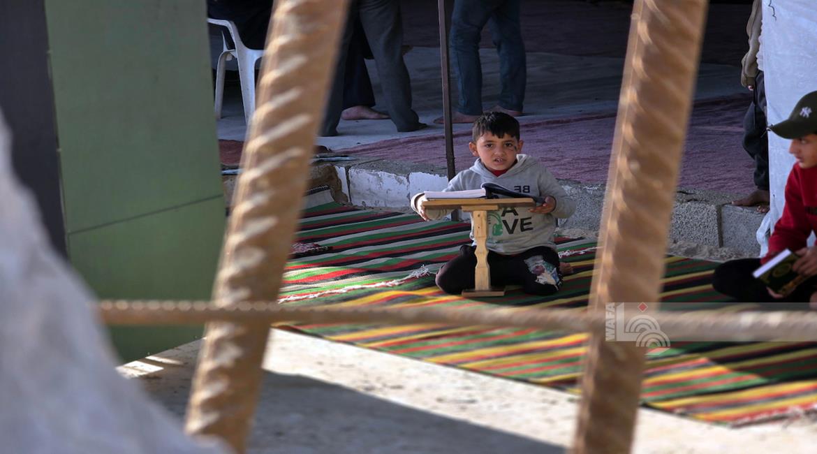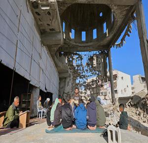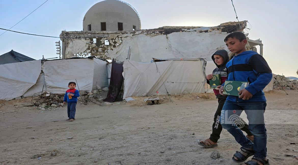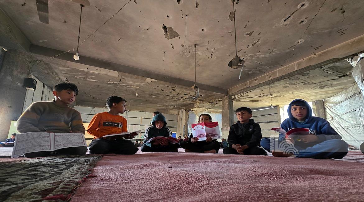 غزة - مواطنون، بينهم أطفال، يتعبدون ويتلون القرآن الكريم خلال شهر رمضان بين أنقاض مسجد الألباني الذي قصفه الاحتلال في خان يونس
