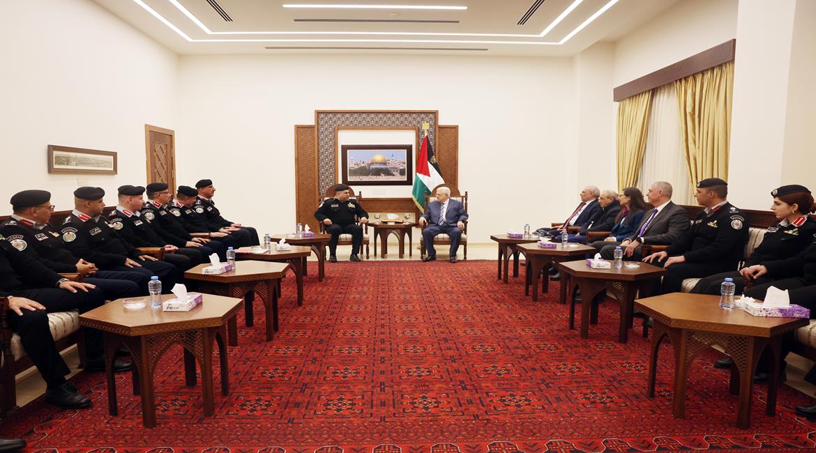 رام الله - الرئيس محمود عباس، يتسلم التقرير السنوي لجهاز الدفاع المدني الفلسطيني لعام 2025، وذلك خلال استقباله المدير العام للجهاز اللواء أكرم ثوابتة، وقيادة الجهاز، في مقر الرئاسة بمدينة رام الله