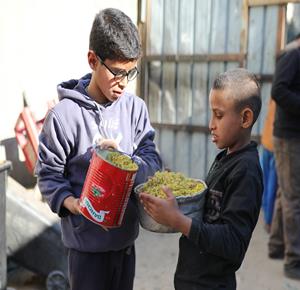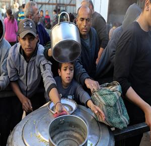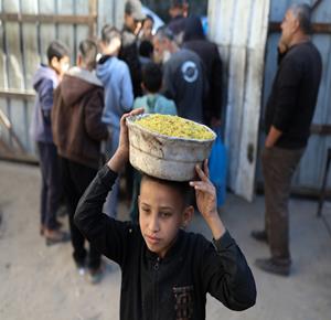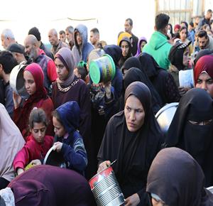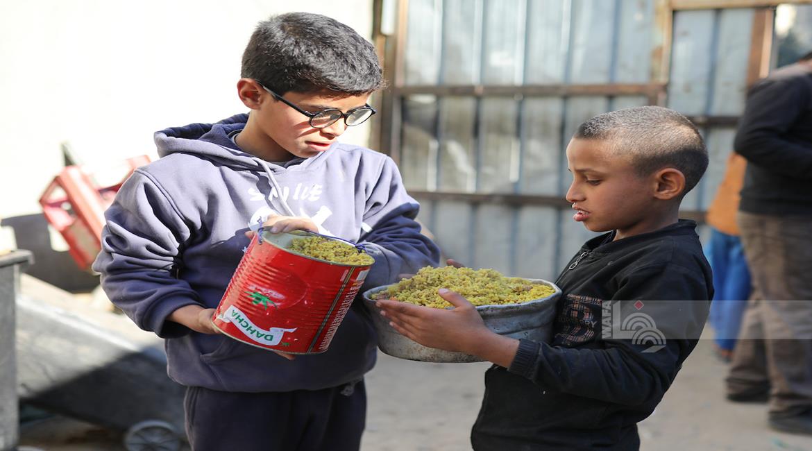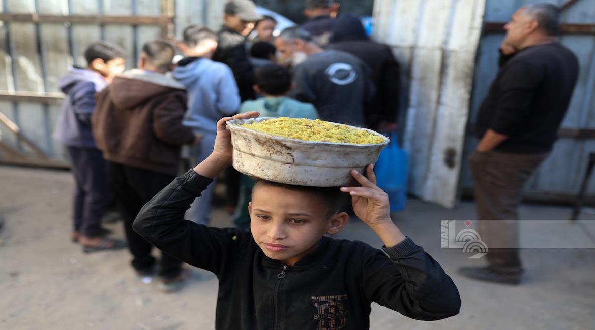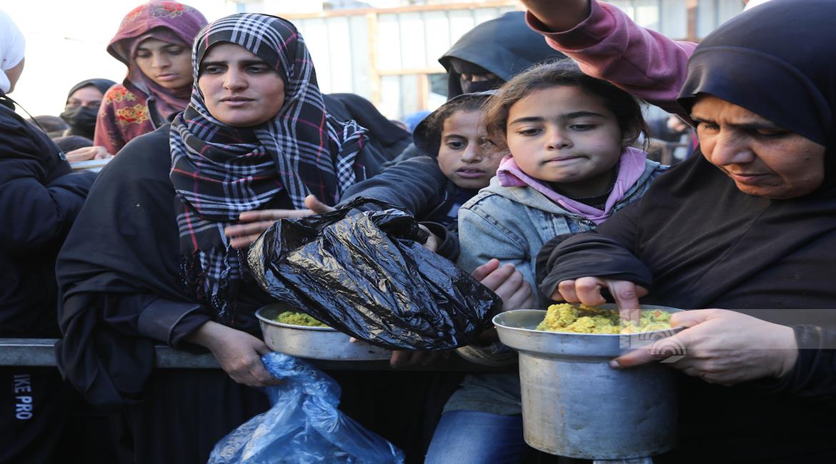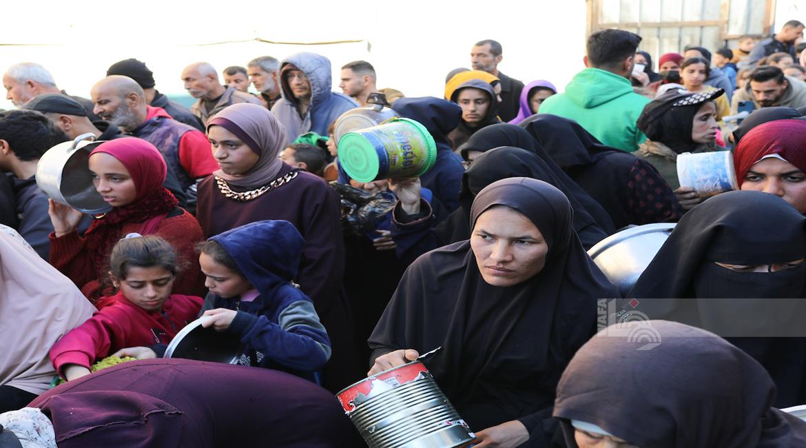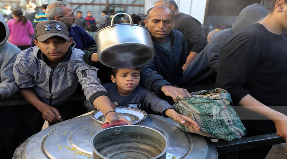 غزة - نازحون يتجمّعون للحصول على وجبة الإفطار في شهر رمضان من تكية خيرية في مخيم النصيرات وسط قطاع غزة