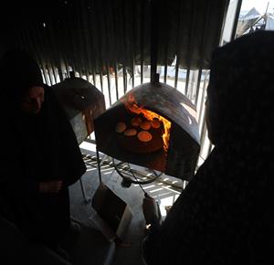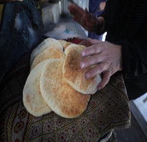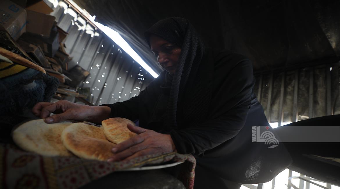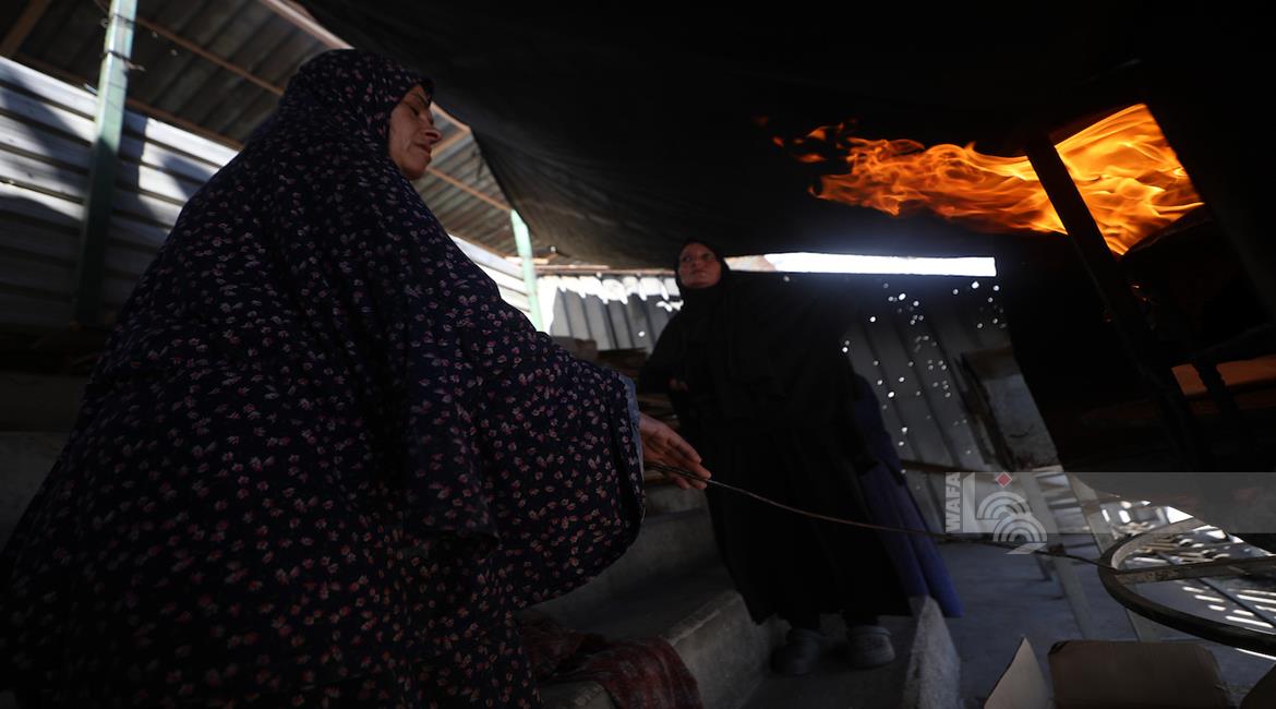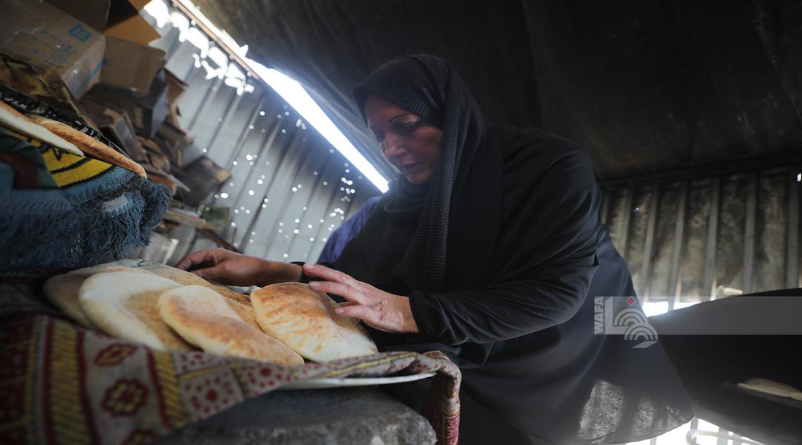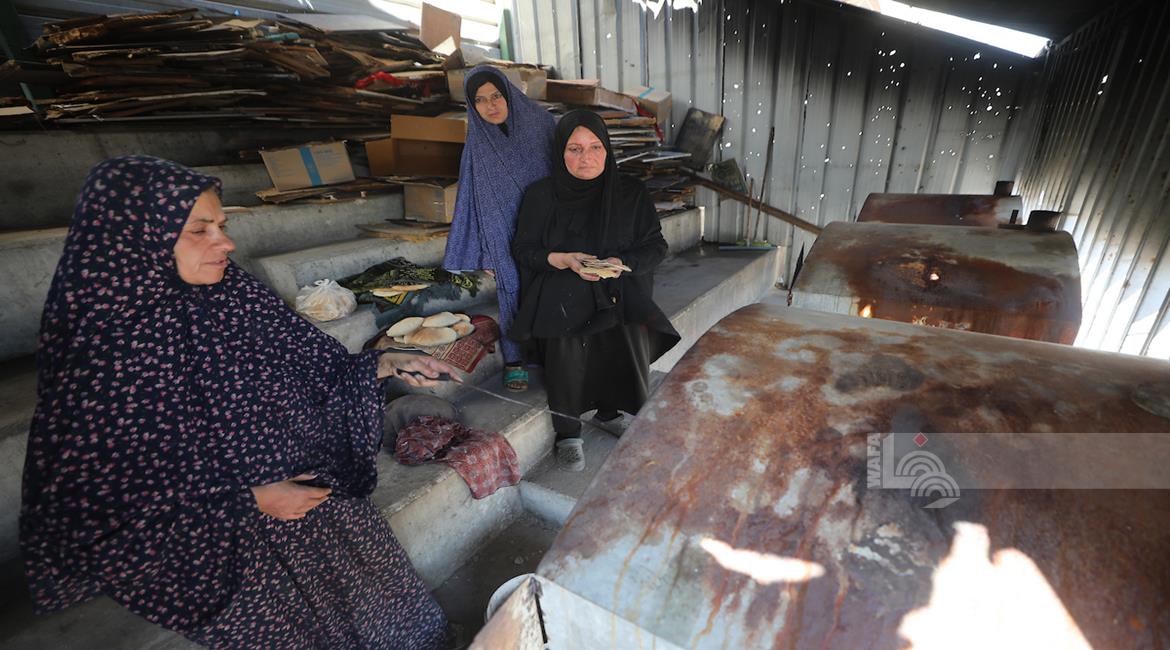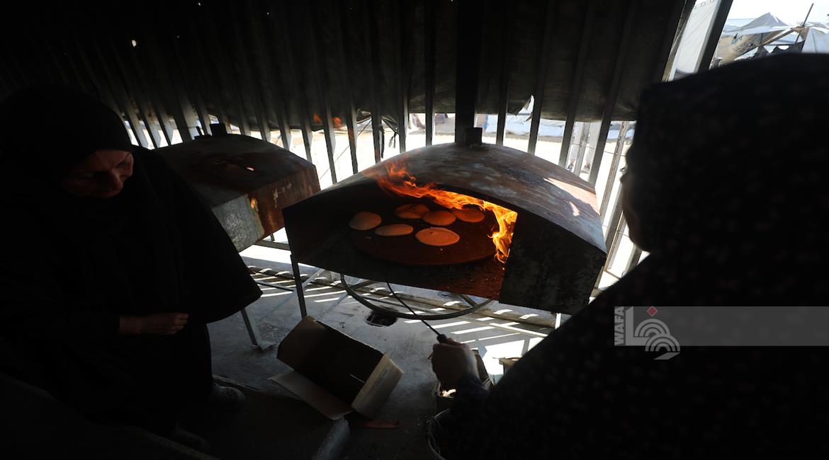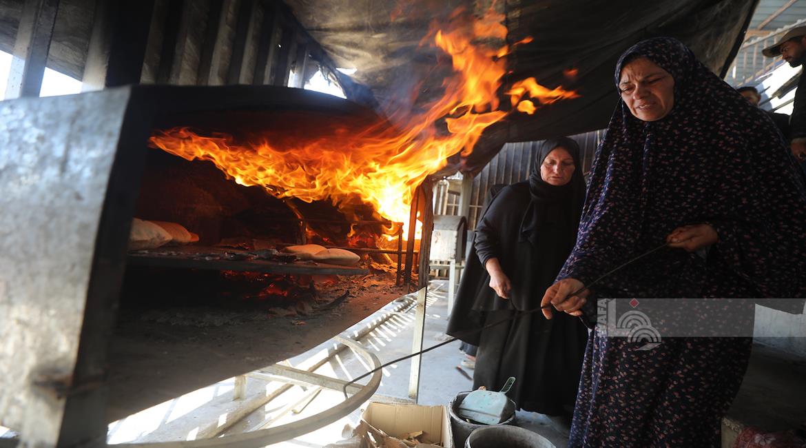 غزة - نساء تعمل داخل مخبز في مخيم اليرموك وسط قطاع غزة ضمن مبادرة إنسانية بالشراكة مع اللجنة الدولية للصليب الأحمر لتخفيف الأعباء المعيشية عن النساء النازحات خلال شهر رمضان