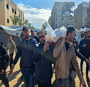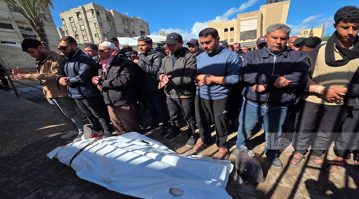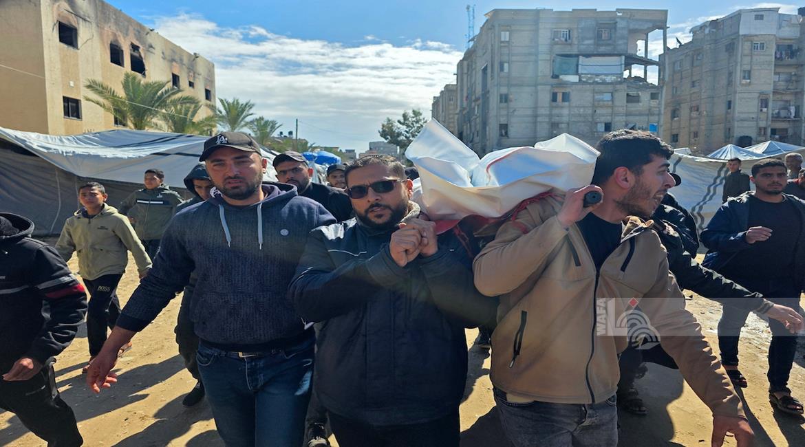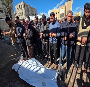 غزة - مواطنون يودّعون جثامين ثلاثة شهداء في مستشفى ناصر، بعدما استُشهدوا فجر اليوم جراء غارة جوية إسرائيلية استهدفتهم في خان يونس جنوب قطاع غزة