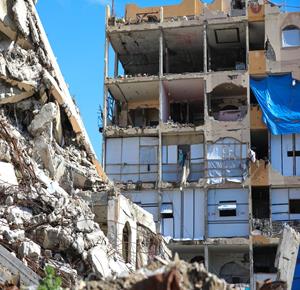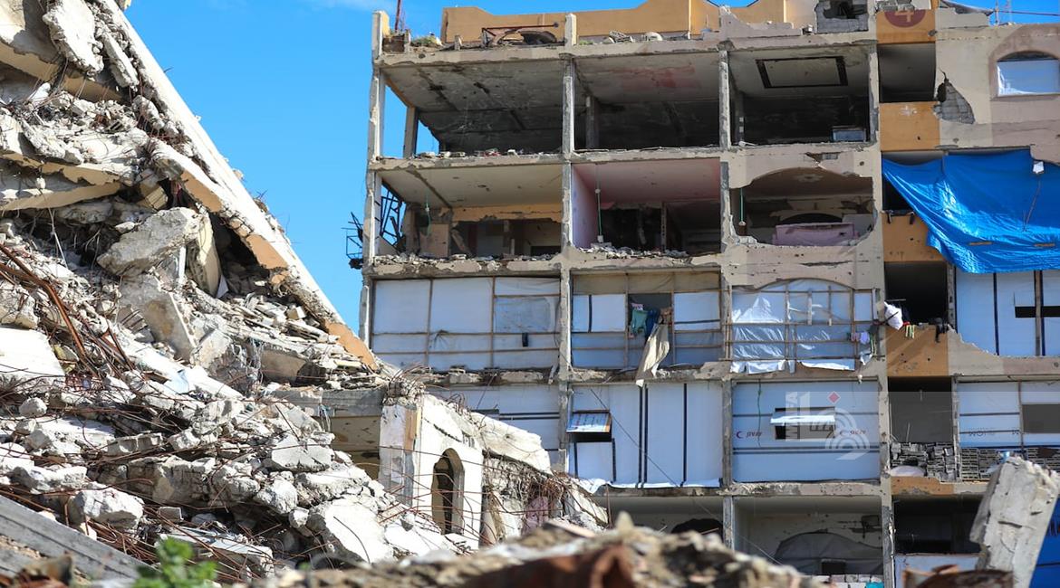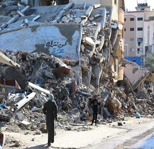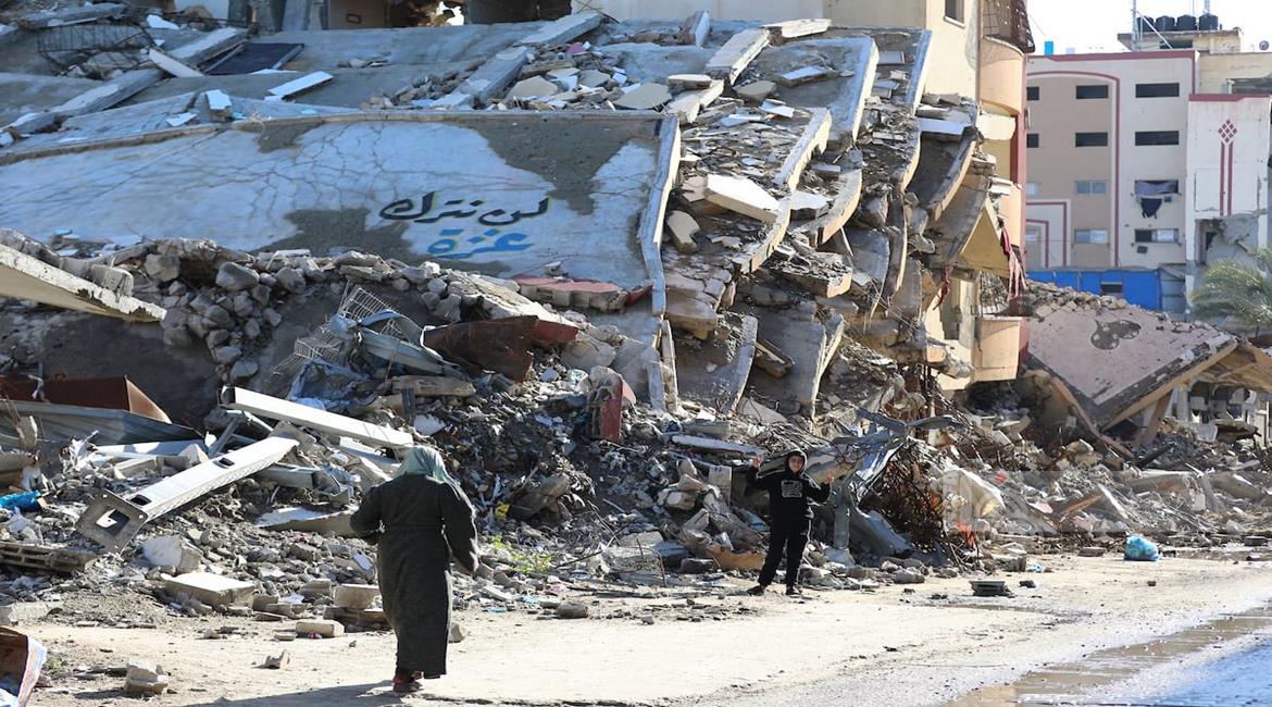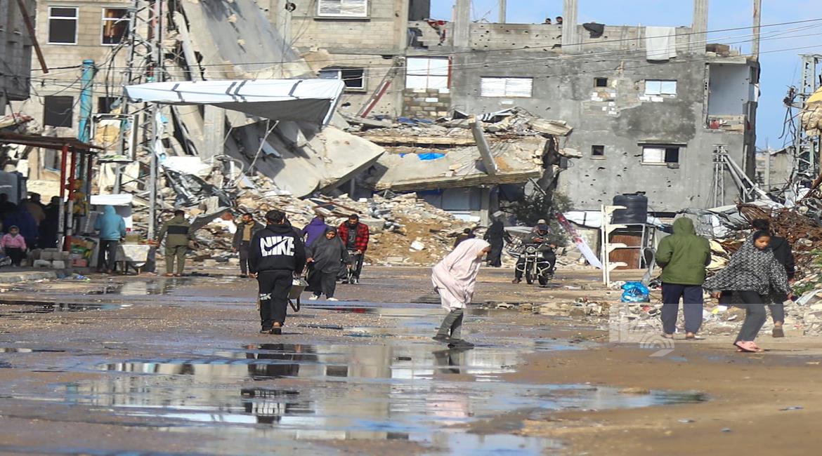 مواطنون يؤدّون صلاة الجمعة الثانية من شهر رمضان بين أنقاض مسجد الكنز الذي دُمّر جراء العدوان الاسرائيلي على مدينة غزة