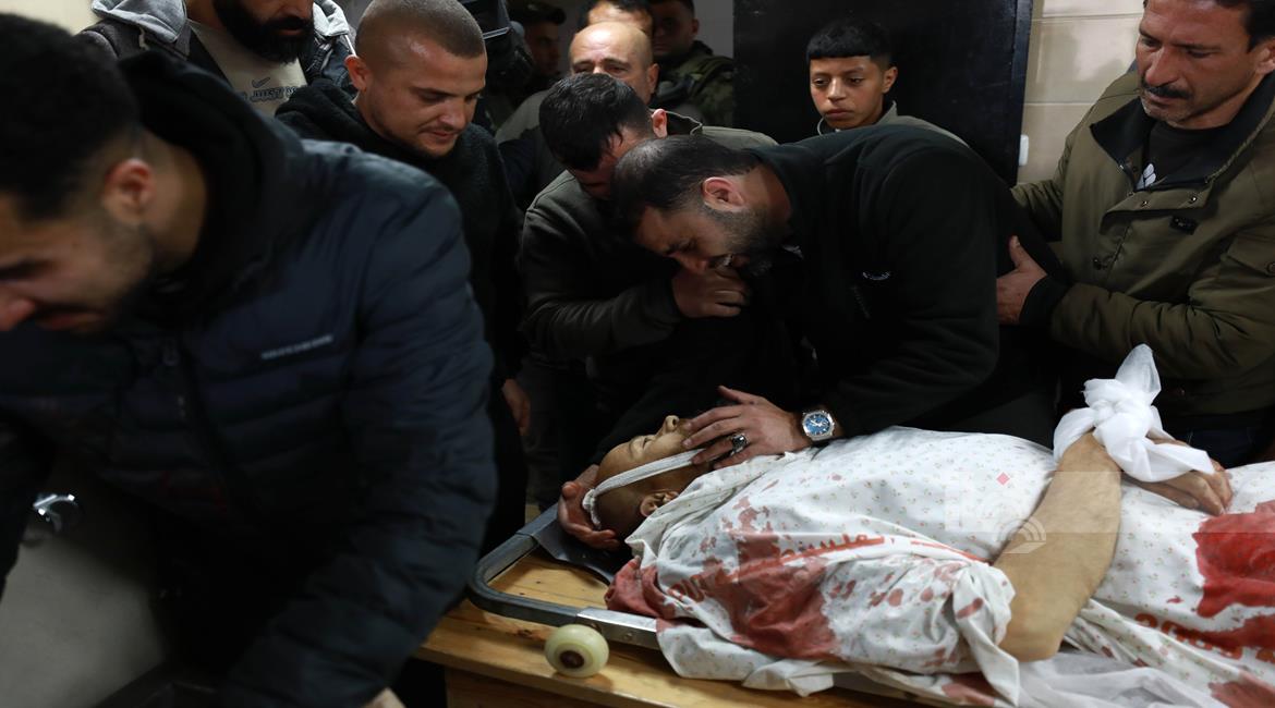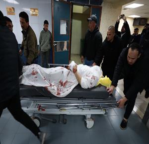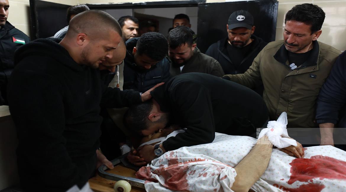 مواطنون يوّدعون جثمان الشهيد حسن عبد الرحمن اللحام (45 عامًا) في مستشفى ناصر الطبي، بعد استشهاده برصاص الجيش الإسرائيلي في خان يونس جنوب قطاع غزة