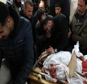 مواطنون يودّعون جثامين ثلاثة شهداء في مستشفى ناصر، بعدما استُشهدوا فجر اليوم جراء غارة جوية إسرائيلية استهدفتهم في خان يونس جنوب قطاع غزة