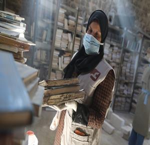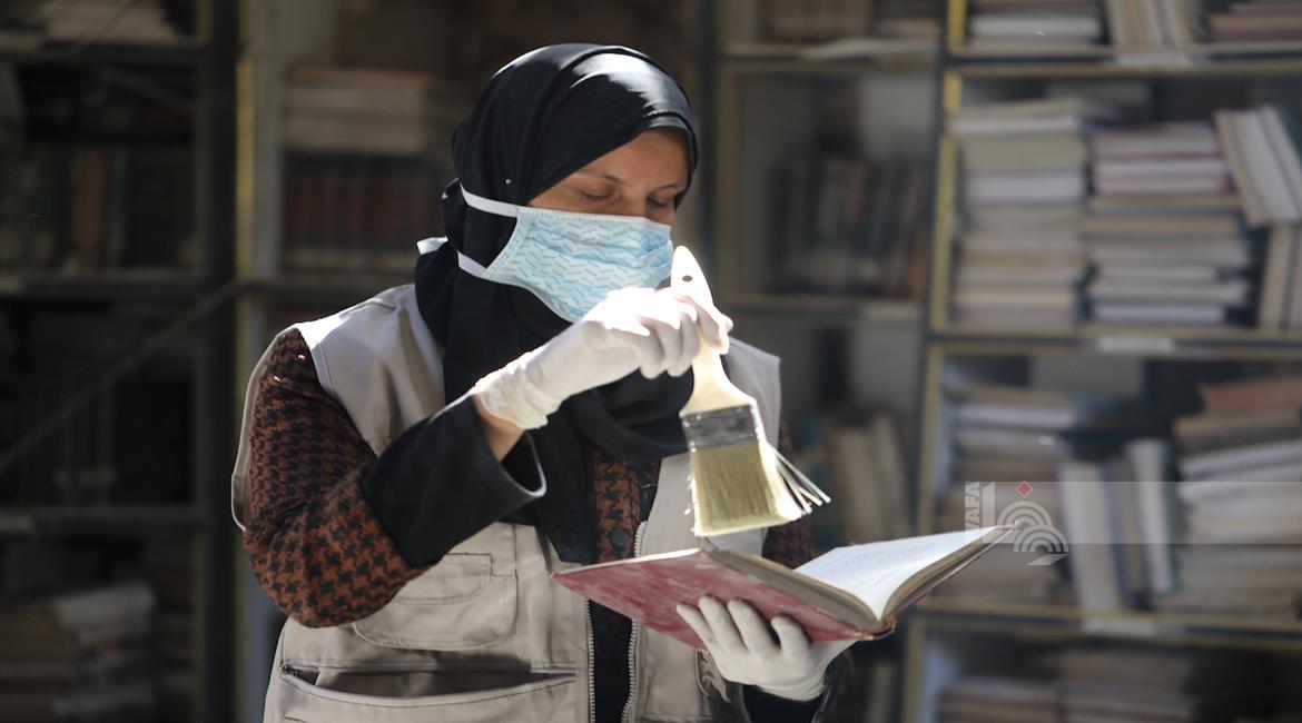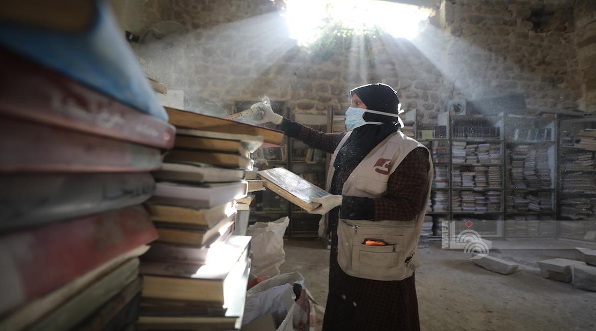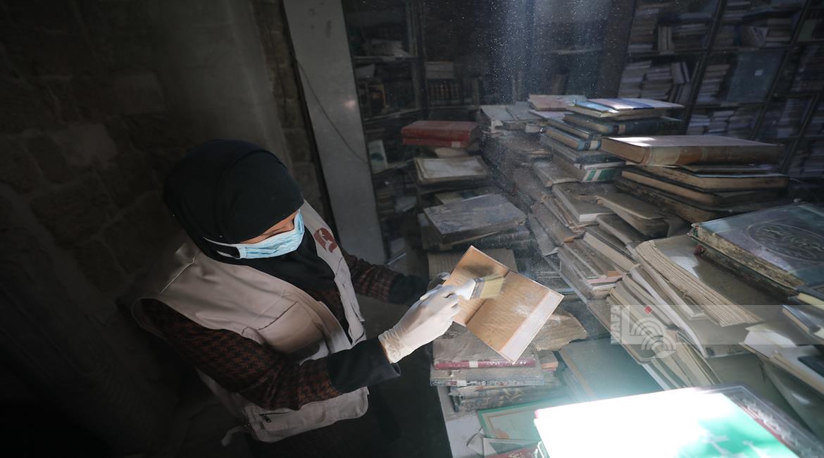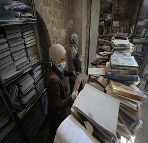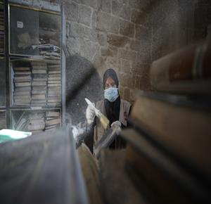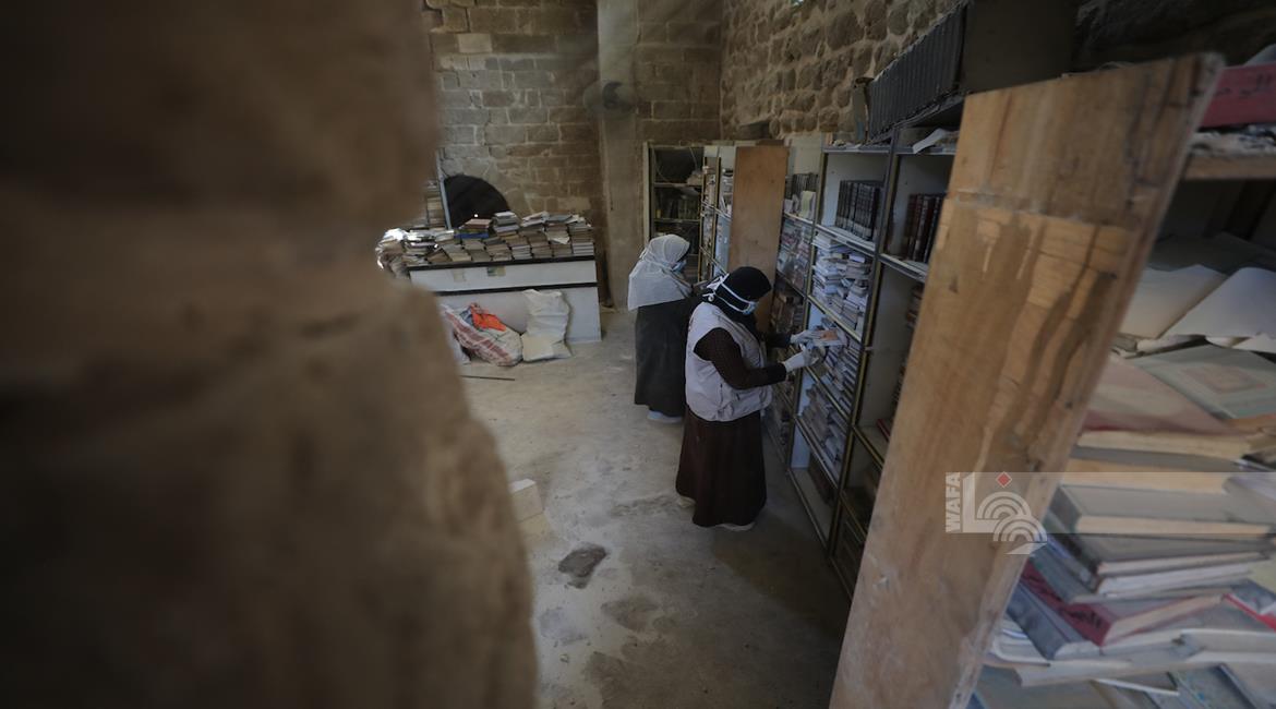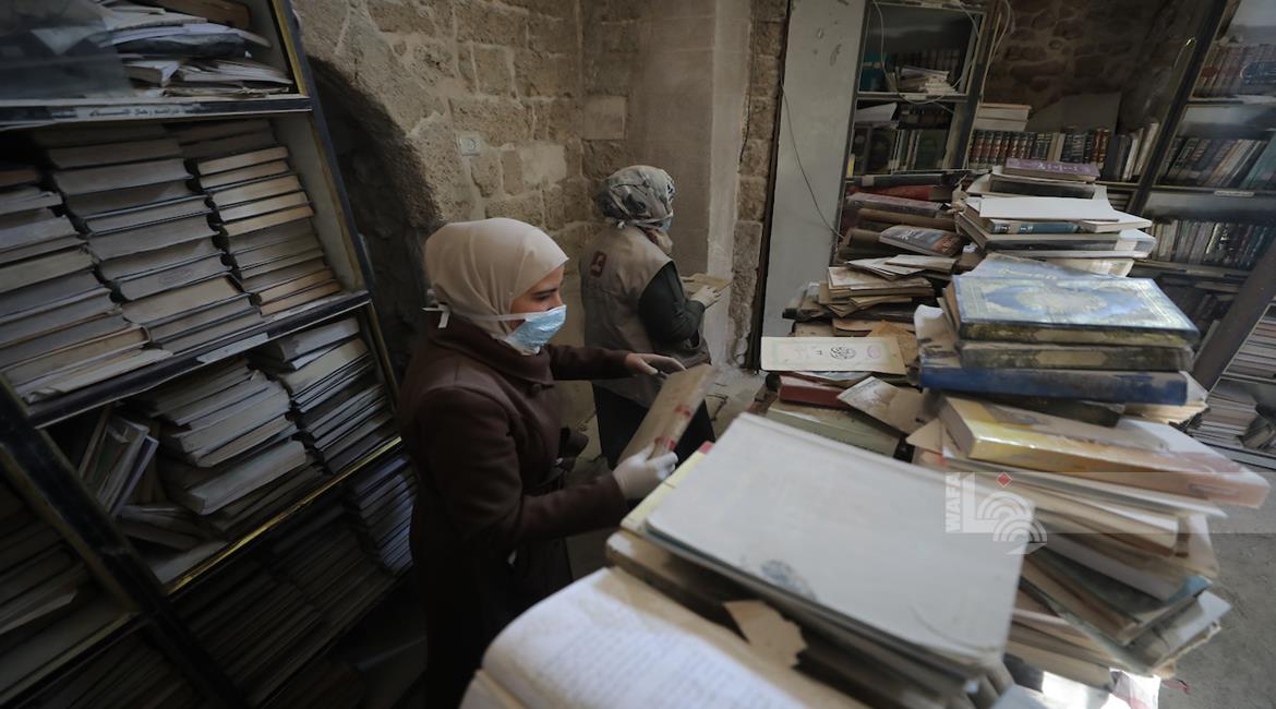 غزة - متطوعون يرممون كتبا تضررت جراء القصف الإسرائيلي في مكتبة الجامع العمري الكبير بمدينة غزة