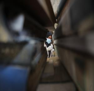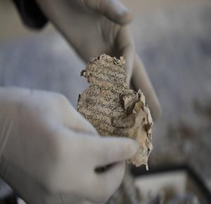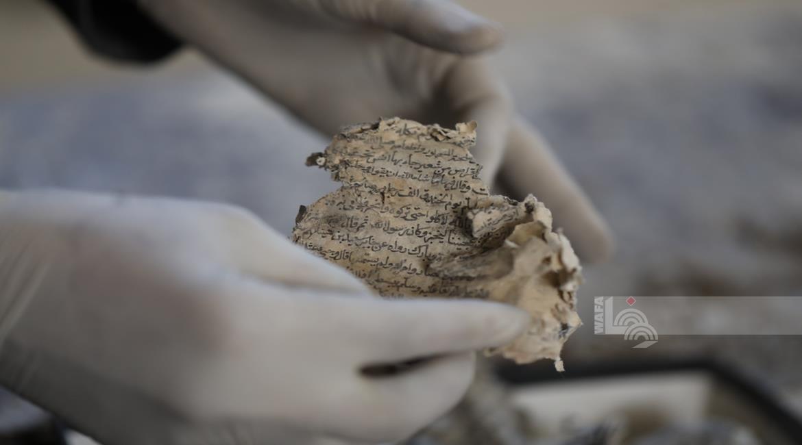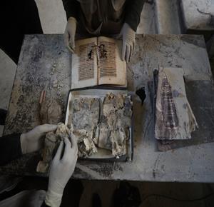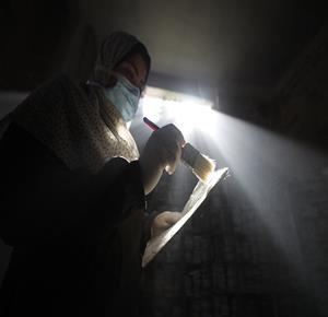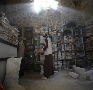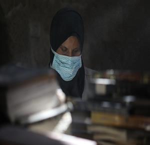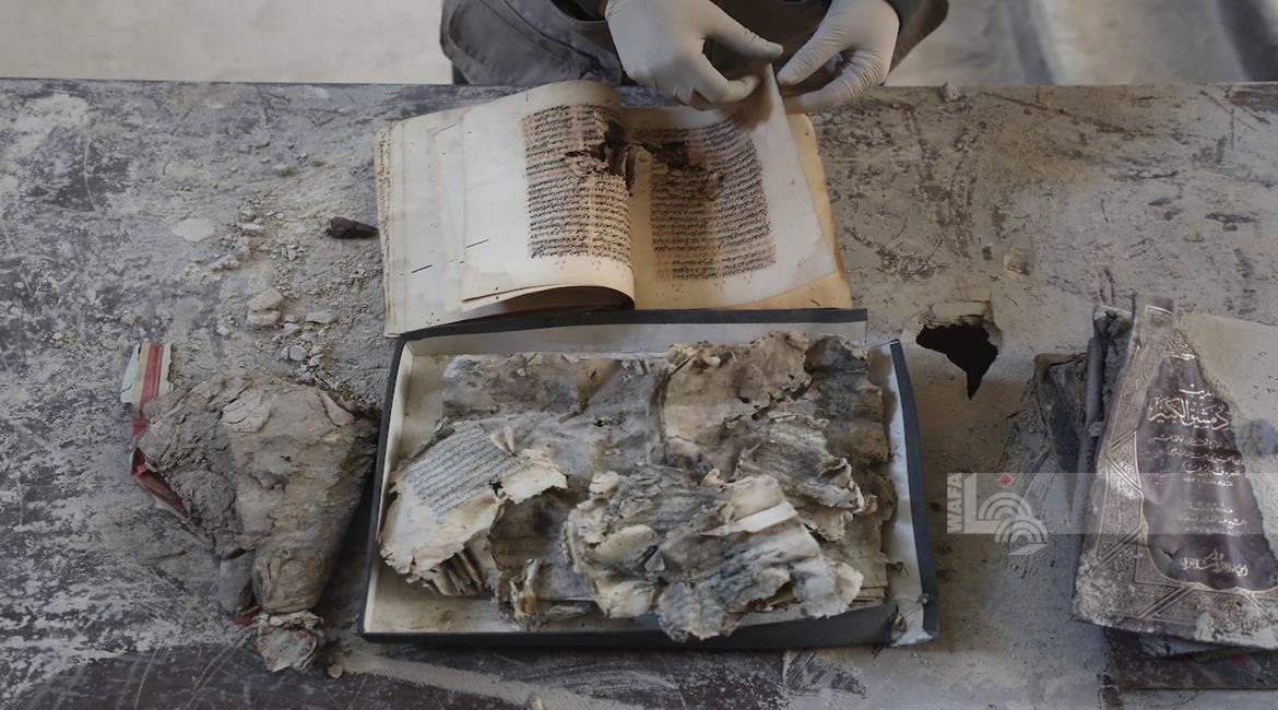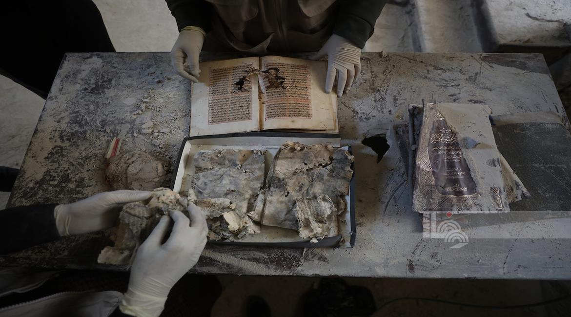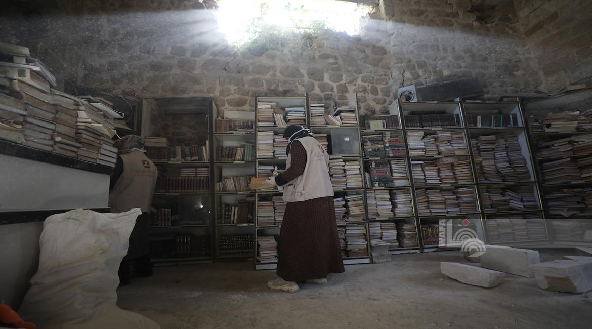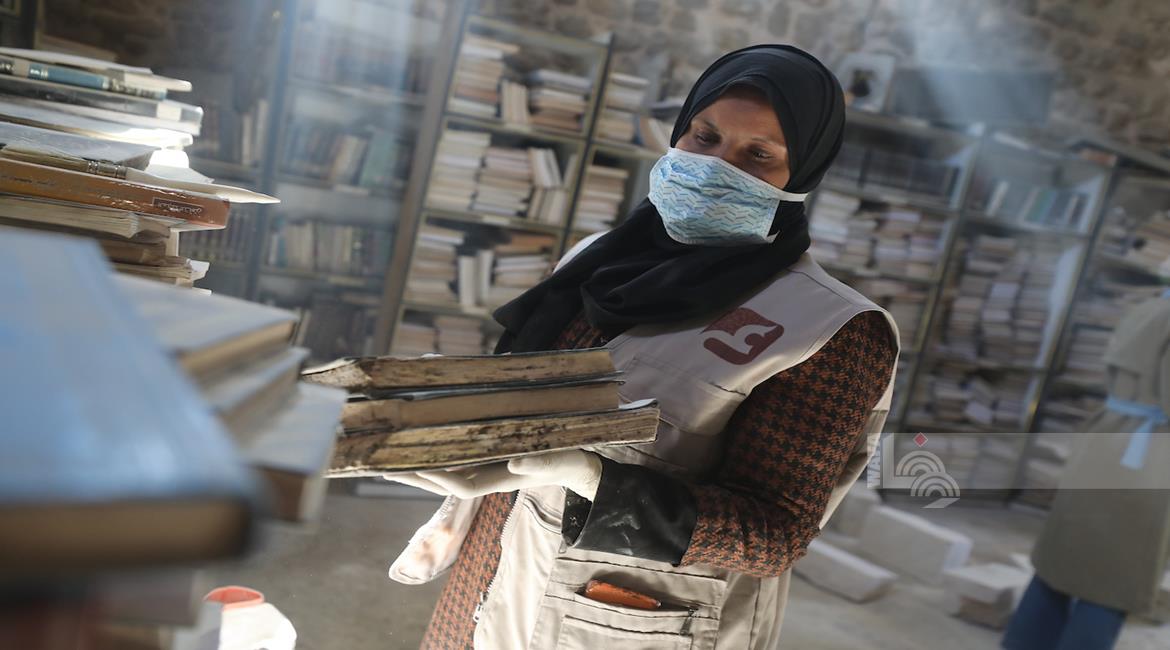 غزة - متطوعون يرممون كتبا تضررت جراء القصف الإسرائيلي في مكتبة الجامع العمري الكبير بمدينة غزة