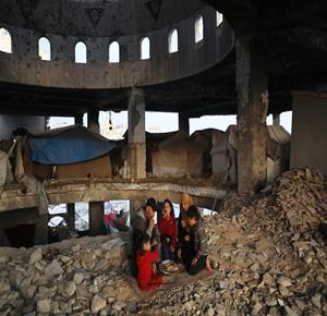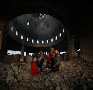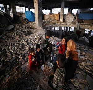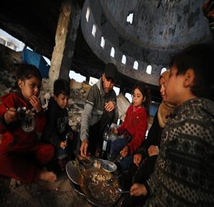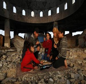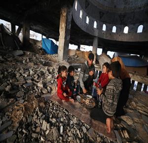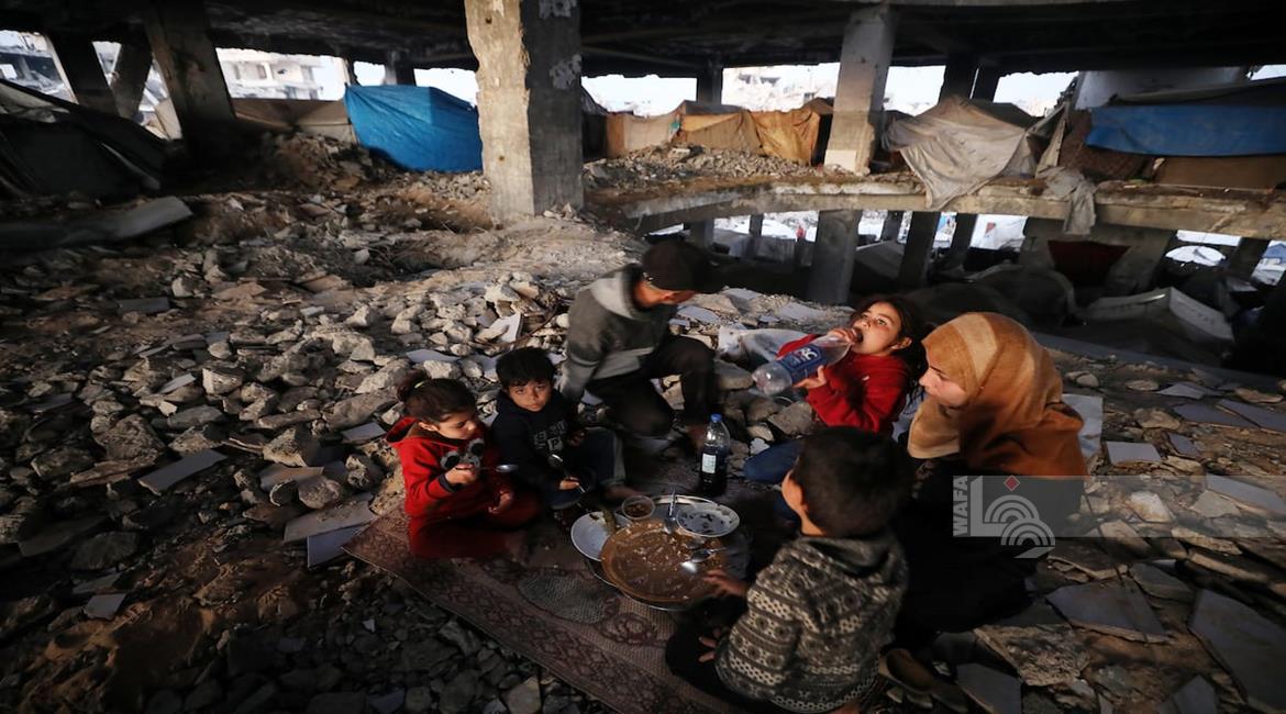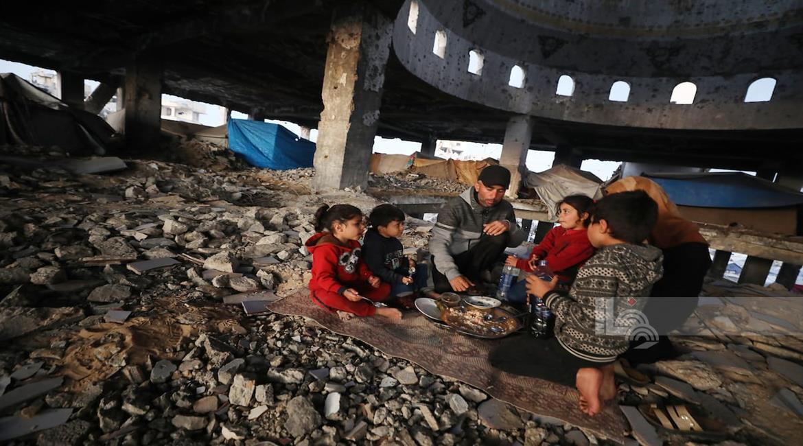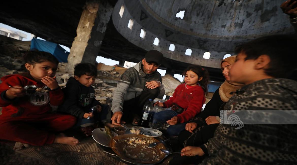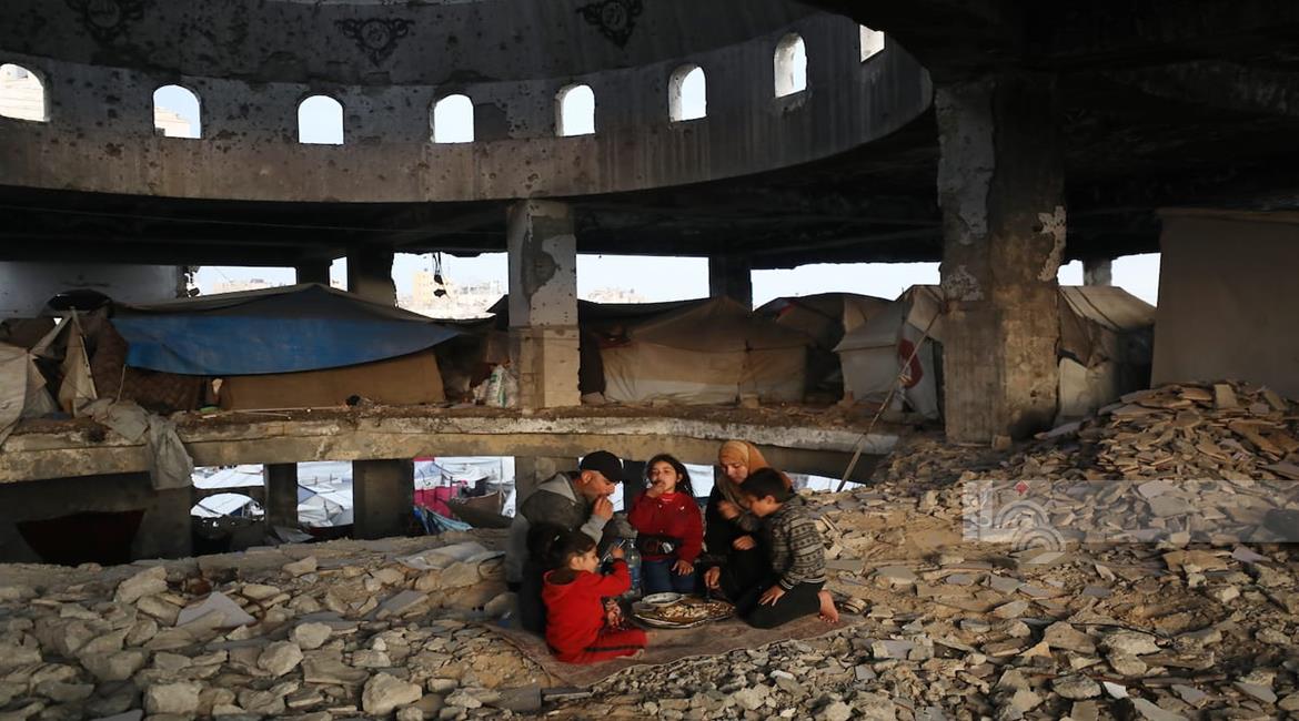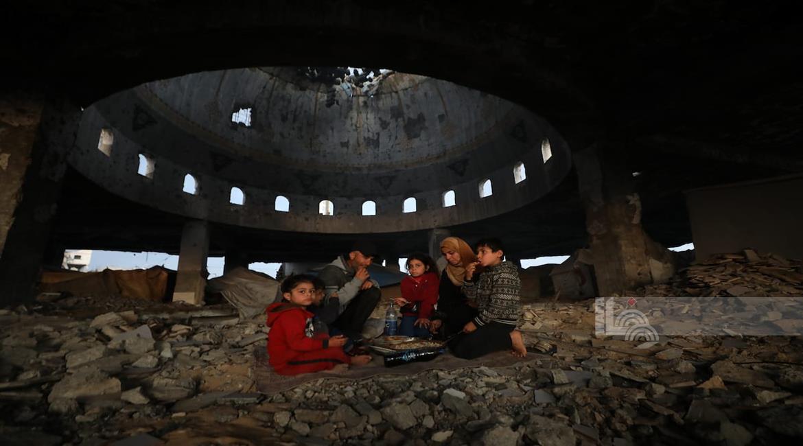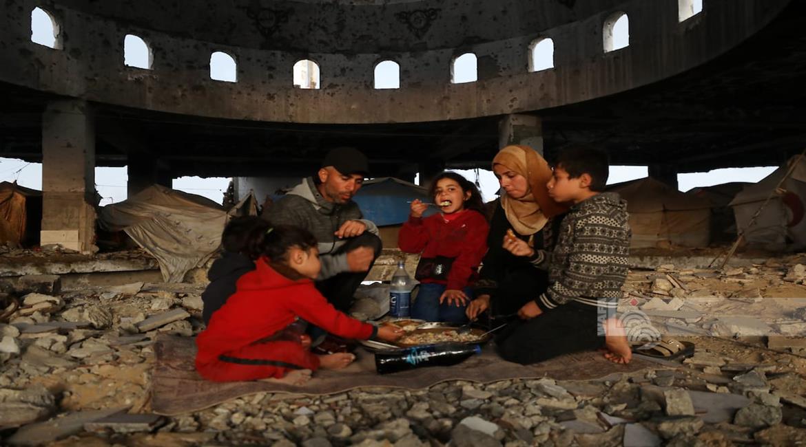 غزة - عائلة نازحة من حيّ الزيتون تتناول الإفطار فوق ركام مسجد الشافعي في عسقولة شرق غزة، بعد أن أصبح مأوى لها عقب تدمير منزلها في الحرب