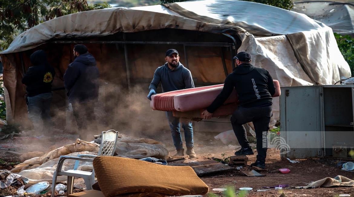 مواطنون يتفقدون آثار الدمار جراء قصف الاحتلال مخيما للنازحين مما أسفر عن استشهاد ثلاث نساء بينهن طفلة وصحفية وإصابة عشرة آخرين