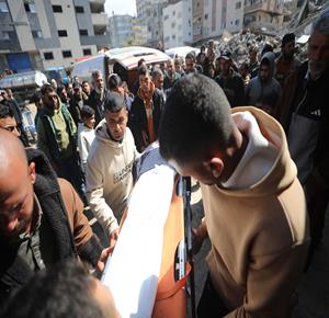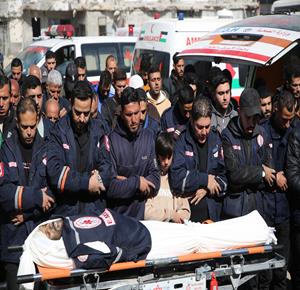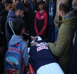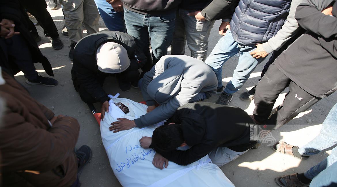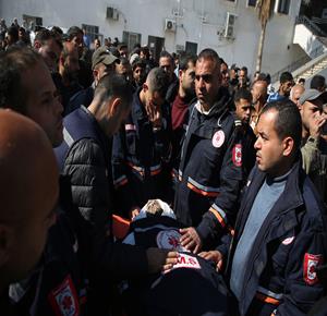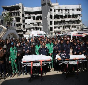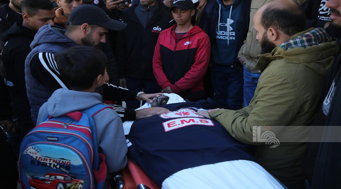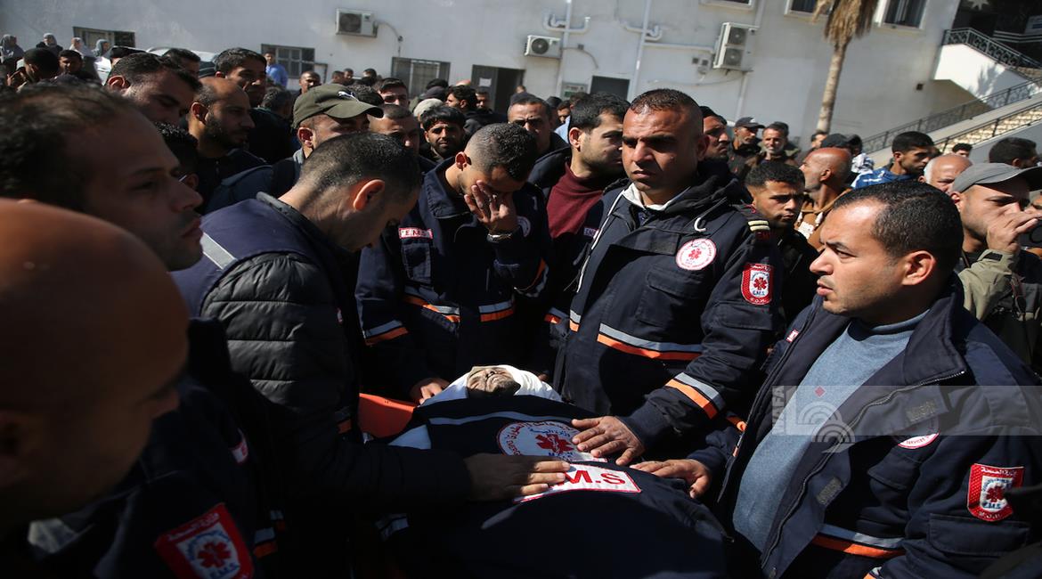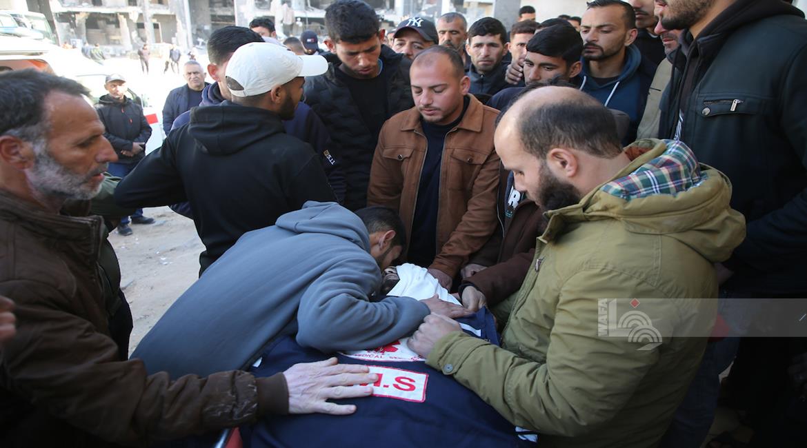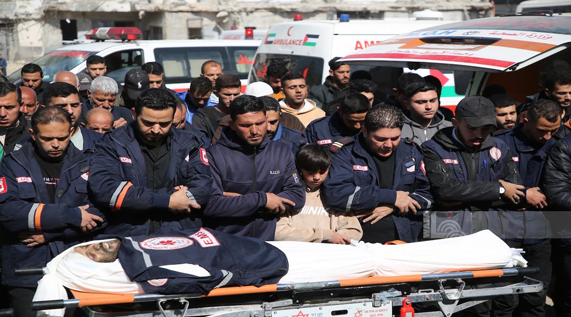 غزة - وداع وتشييع 3 شهداء بينهم مسعف في مستشفى الشفاء بمدينة غزة، ارتقوا جراء غارة إسرائيلية غرب المدينة