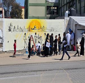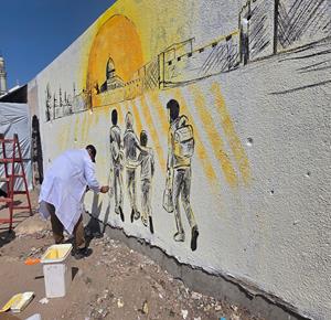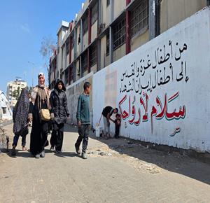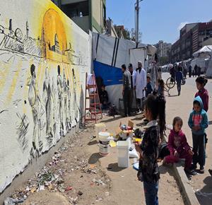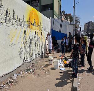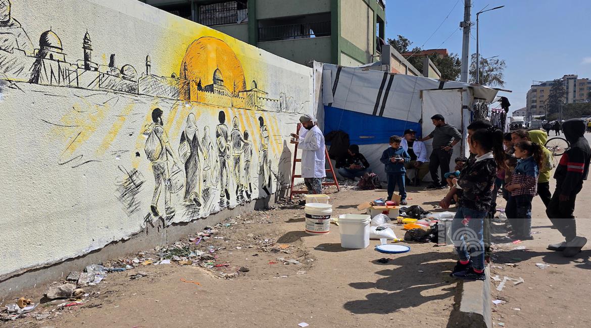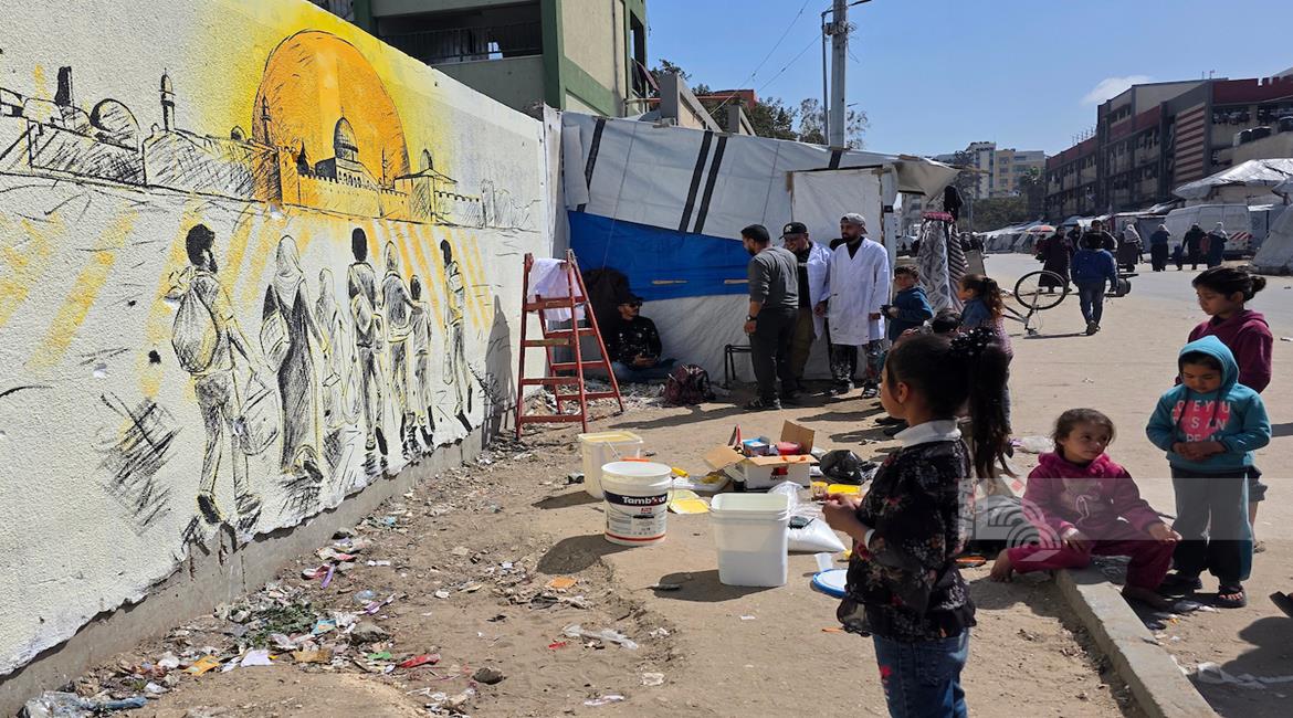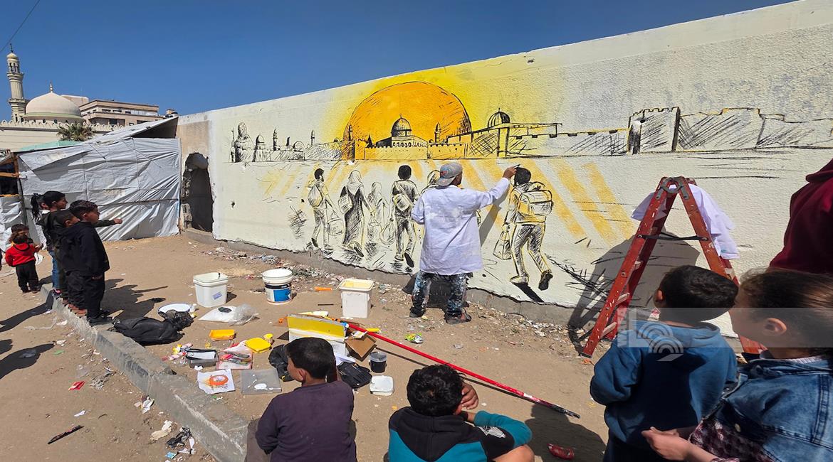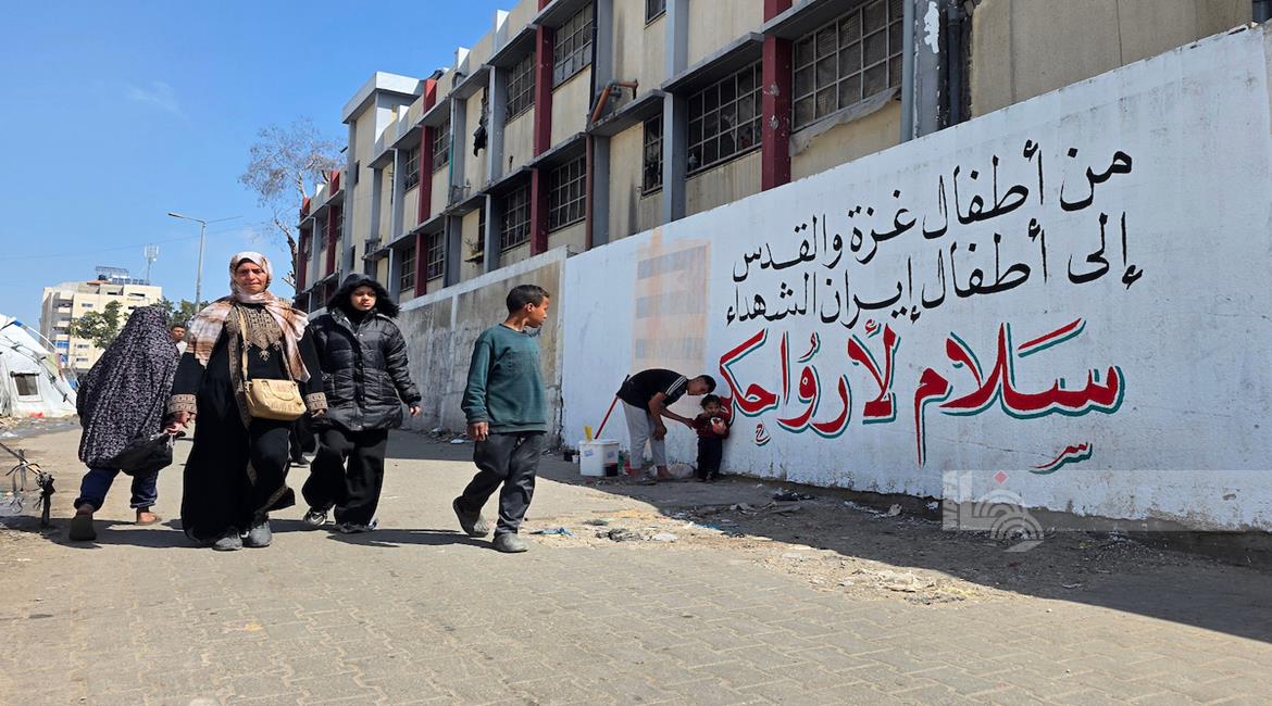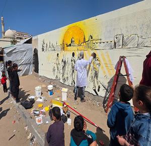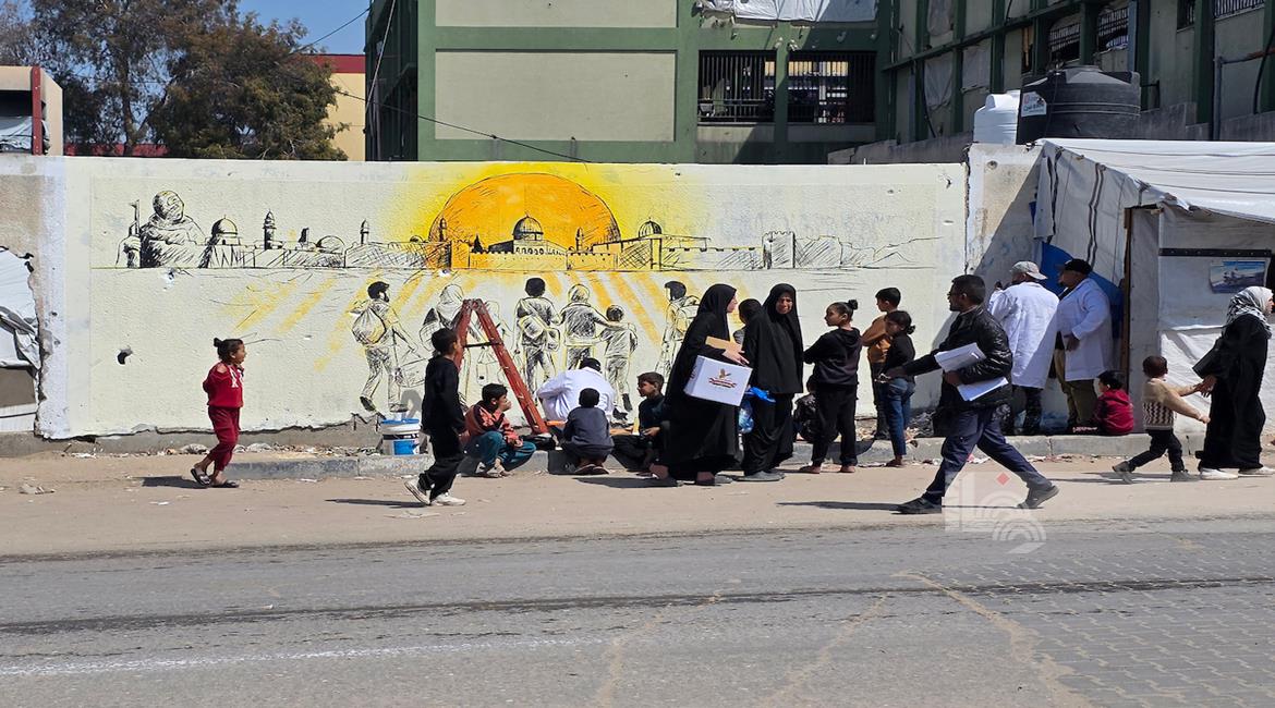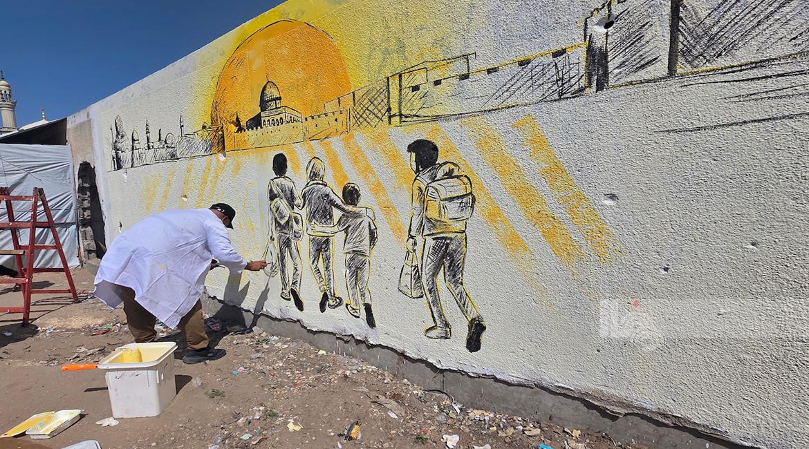 غزة - فنانون يرسمون جداريات وكتابات خطية على جدران مدرسة حُوّلت إلى مأوى للنازحين في مدينة غزة