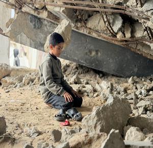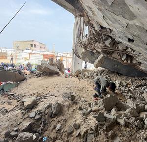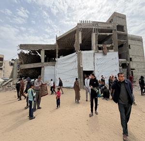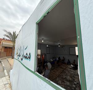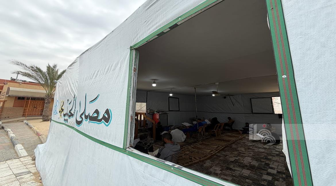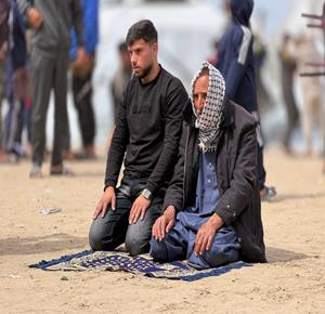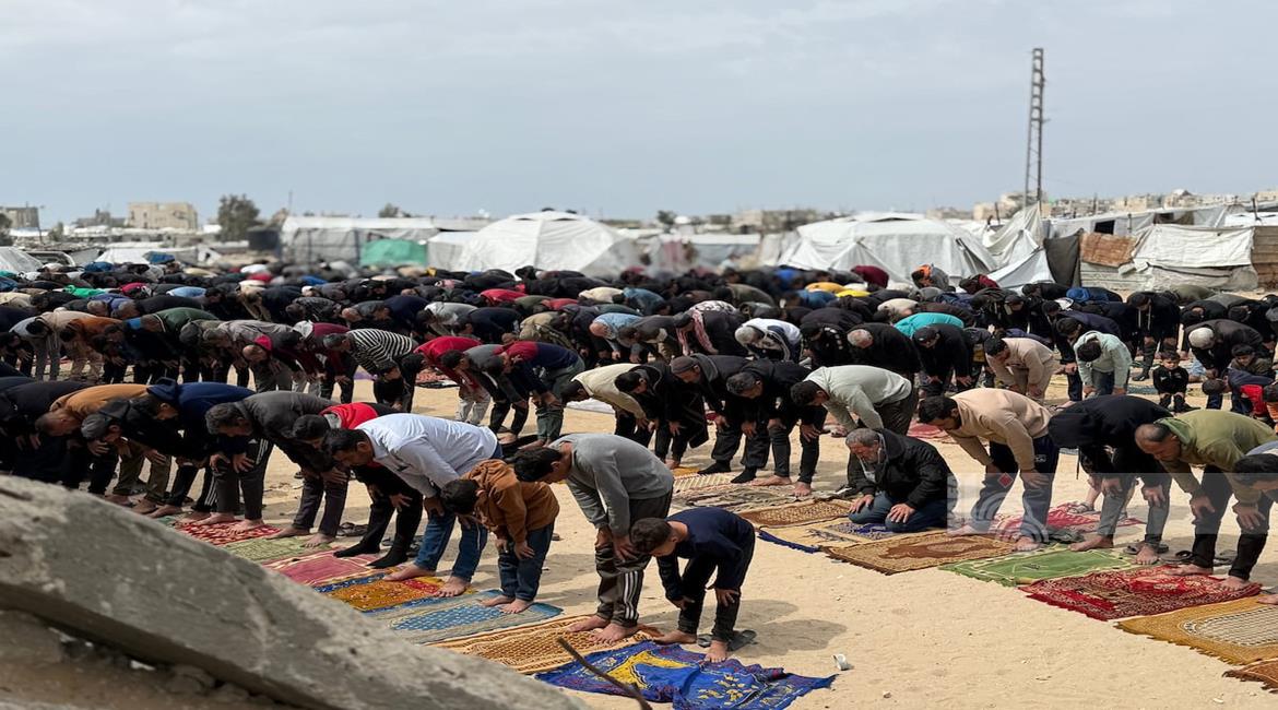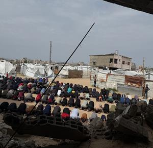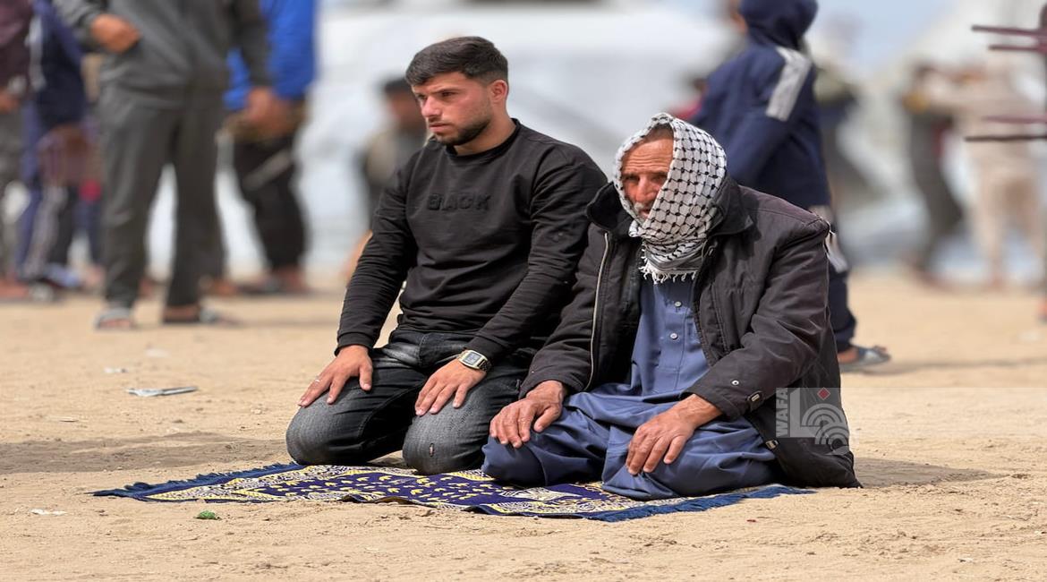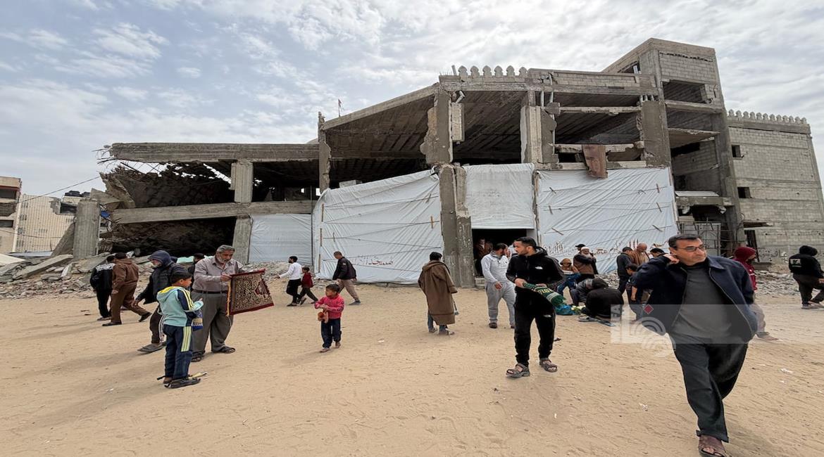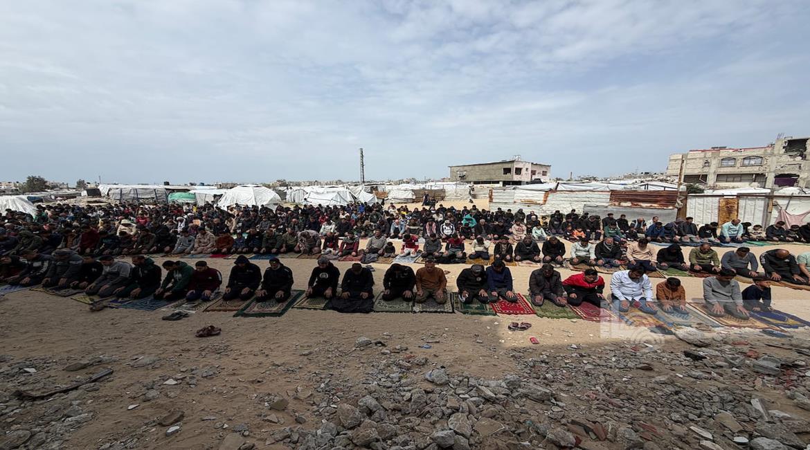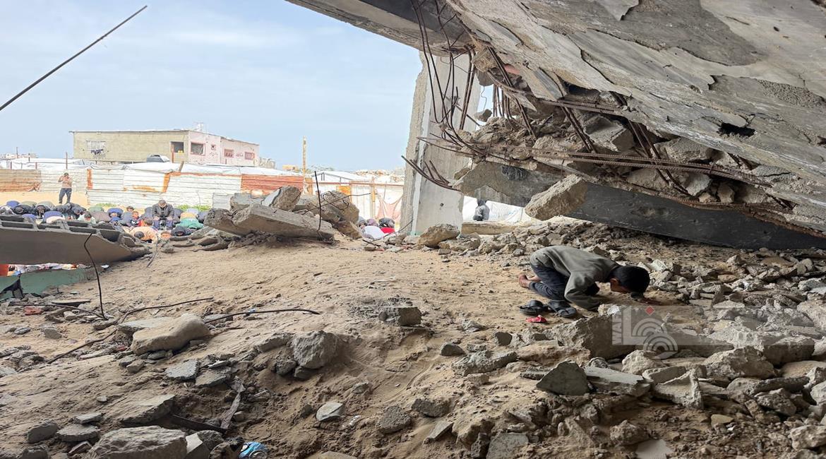 غزة - نازحون يؤدّون صلاة الجمعة الأخيرة من شهر رمضان بجانب أنقاض مسجد الألباني الذي دُمّر جراء العدوان الاسرائيلي، في خان يونس جنوب قطاع غزة