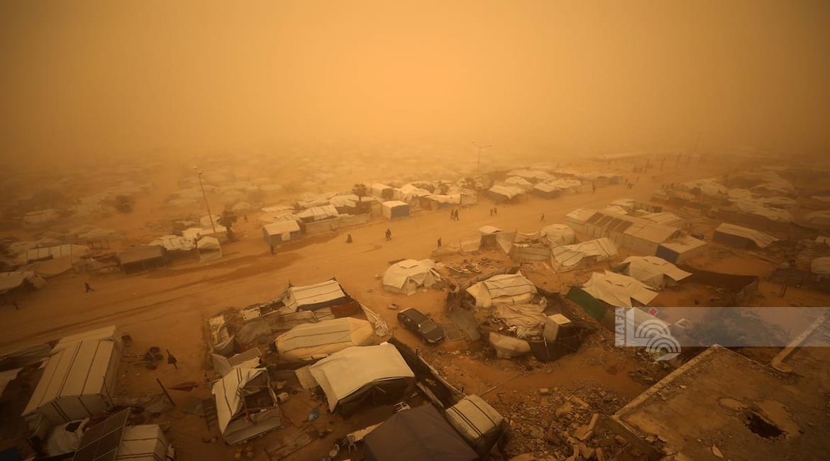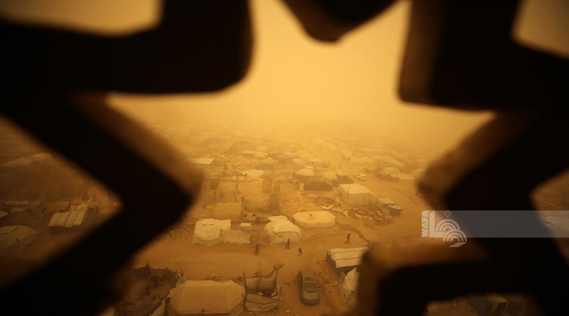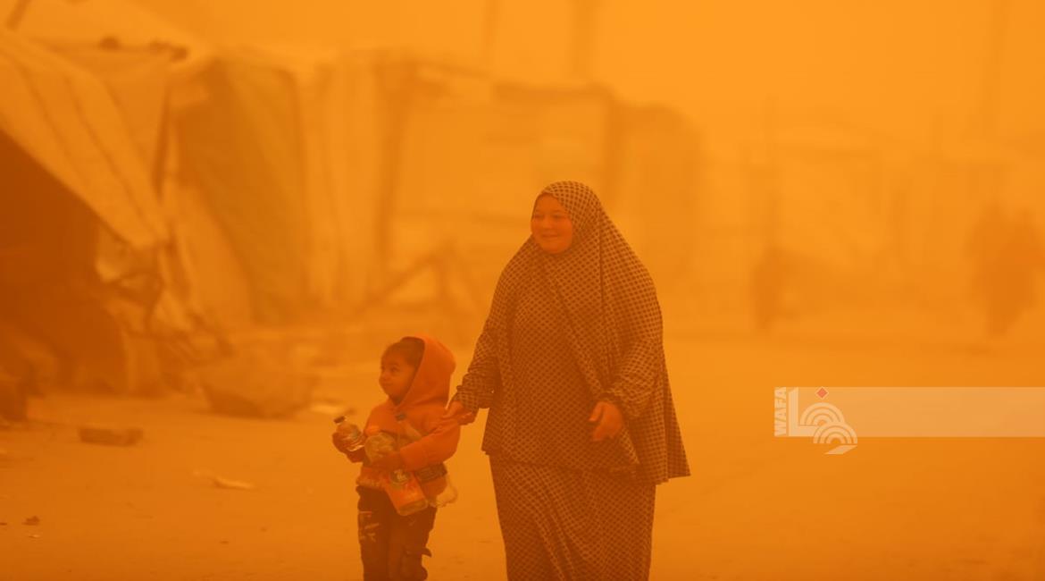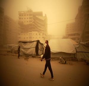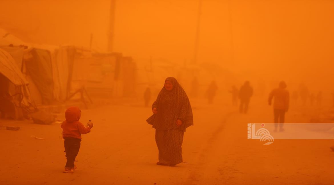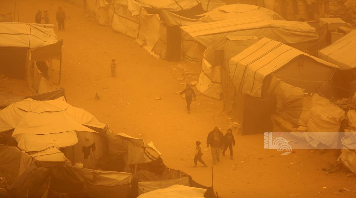غزة - مواطنون يسيرون وسط عاصفة رملية في مخيم للنازحين بخان يونس جنوب قطاع غزة