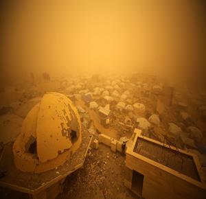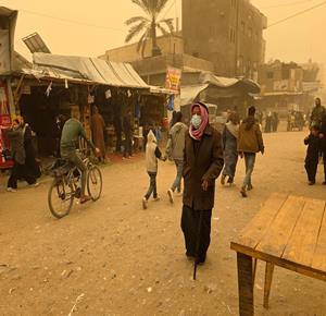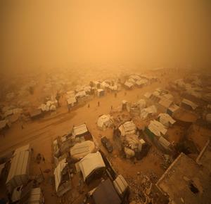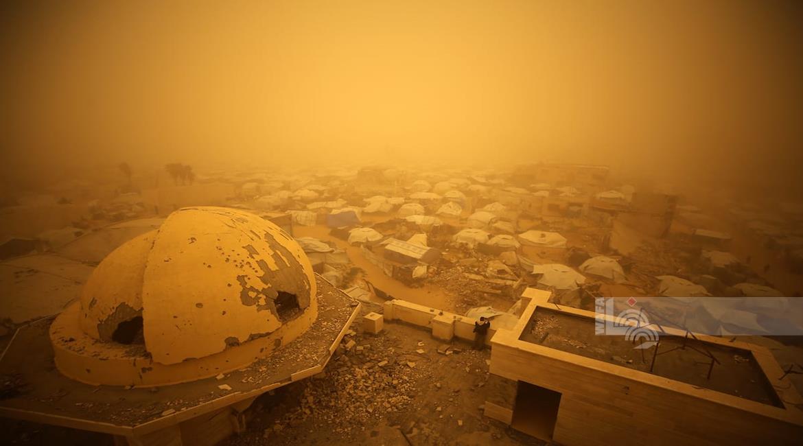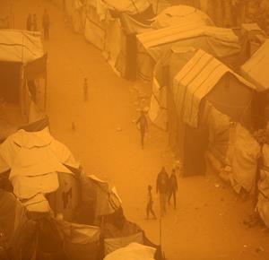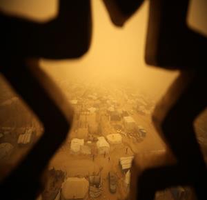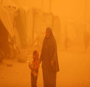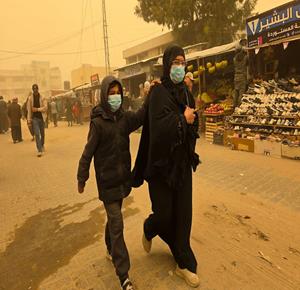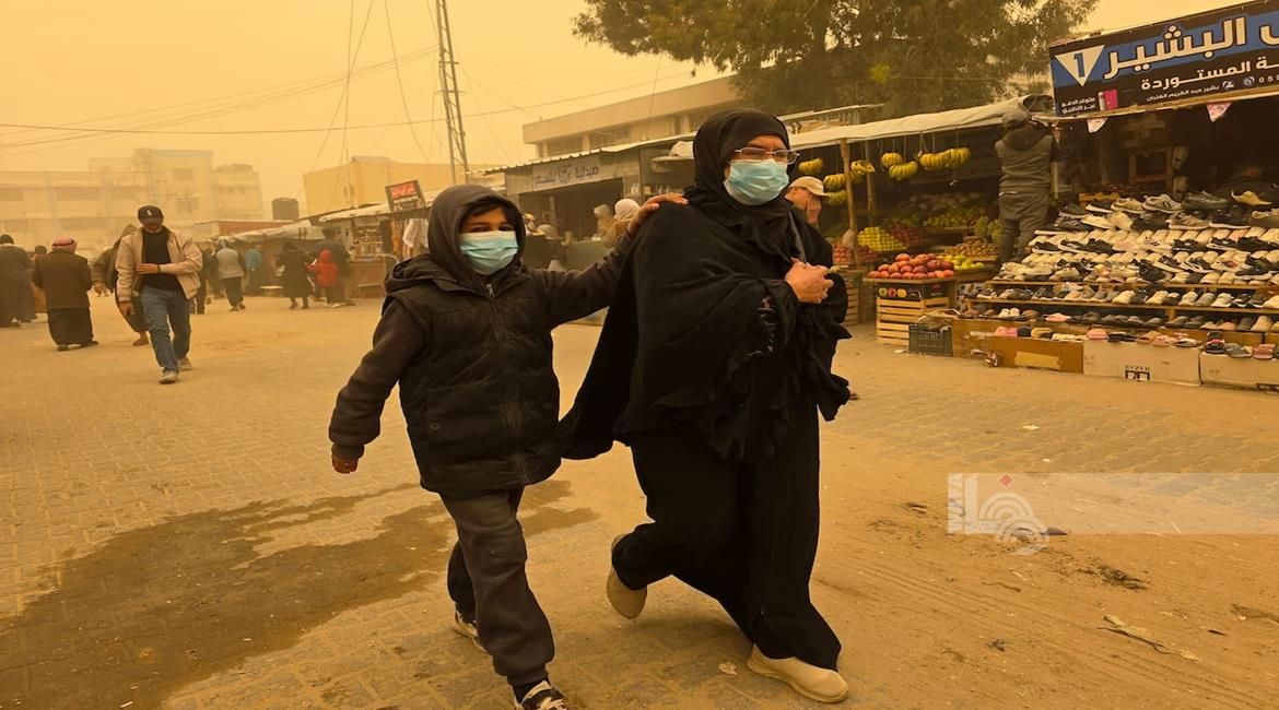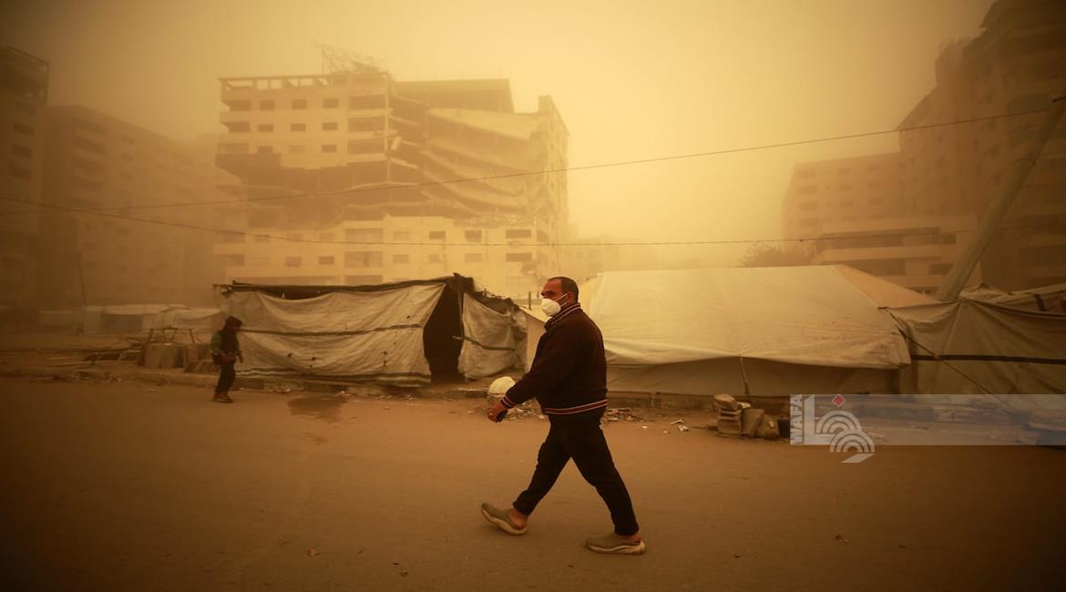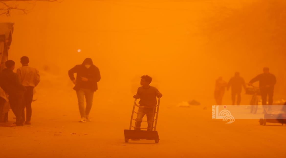 غزة - مواطنون يسيرون وسط عاصفة رملية في مخيم للنازحين بخان يونس جنوب قطاع غزة