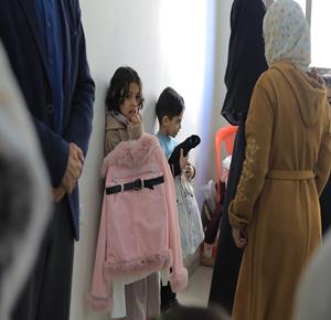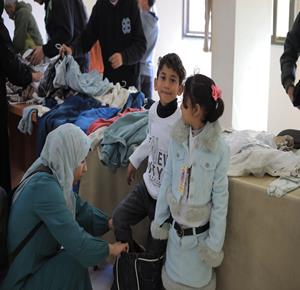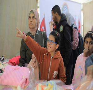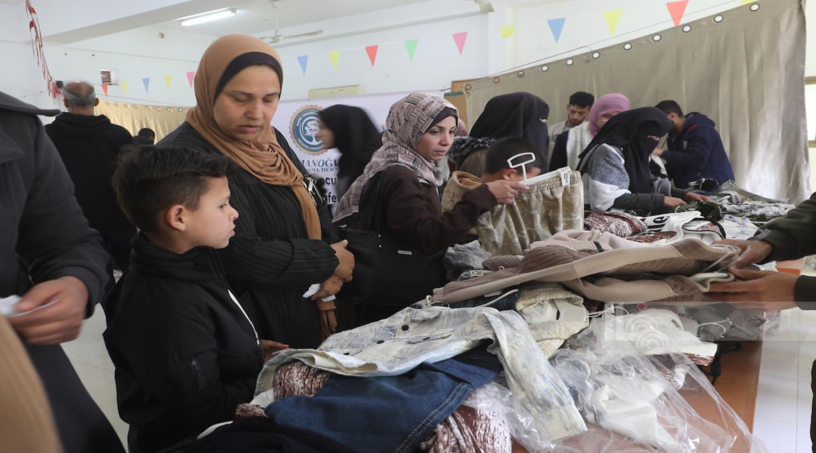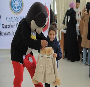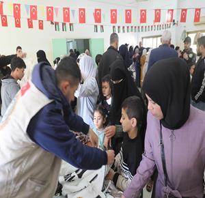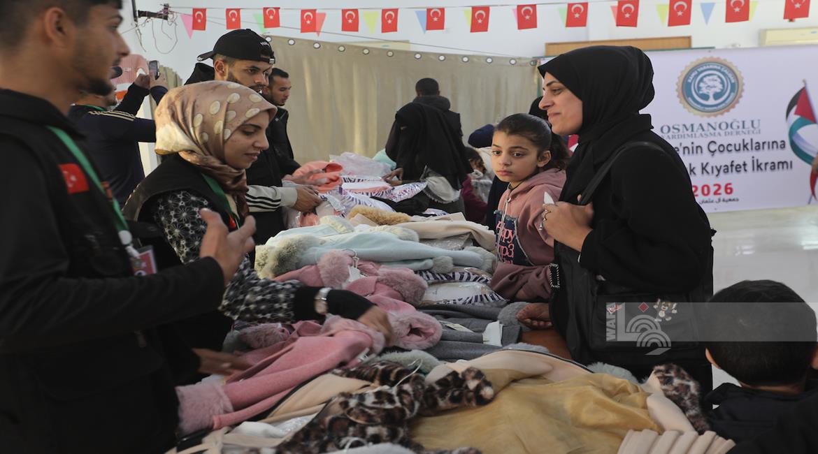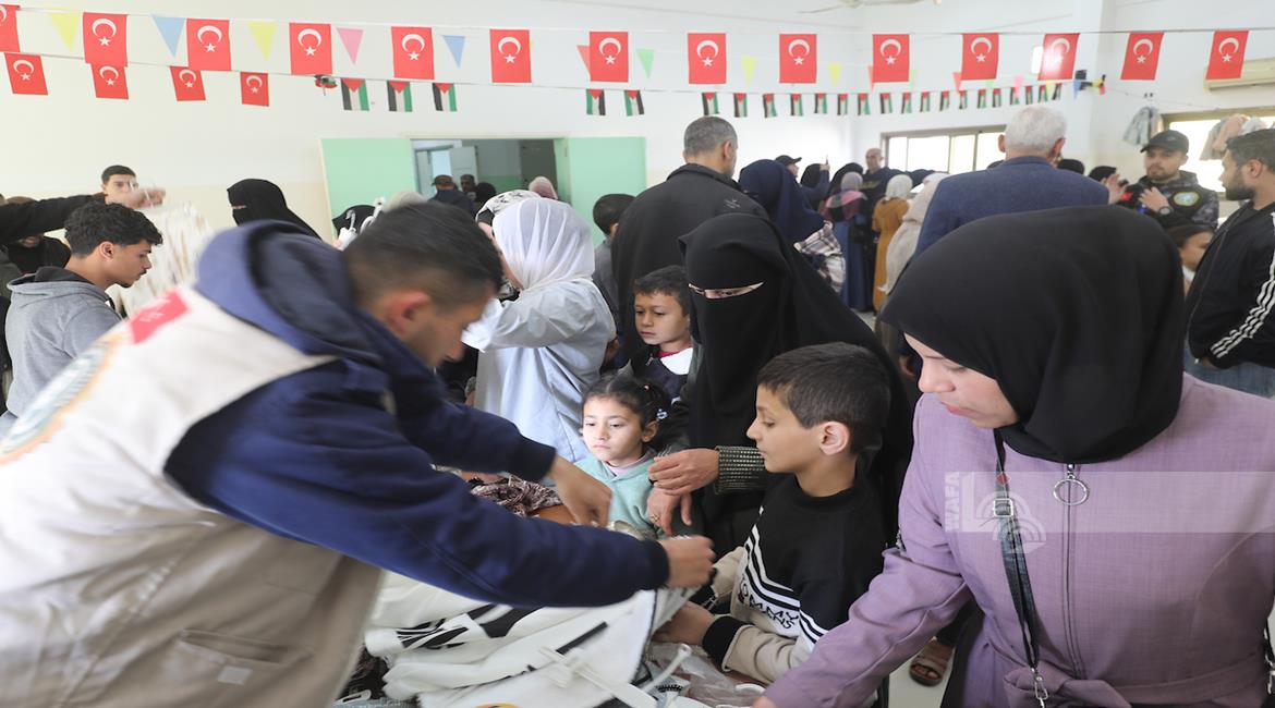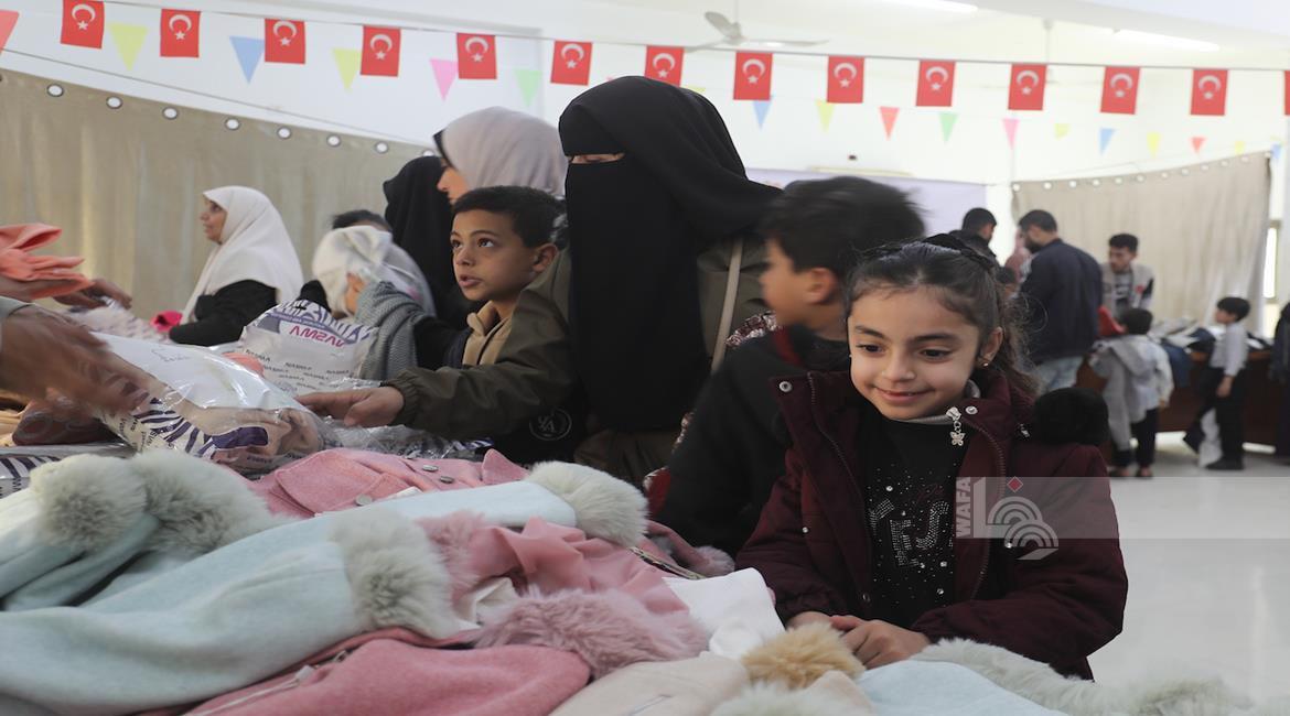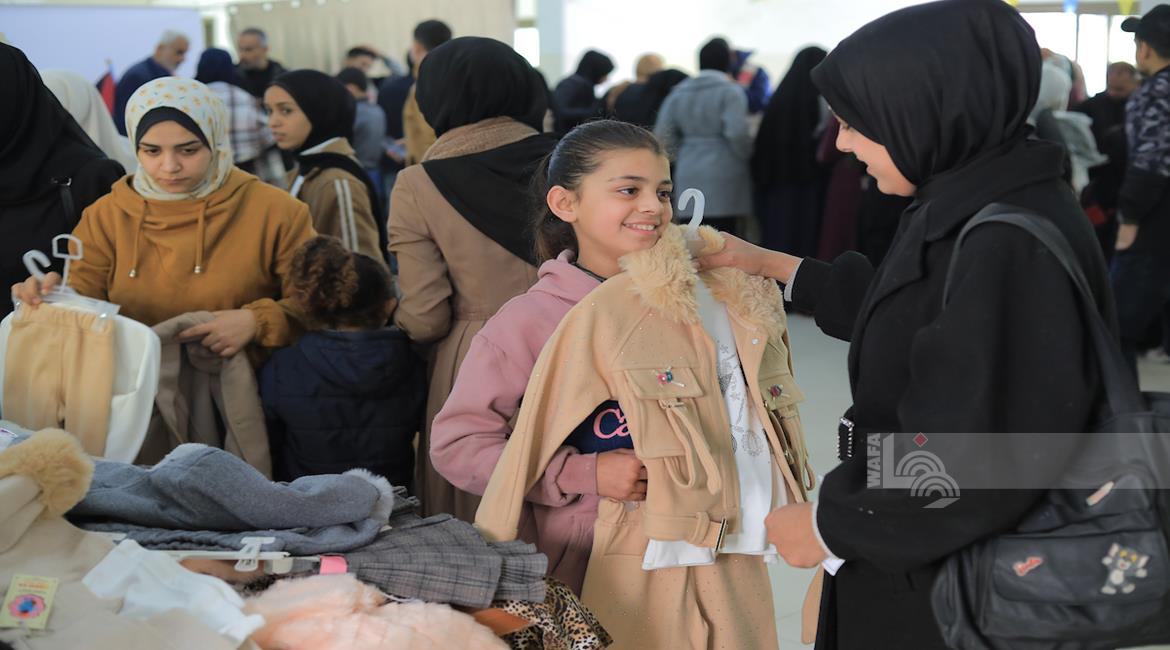 غزة - توزيع ملابس العيد على الأطفال الأيتام الذين فقدوا آباءهم خلال الحرب، بدعم من إحدى المنظمات الخيرية، في مخيم النصيرات للاجئين وسط قطاع غزة