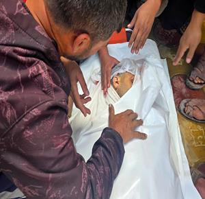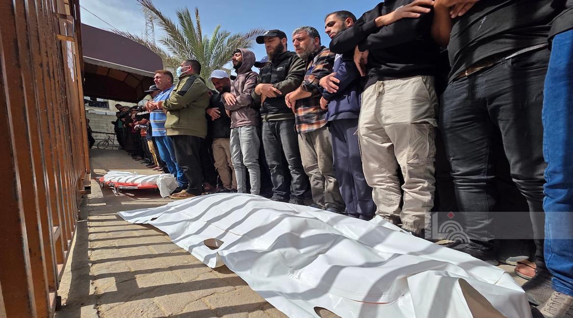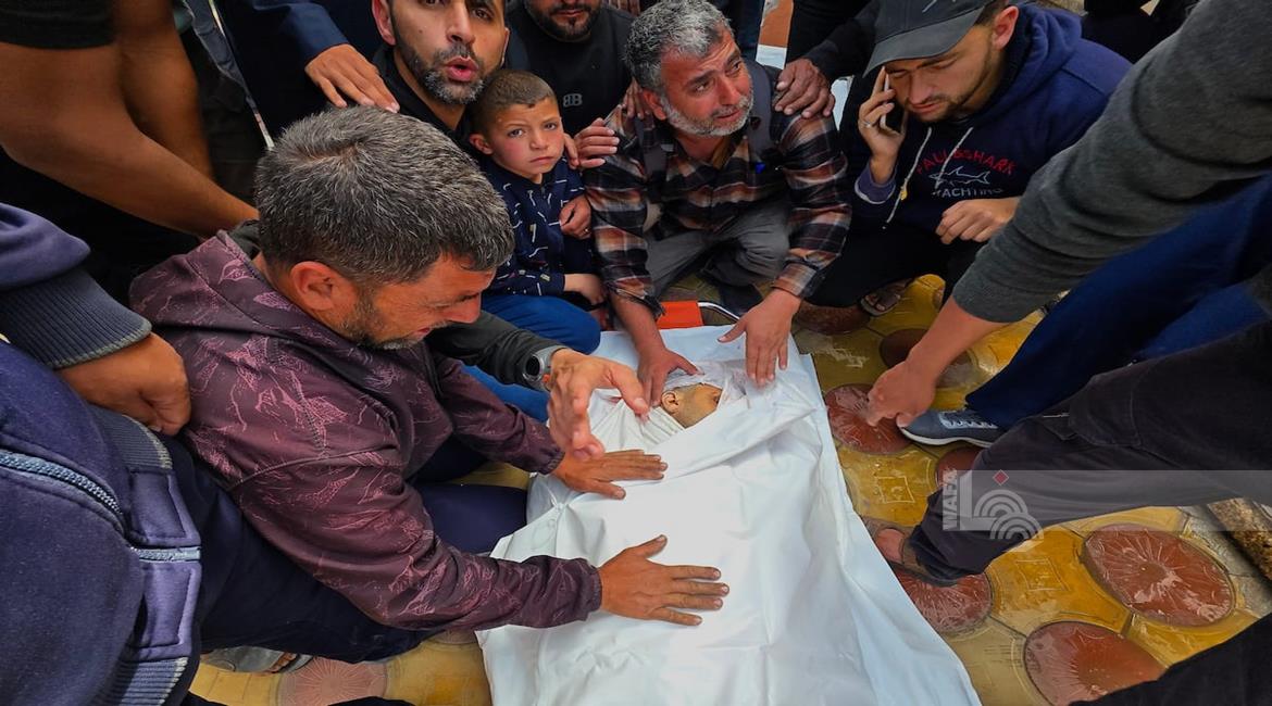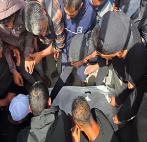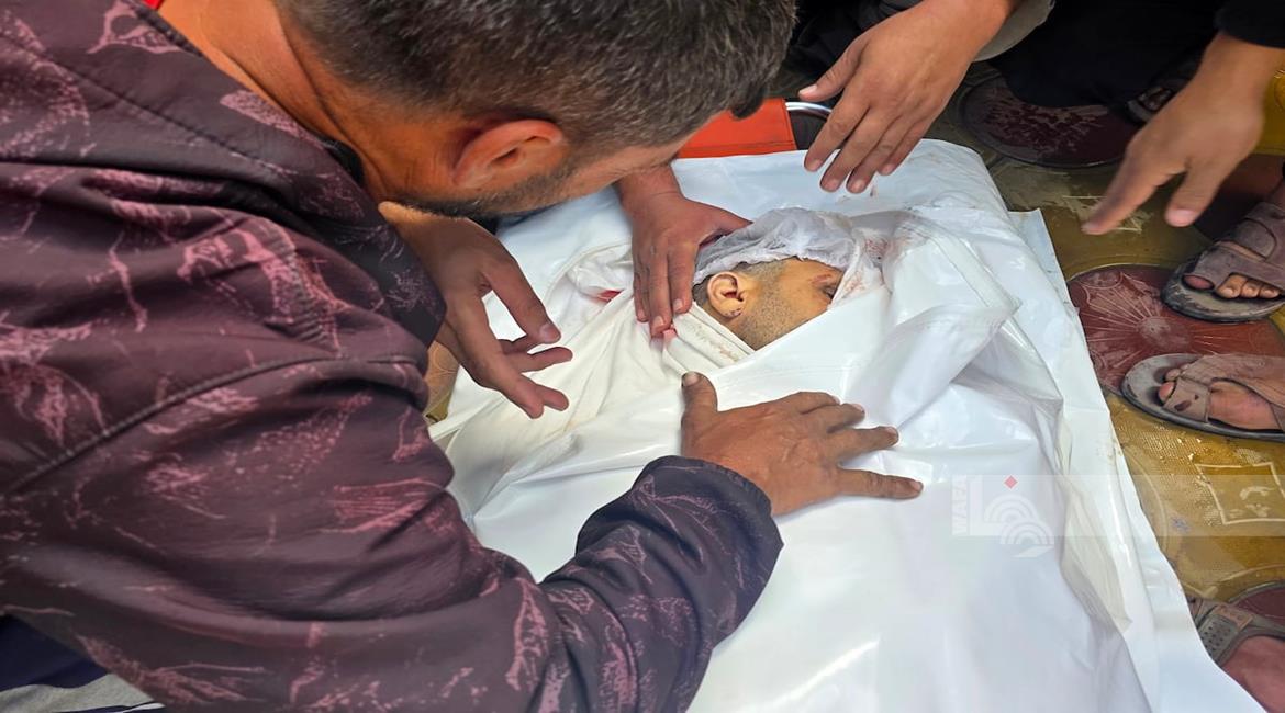 غزة - مواطنون يودعون جثمان الشهيد محمد أبو شهلا، في مستشفى ناصر، الذي استُشهد في غارة إسرائيلية في خان يونس جنوب قطاع غزة