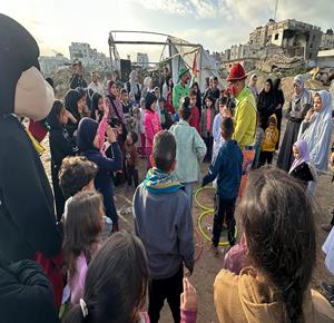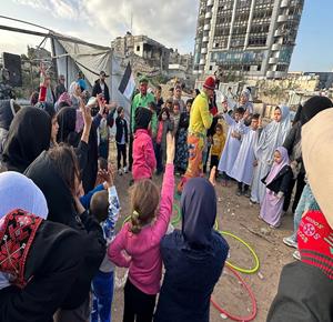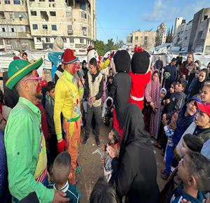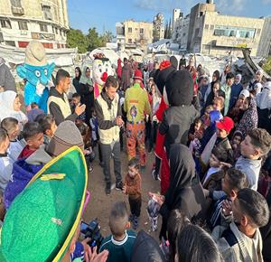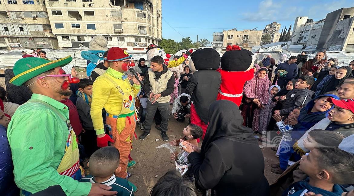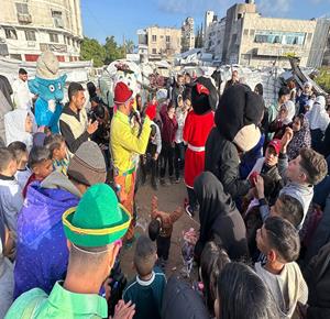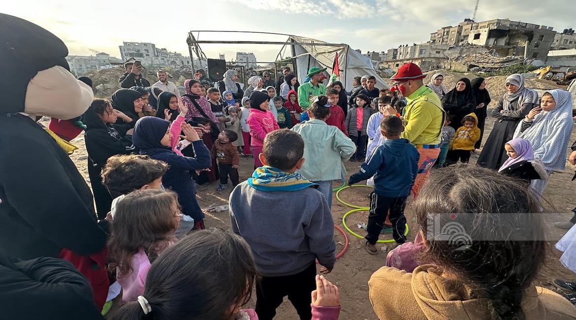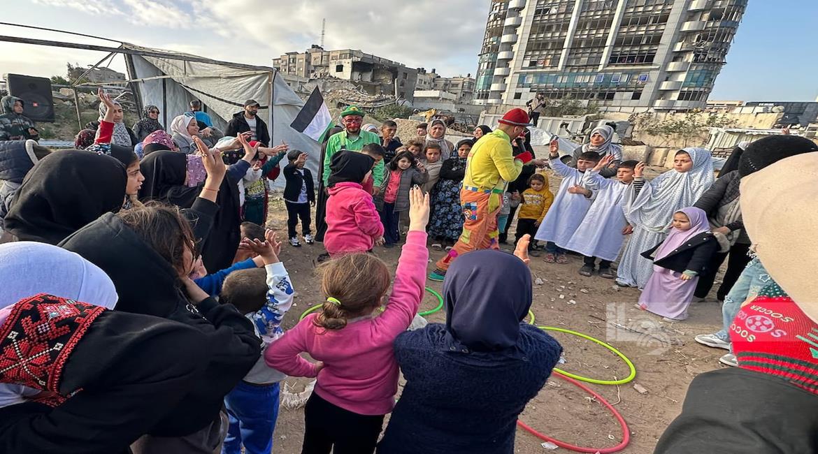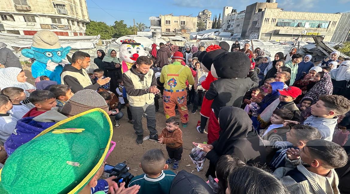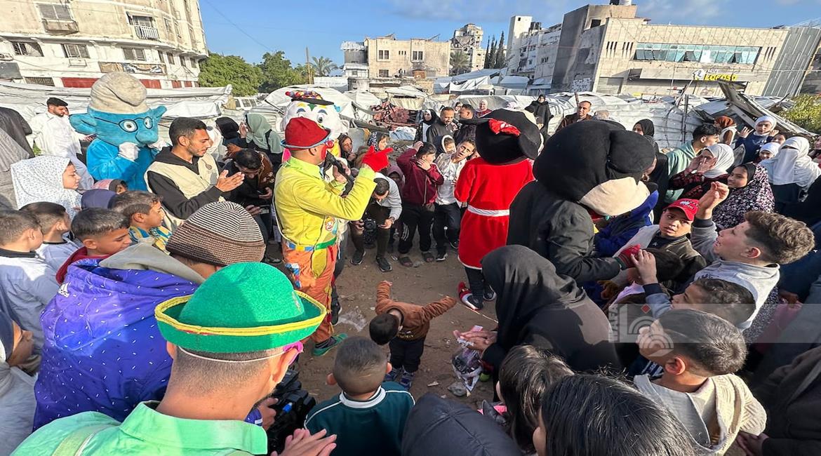 غزة - متطوعون ينظمون فعاليات ترفيهية لأطفال نازحين بين الخيام في مدينة غزة خلال أول أيام عيد الفطر