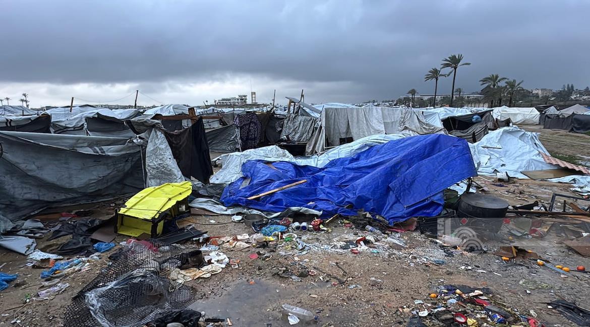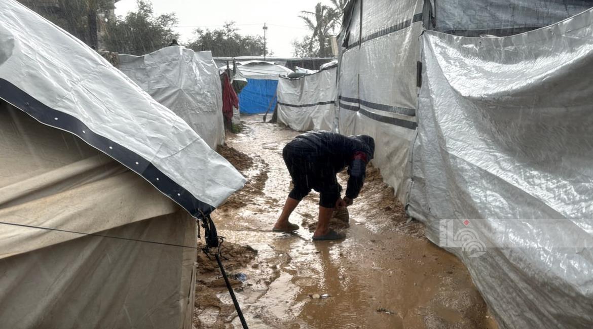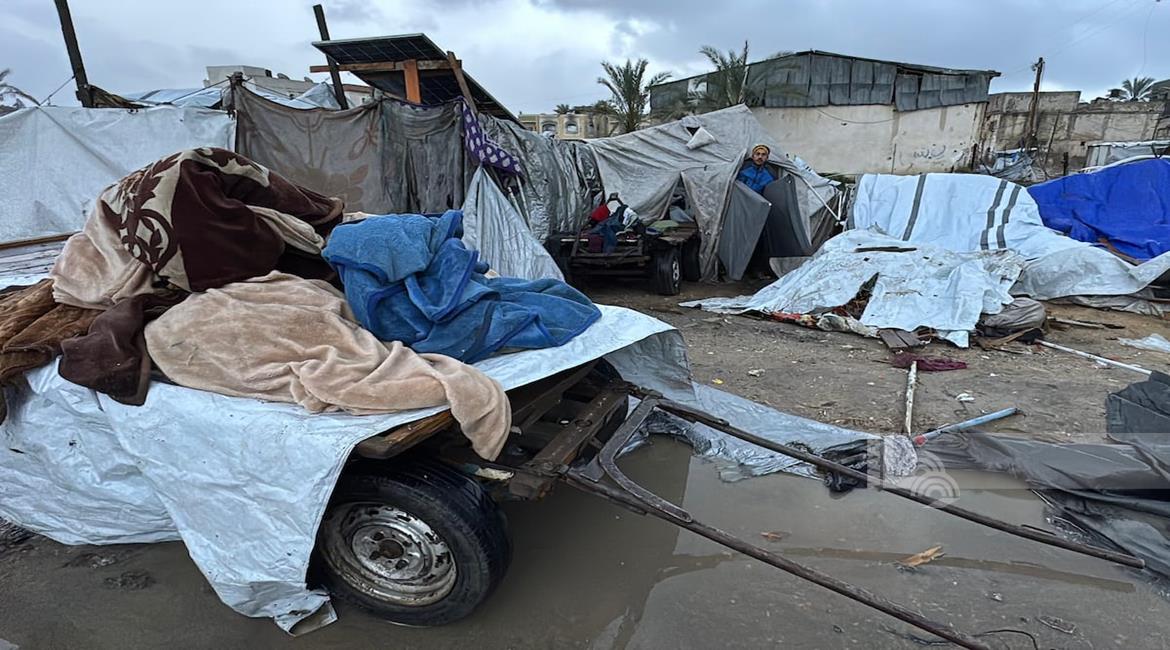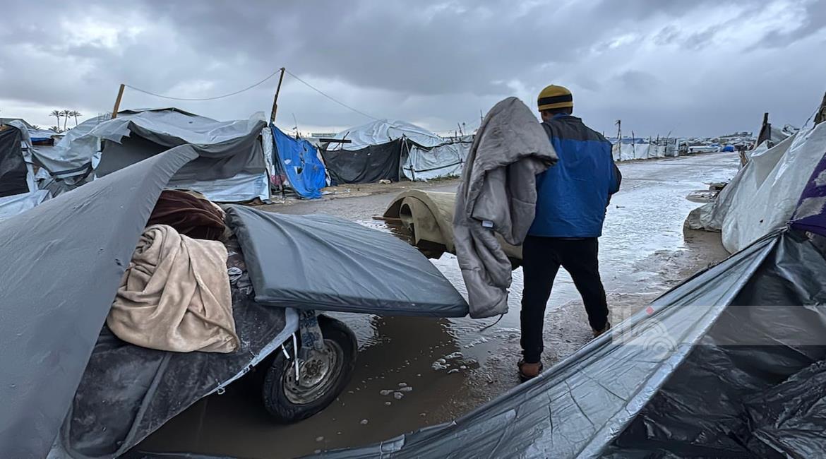 غزة - فلسطينيون نازحون في خيام مؤقتة يعانون من ظروف قاسية جراء البرد الشديد والأمطار الغزيرة، بعد أن مزقت غارات إسرائيلية خيامهم قبيل منخفض جوي، في دير البلح بوسط قطاع غزة