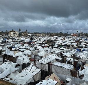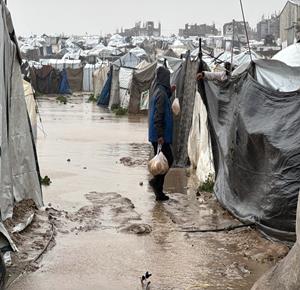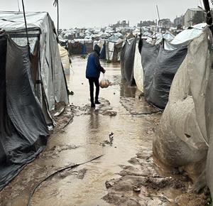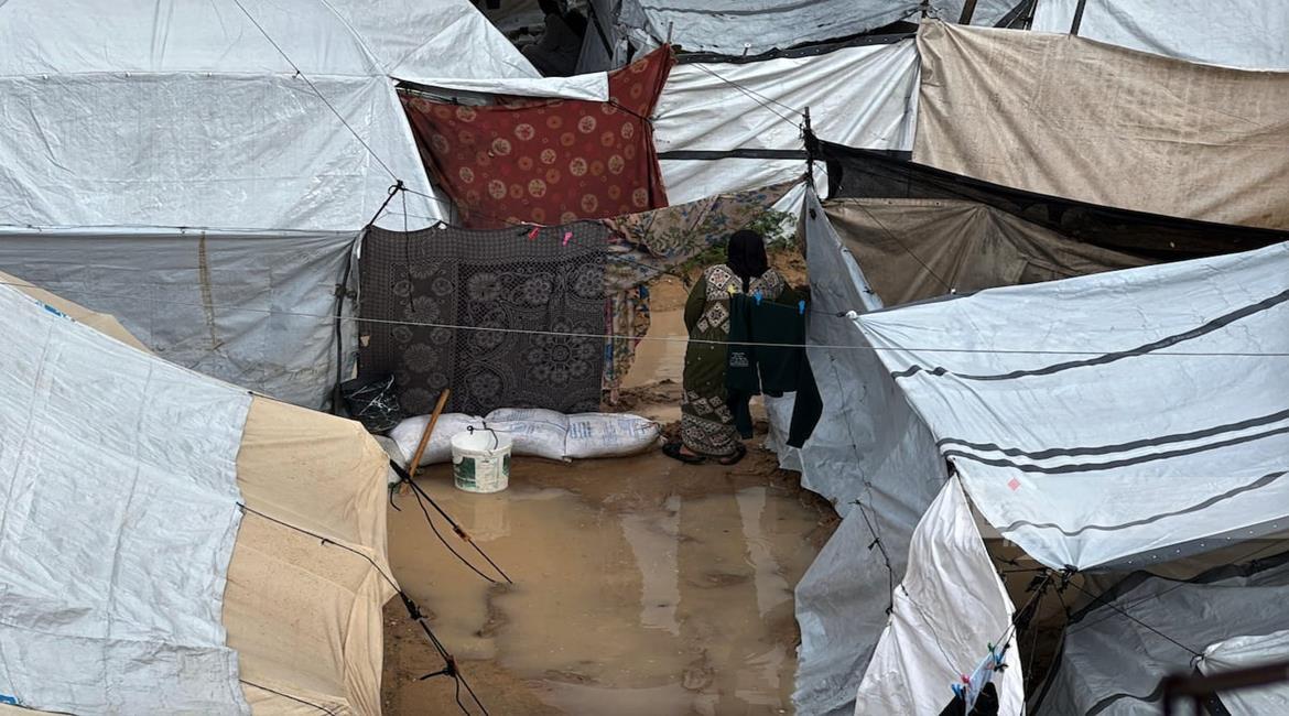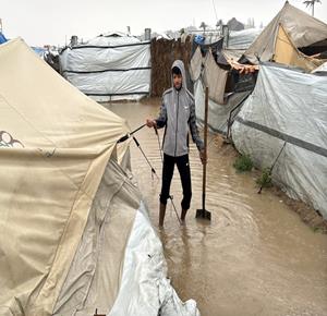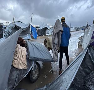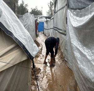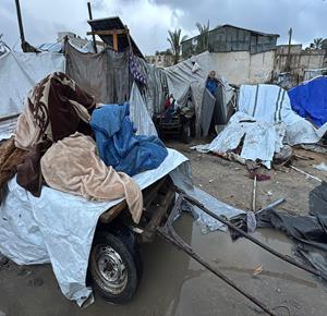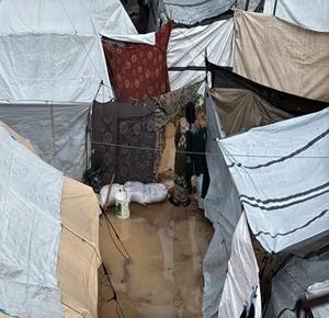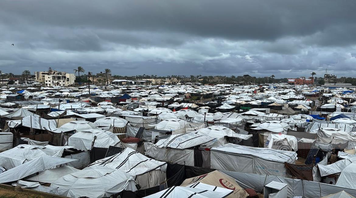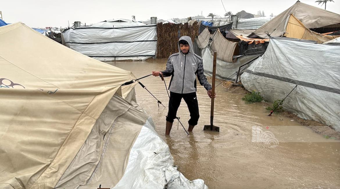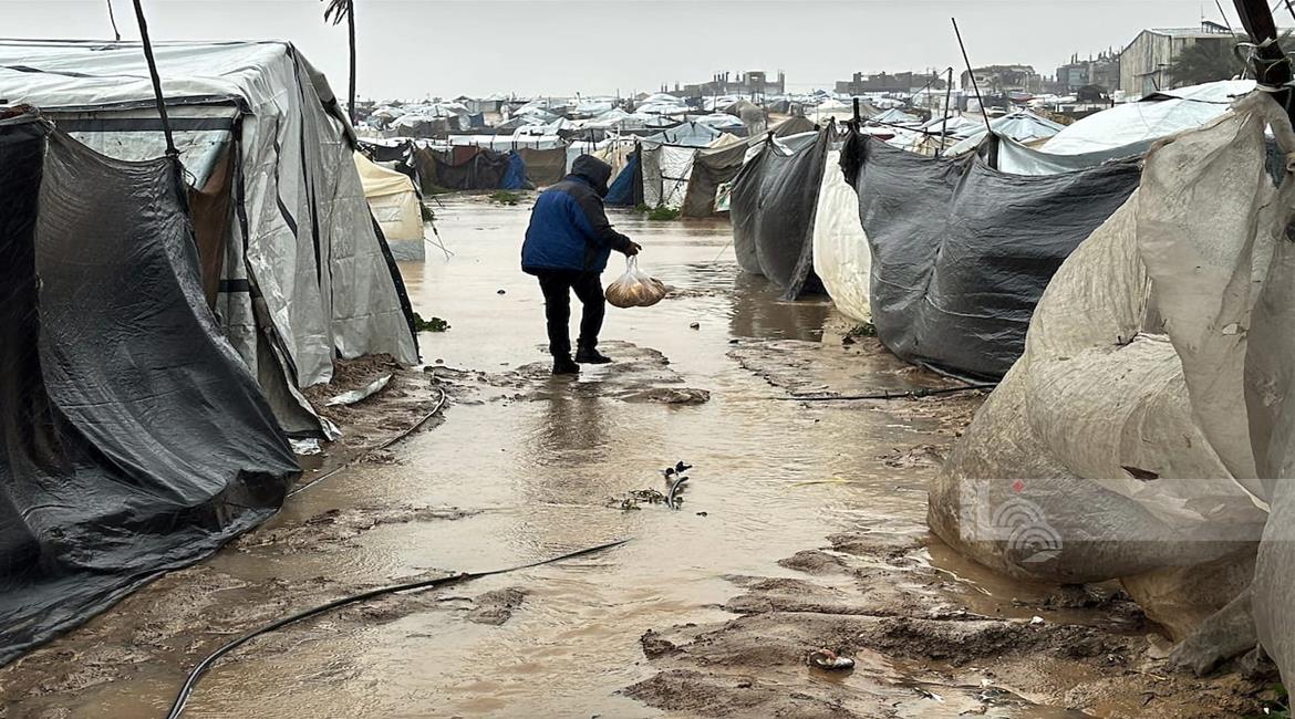 غزة - فلسطينيون نازحون في خيام مؤقتة يعانون من ظروف قاسية جراء البرد الشديد والأمطار الغزيرة، بعد أن مزقت غارات إسرائيلية خيامهم قبيل منخفض جوي، في دير البلح بوسط قطاع غزة