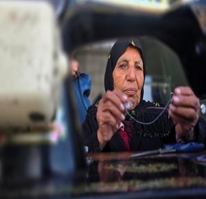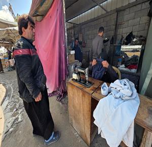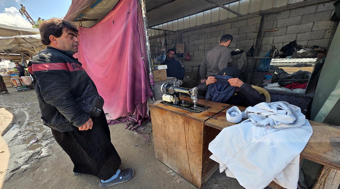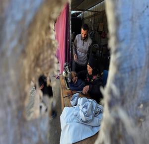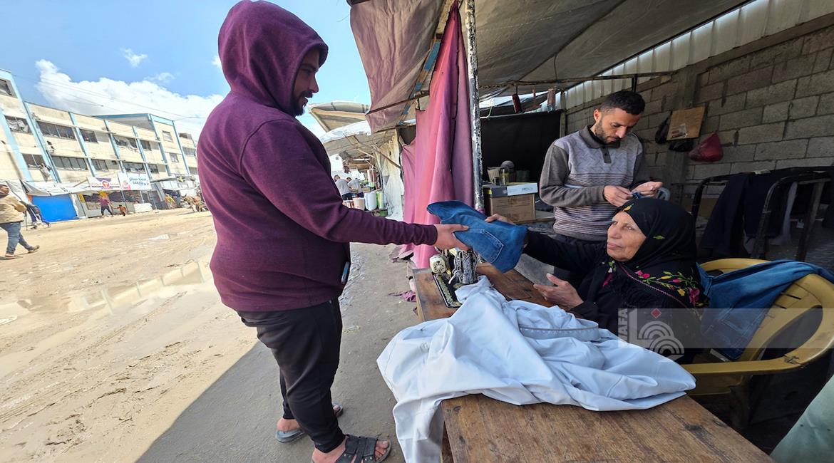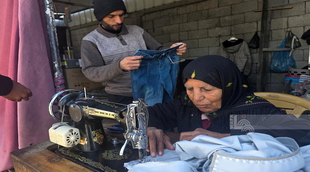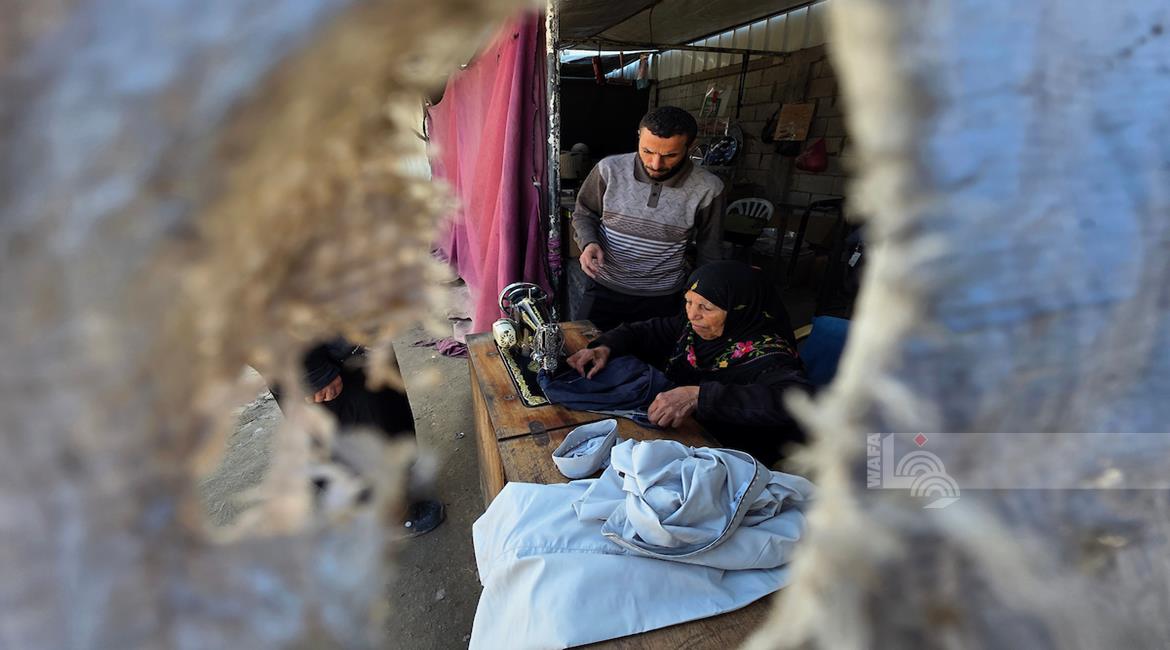 غزة - المسنّة نغين بن عيسى (77 عاما) تواصل حياكة الملابس داخل خيمة في خان يونس لتأمين مصدر دخل بعد أن فقدت كل ما تملك جراء الحرب