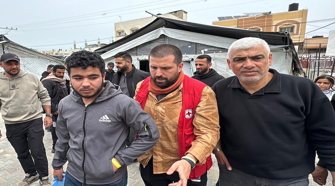 وصول الأسير محمود أبو وردة إلى مستشفى شهداء الأقصى في دير البلح على متن مركبات اللجنة الدولية للصليب الأحمر، عقب الإفراج عنه من قبل جيش الاحتلال.
