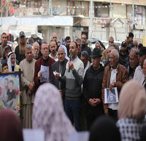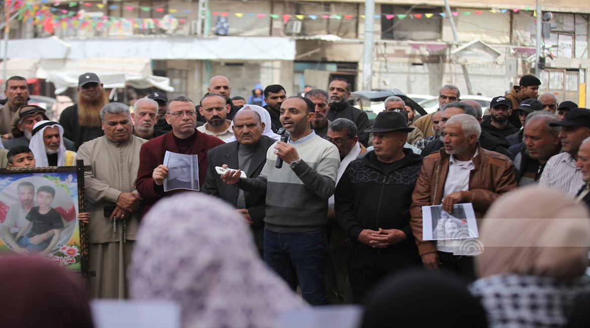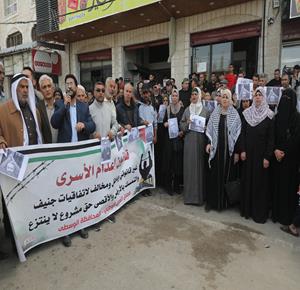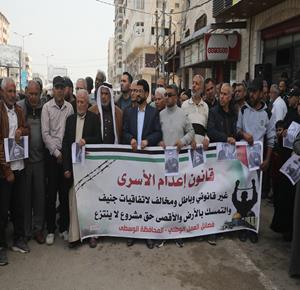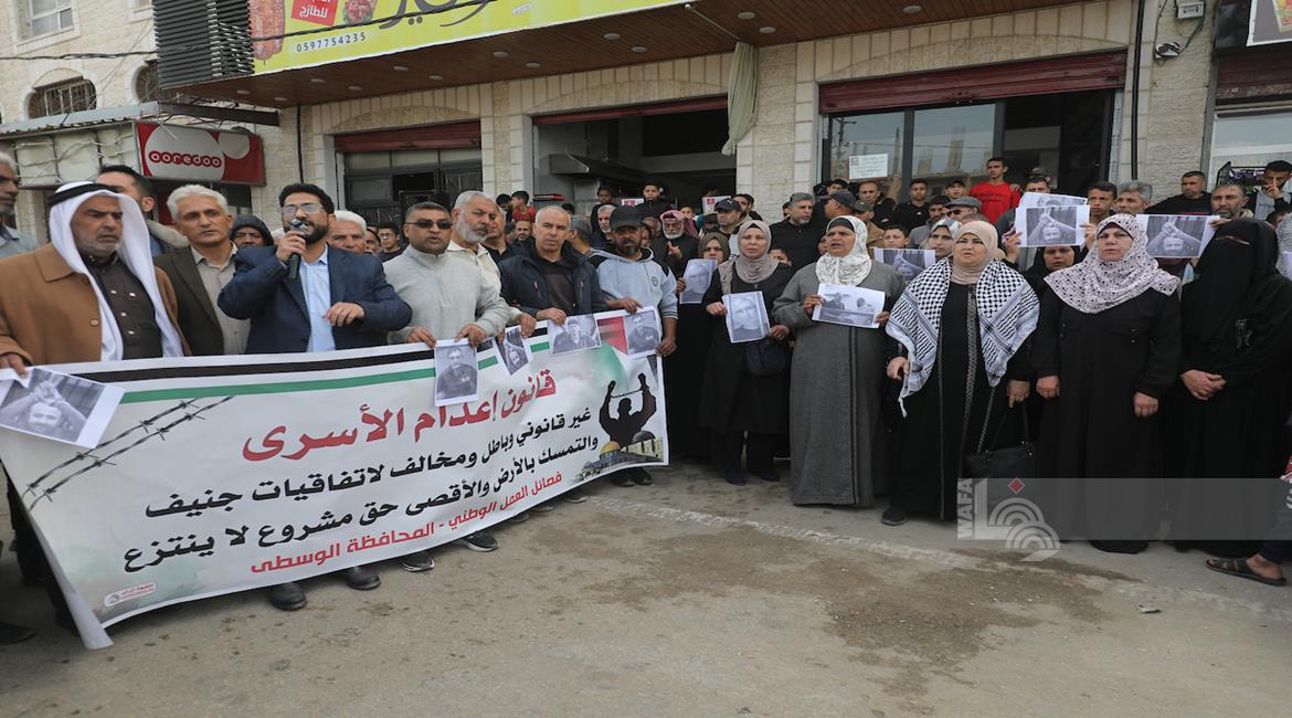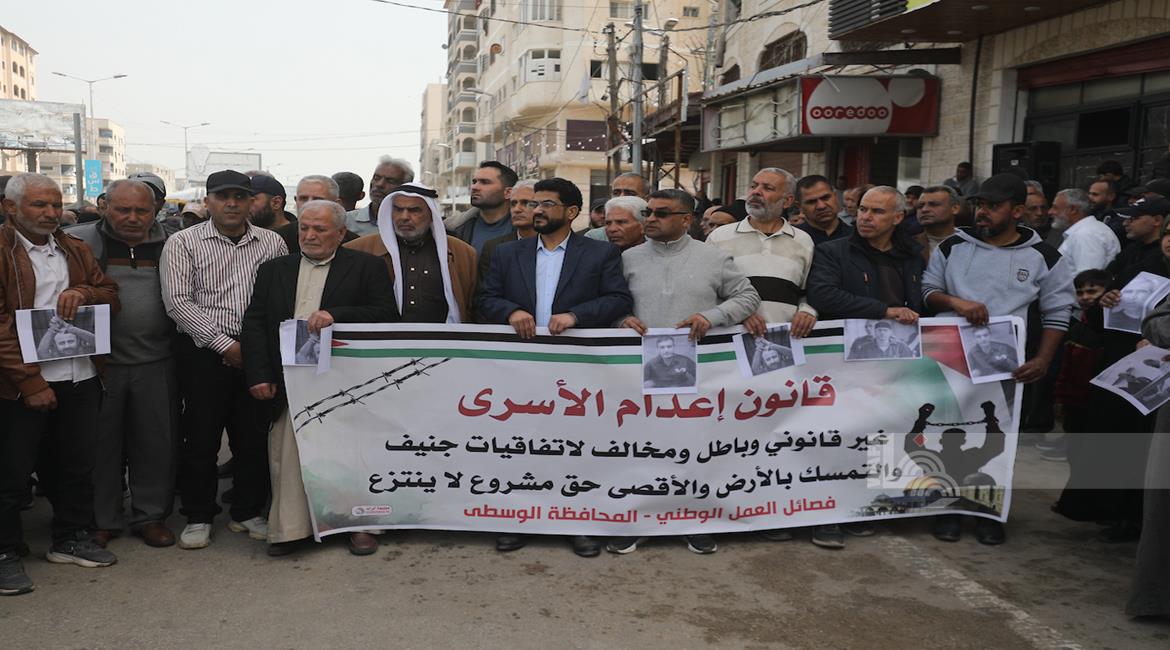 غزة - مواطنون يشاركون في وقفة احتجاجية عند مدخل مخيم النصيرات وسط قطاع غزة، رفضا لإقرار قانون إسرائيلي يقضي بعقوبة الإعدام بحق الأسرى الفلسطينيين.