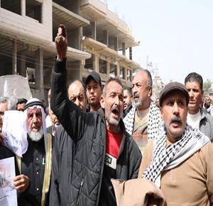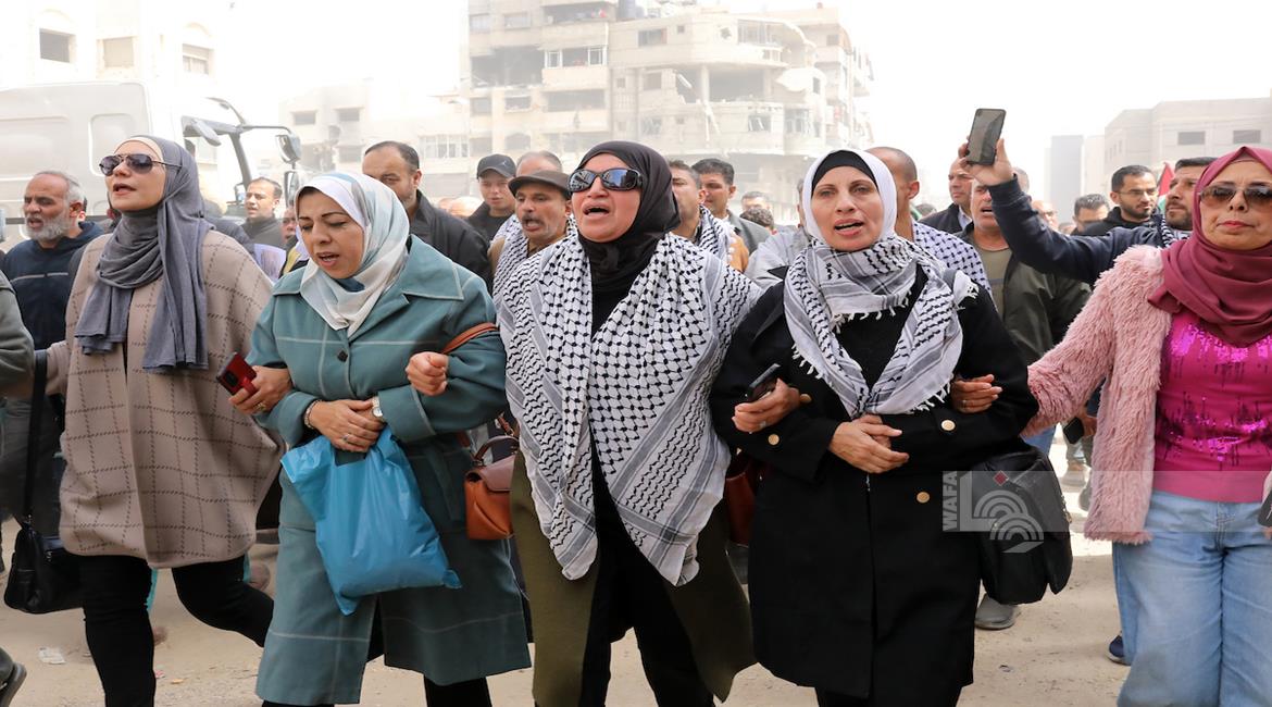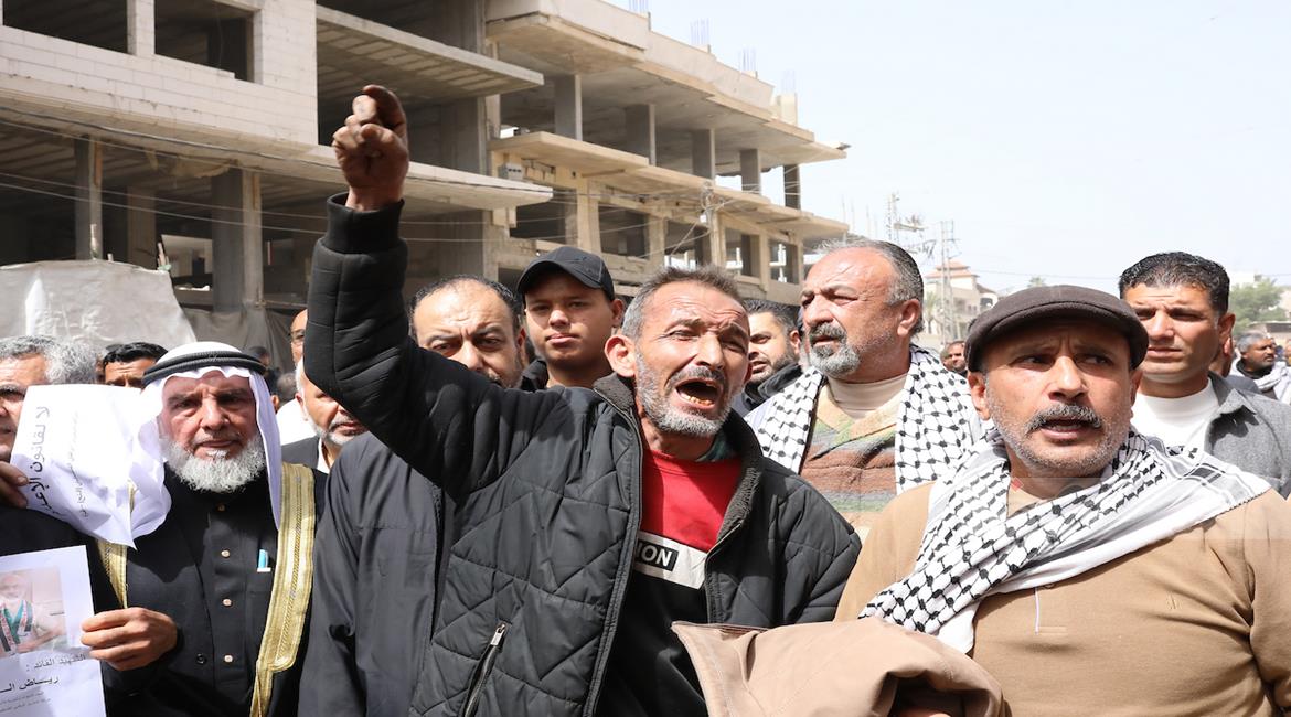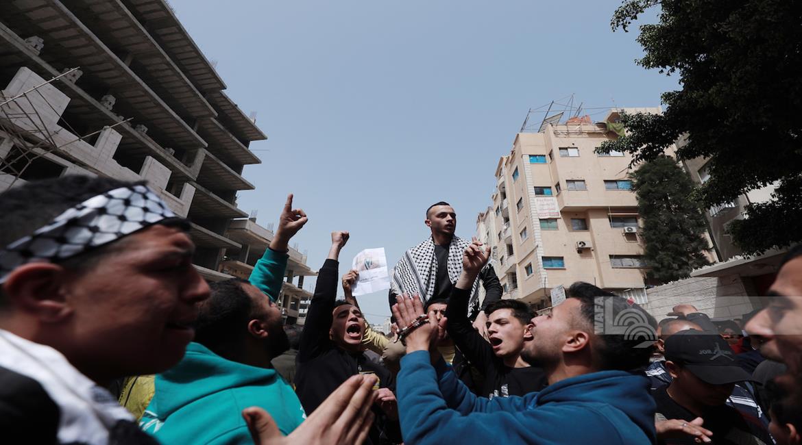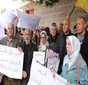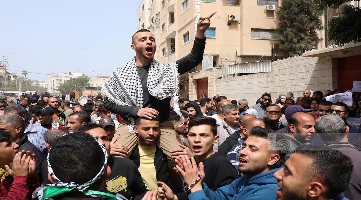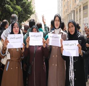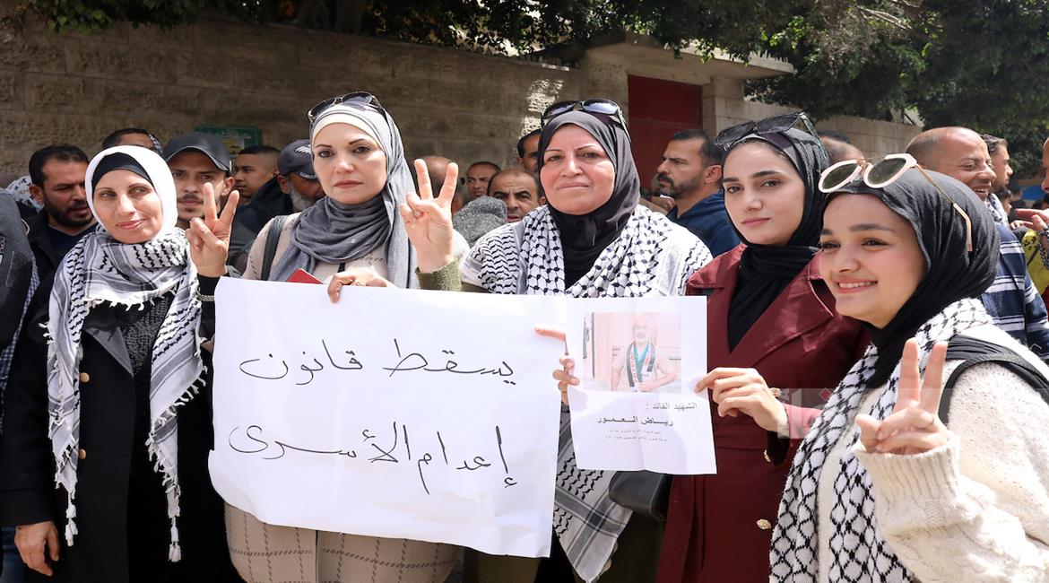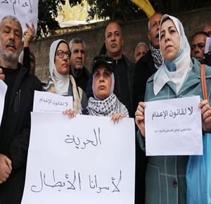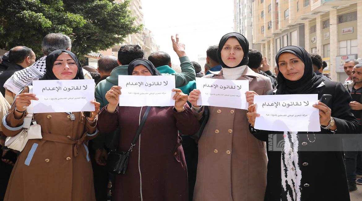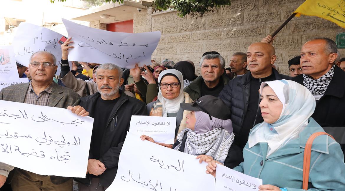 مواطنون يشاركون في وقفة احتجاجية عند مدخل مخيم النصيرات وسط قطاع غزة، رفضا لإقرار قانون إسرائيلي يقضي بعقوبة الإعدام بحق الأسرى الفلسطينيين.