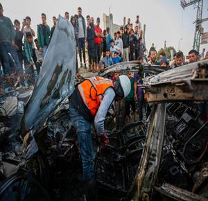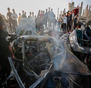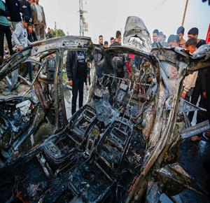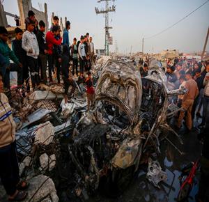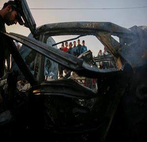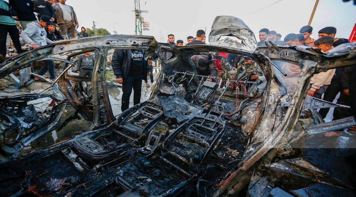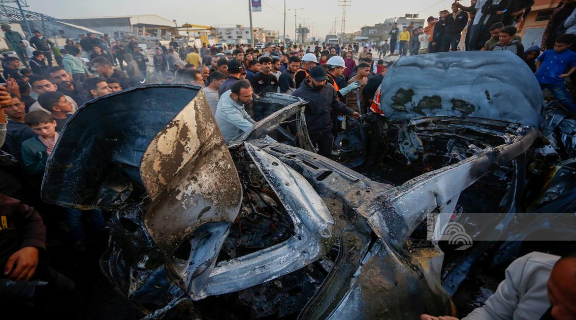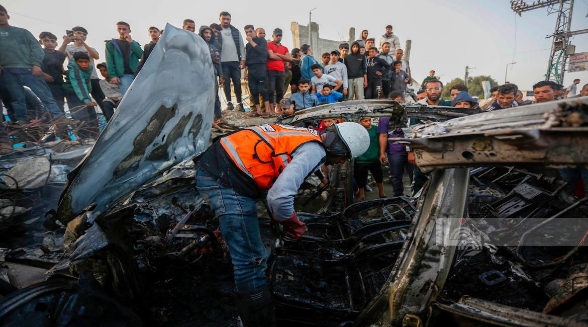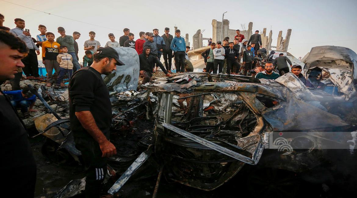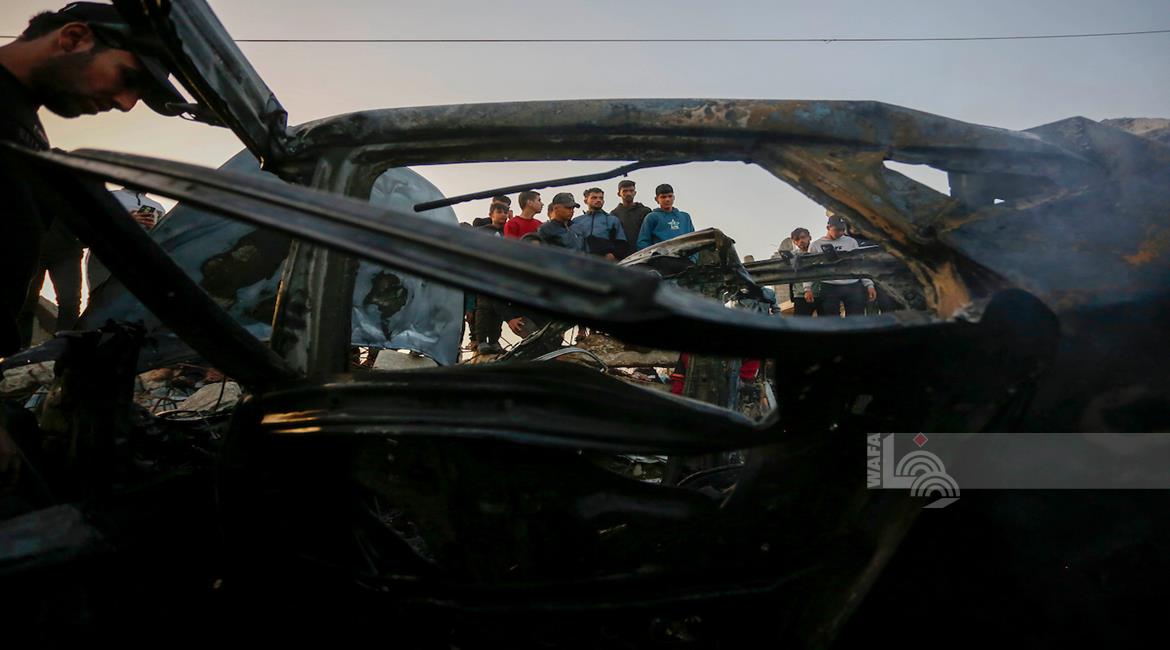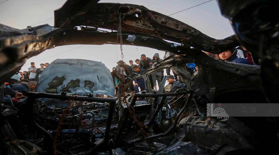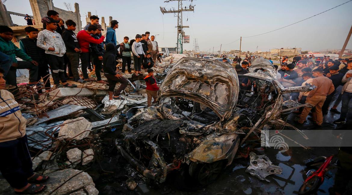 غزة - مواطنون يتفقدون مركبة على شارع صلاح الدين قرب مدخل مخيم المغازي استهدفها الاحتلال ما أسفر عن استشهاد شخص وإصابة آخرين