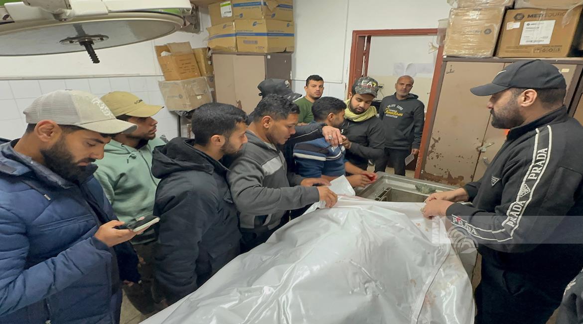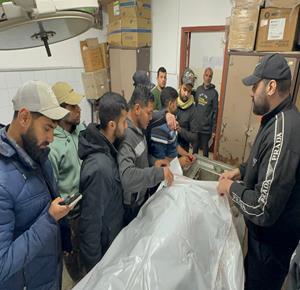 مواطنون يتفقدون مركبة على شارع صلاح الدين قرب مدخل مخيم المغازي استهدفها الاحتلال ما أسفر عن استشهاد شخص وإصابة آخرين