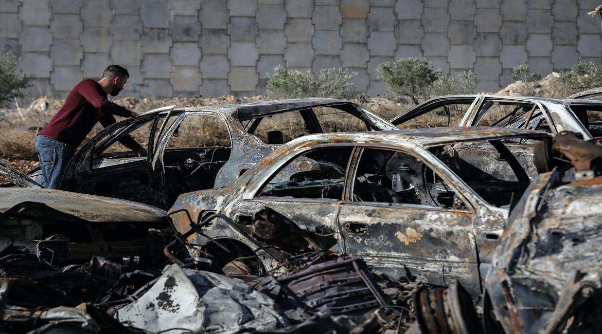 مواطنون يتفقدون أثر الحرائق التي أشعلها المستعمرون ليلة أمس في مشطب للسيارات في حوارة جنوب نابلس