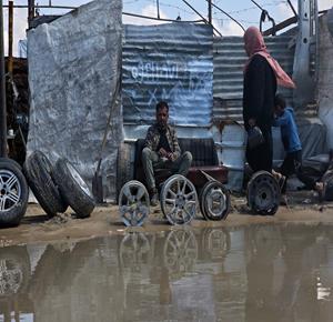 نازحون يقيمون في خيام مهترئة في مخيم النصيرات يواجهون كارثة بيئية، حيث تتراكم النفايات وتنتشر المياه العادمة حول أماكن إقامتهم وسط مخاوف من تفشي الأمراض