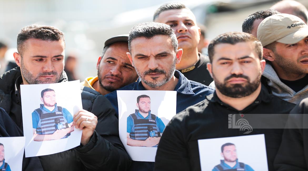 مواطنون يودعون جثمان الصحفي محمد وشاح، مراسل قناة الجزيرة، الذي ارتقى جراء غارة إسرائيلية استهدفته على شارع الرشيد غرب مدينة غزة